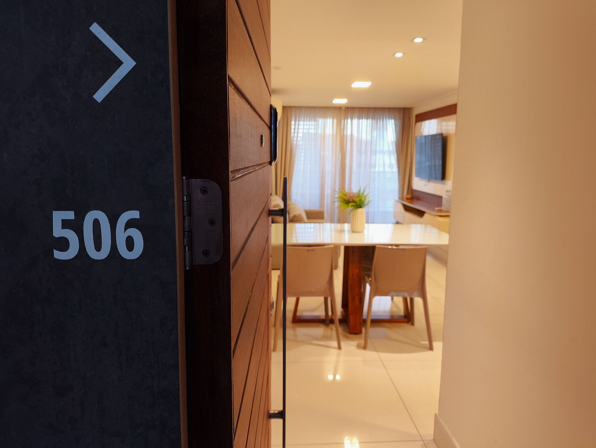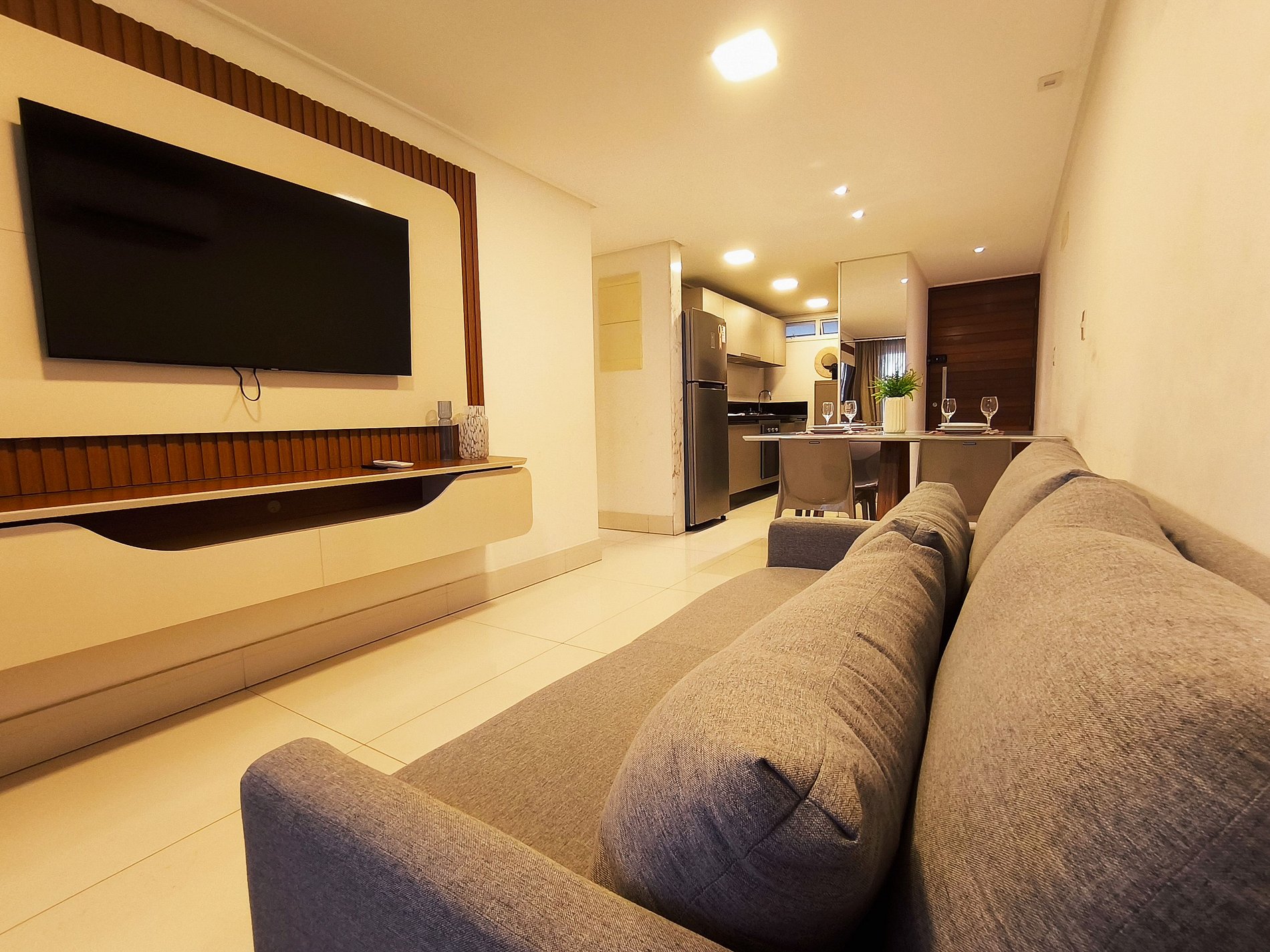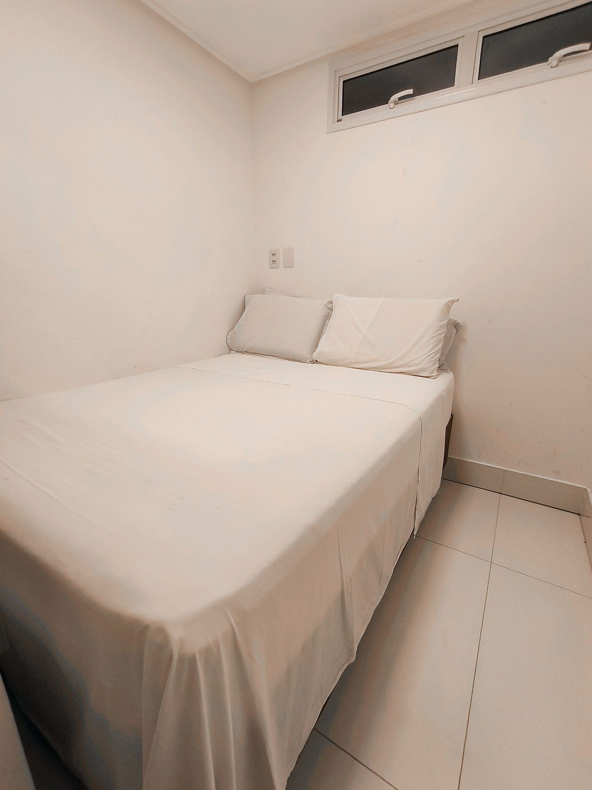 O apartamento possui dois quartos, sendo uma suíte com uma cama super king, escrivaninha para trabalho, SmarTv e ar condicionado. Sala de estar com sofá cama, smart tv e outro ar, mesa com cinco cadeiras, cozinha completa com talheres, potes e panelas. Há um segundo banheiro: o social. Por fim, um segundo quarto com cama de casal e ar condicionado.