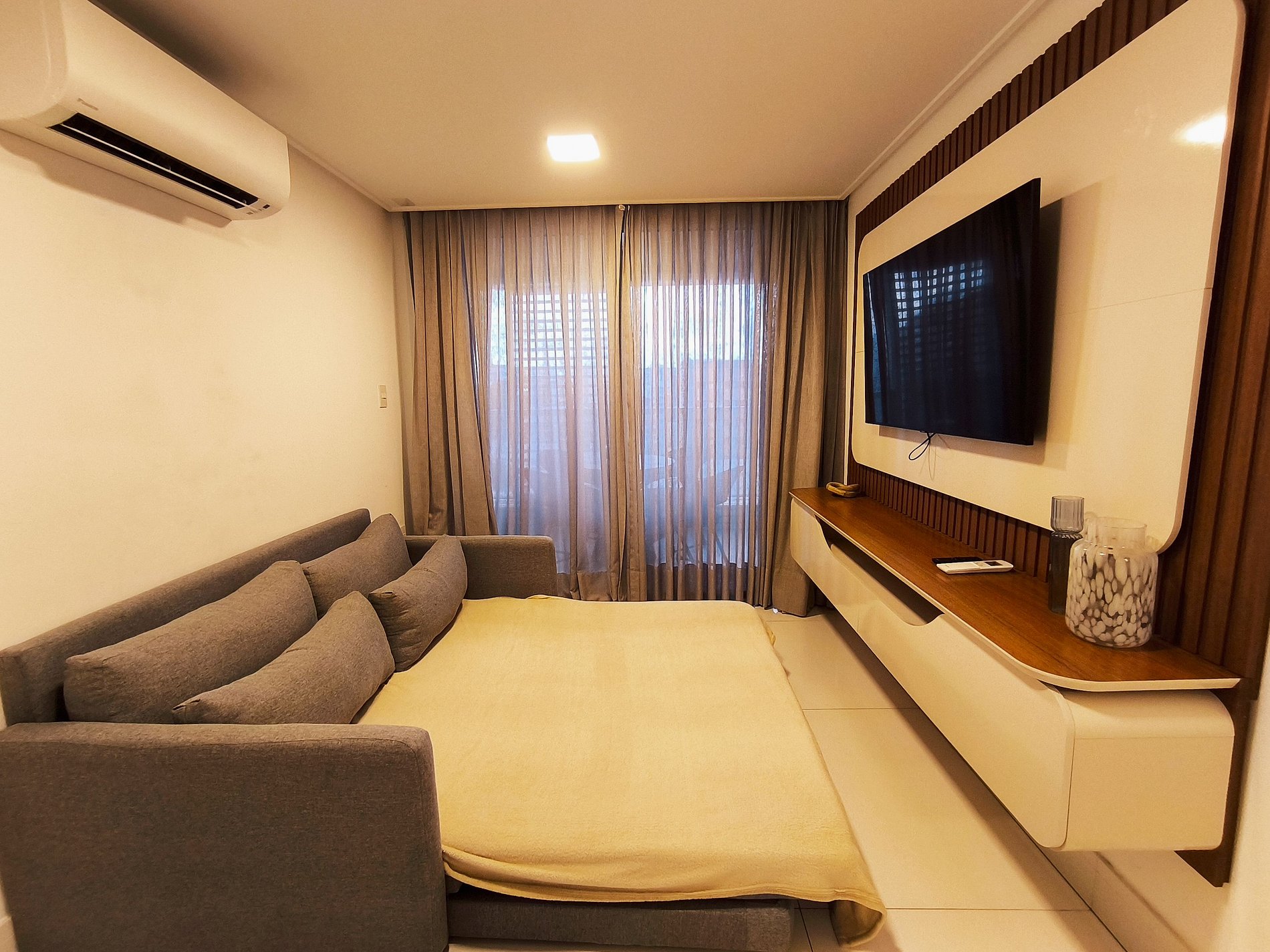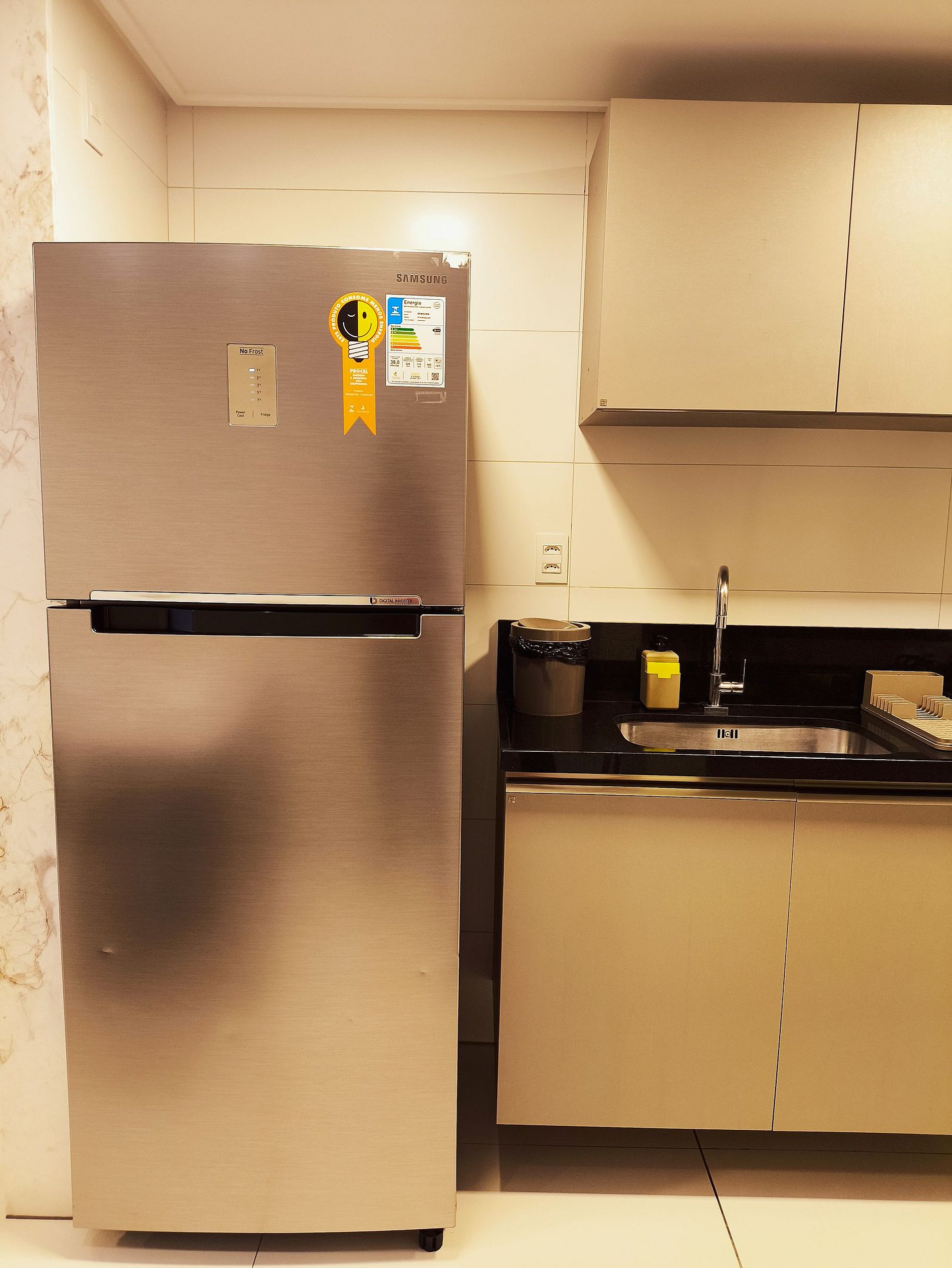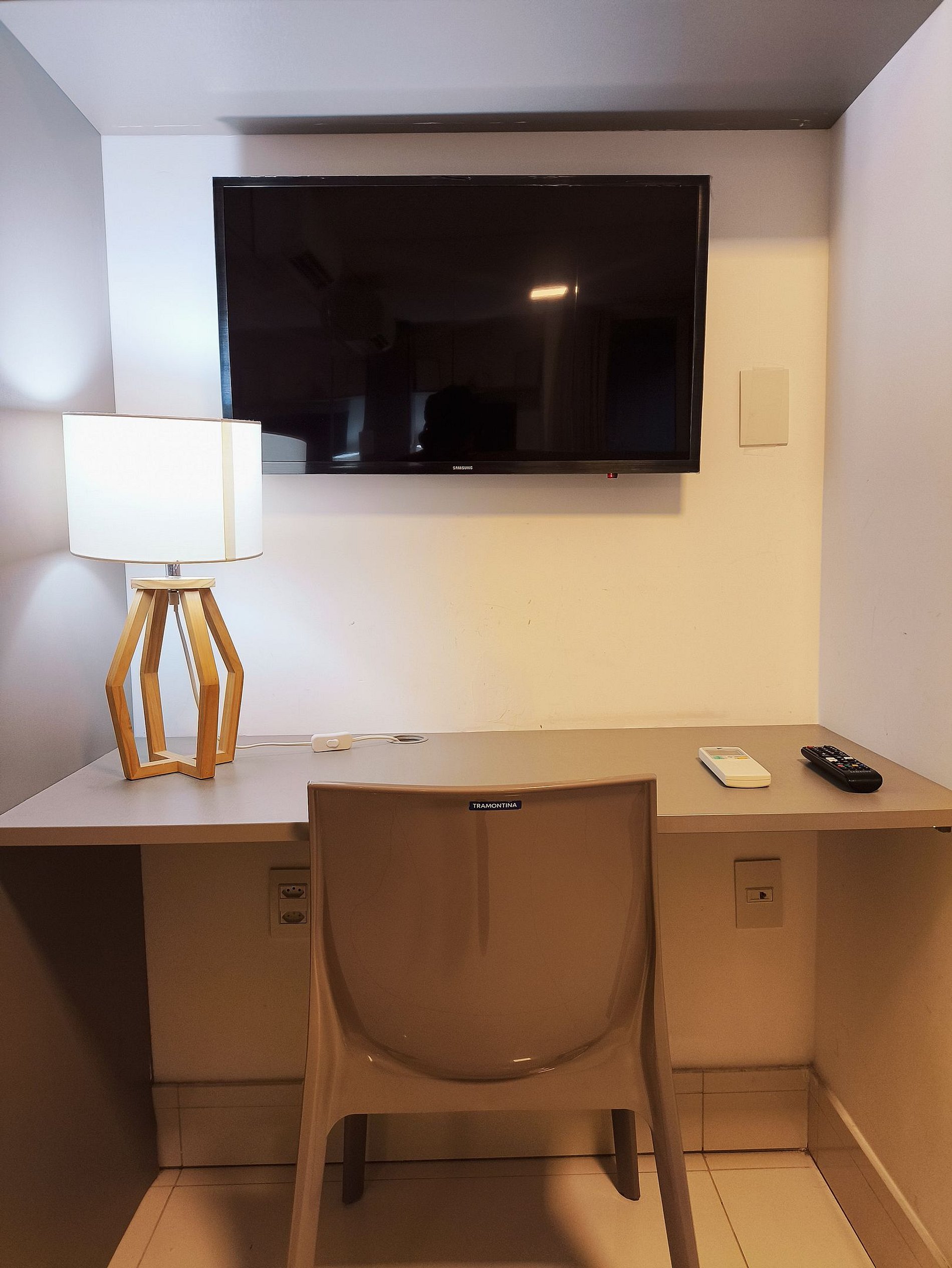 O apartamento possui dois quartos, sendo uma suíte com uma cama super king, escrivaninha para trabalho, SmarTv e ar condicionado. Sala de estar com sofá cama, smart tv e outro ar, mesa com cinco cadeiras, cozinha completa com talheres, potes e panelas. Há um segundo banheiro: o social. Por fim, um segundo quarto com cama de casal e ar condicionado.