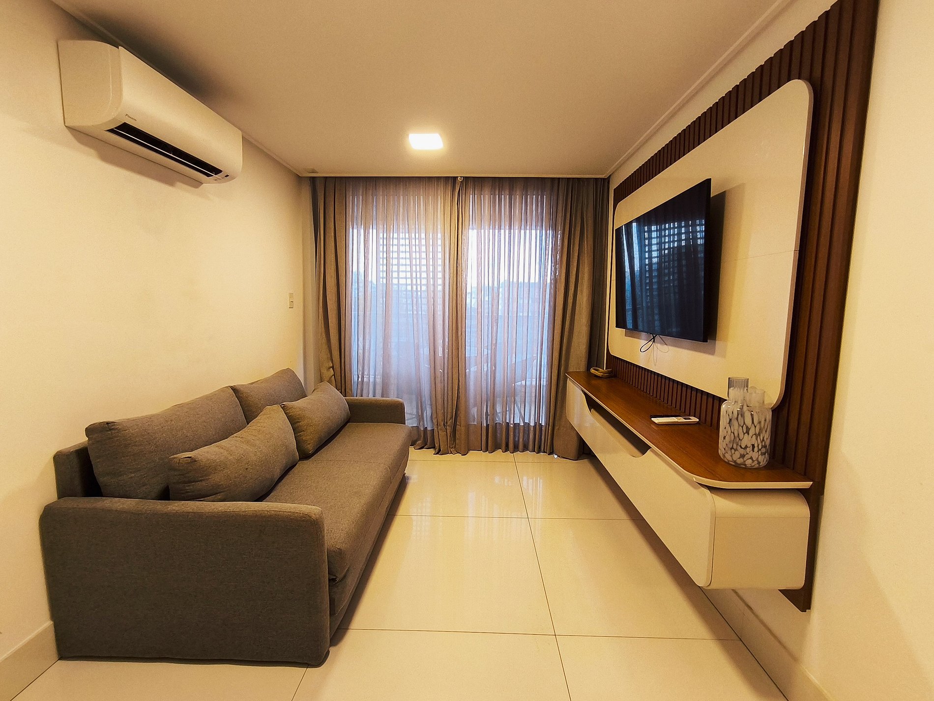 O apartamento possui dois quartos, sendo uma suíte com uma cama super king, escrivaninha para trabalho, SmarTv e ar condicionado. Sala de estar com sofá cama, smart tv e outro ar, mesa com cinco cadeiras, cozinha completa com talheres, potes e panelas. Há um segundo banheiro: o social. Por fim, um segundo quarto com cama de casal e ar condicionado.