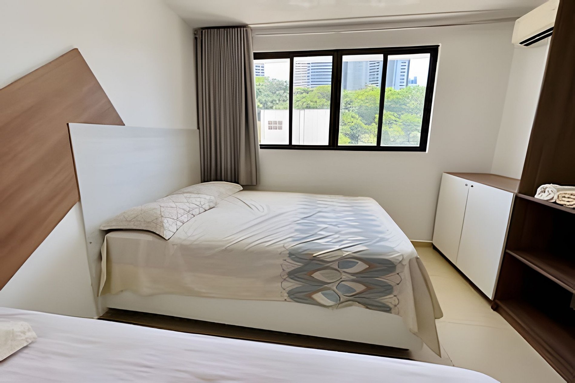 O apartamento possui dois quartos, sendo o primeiro com cama de casal, Smartv e duas poltronas, o segundo com uma cama de casal e outra de solteiro. Há uma cozinha completa com mesa e quatro cadeiras, além de um banheiro amplo.