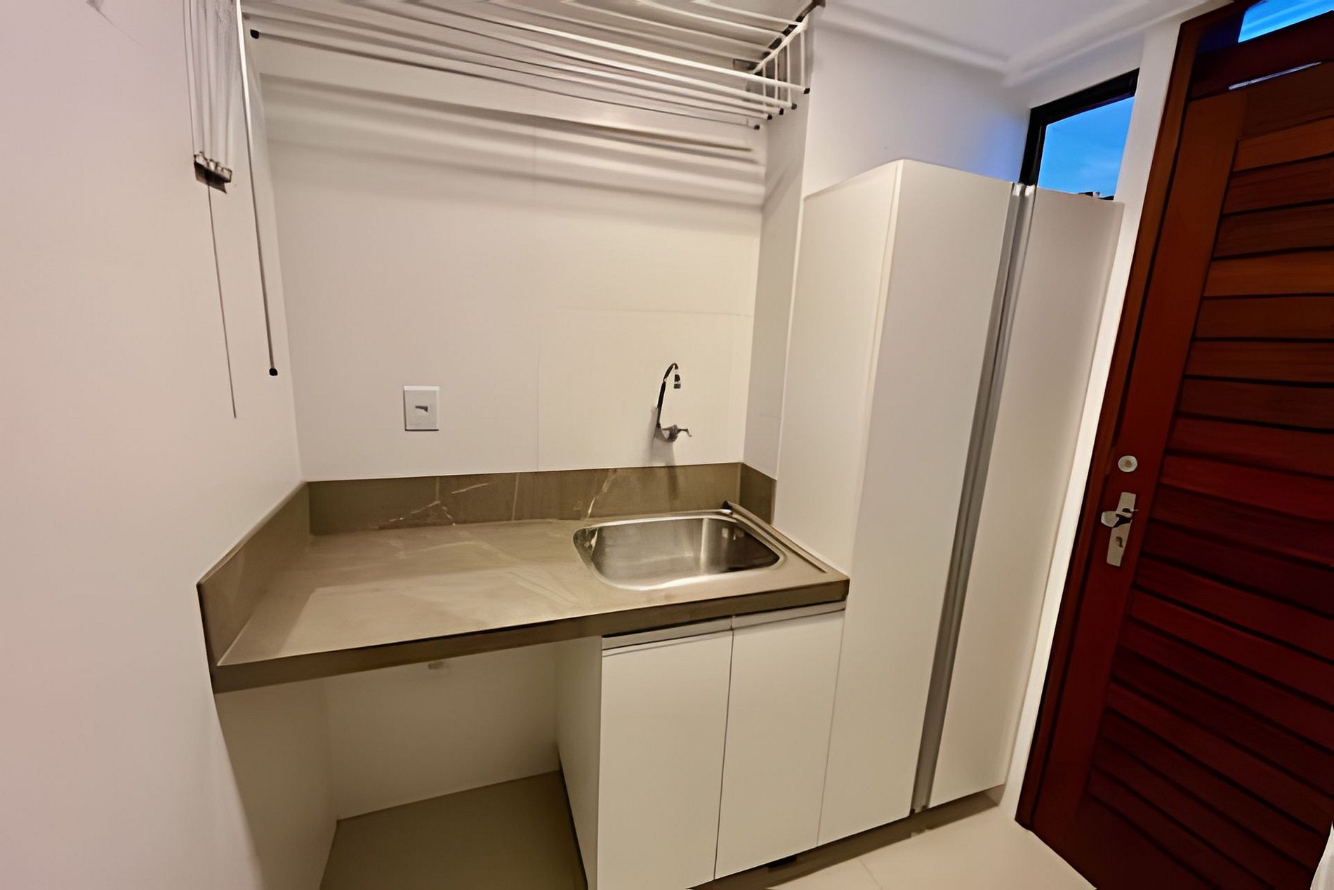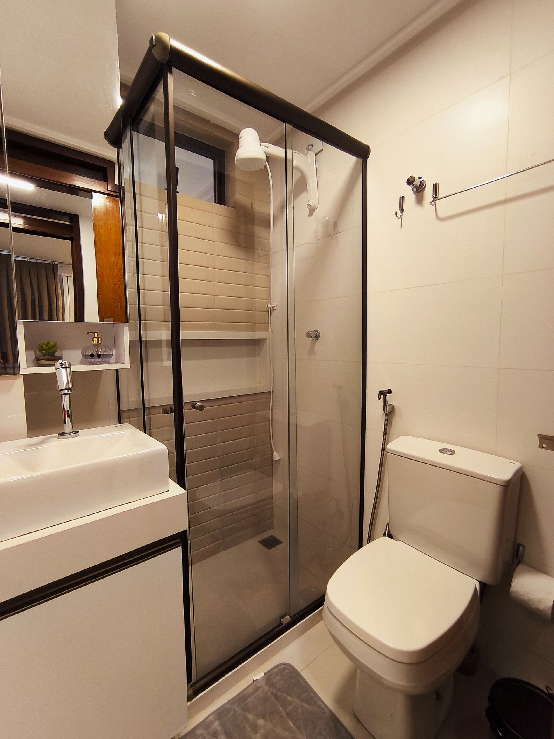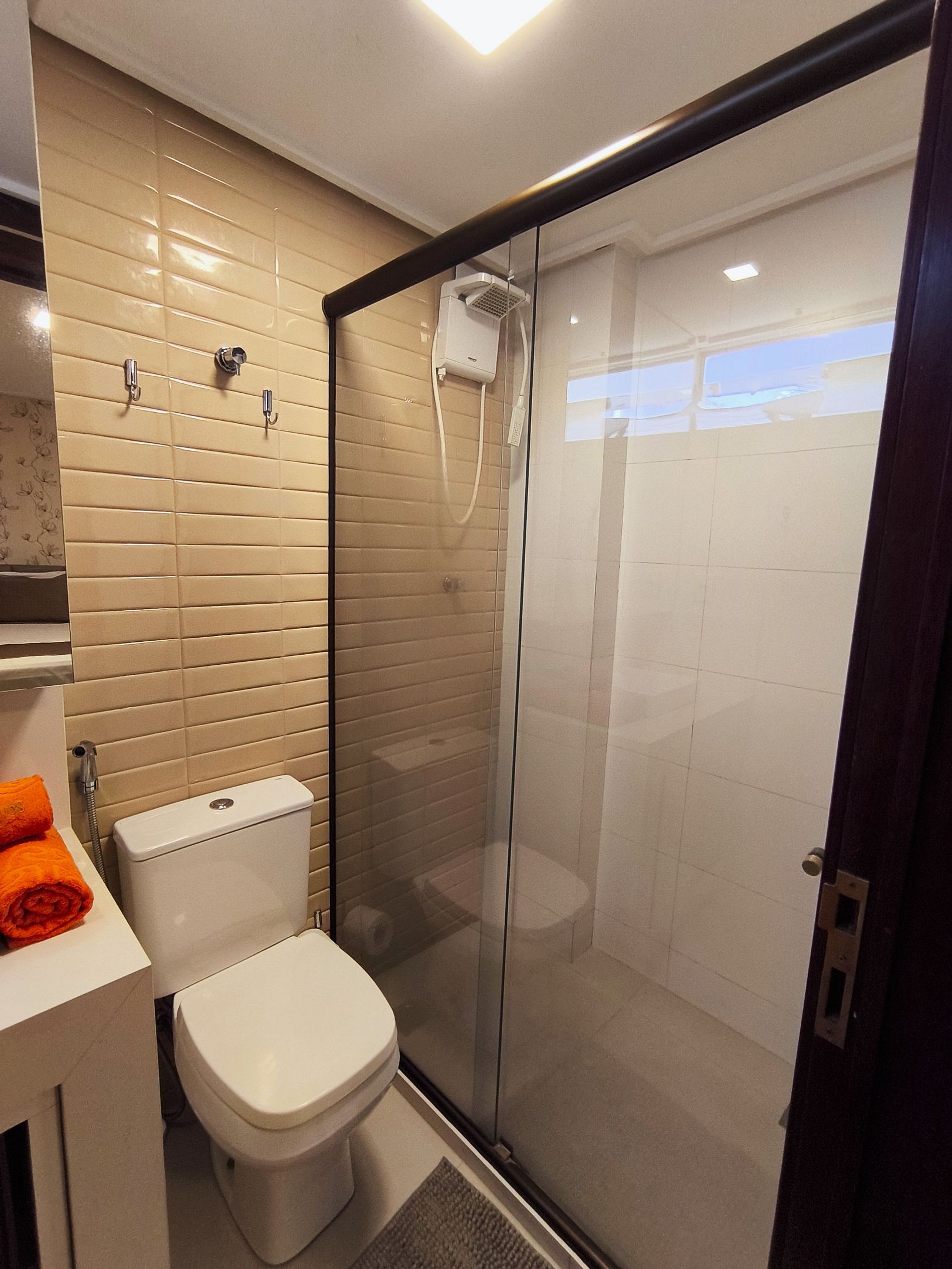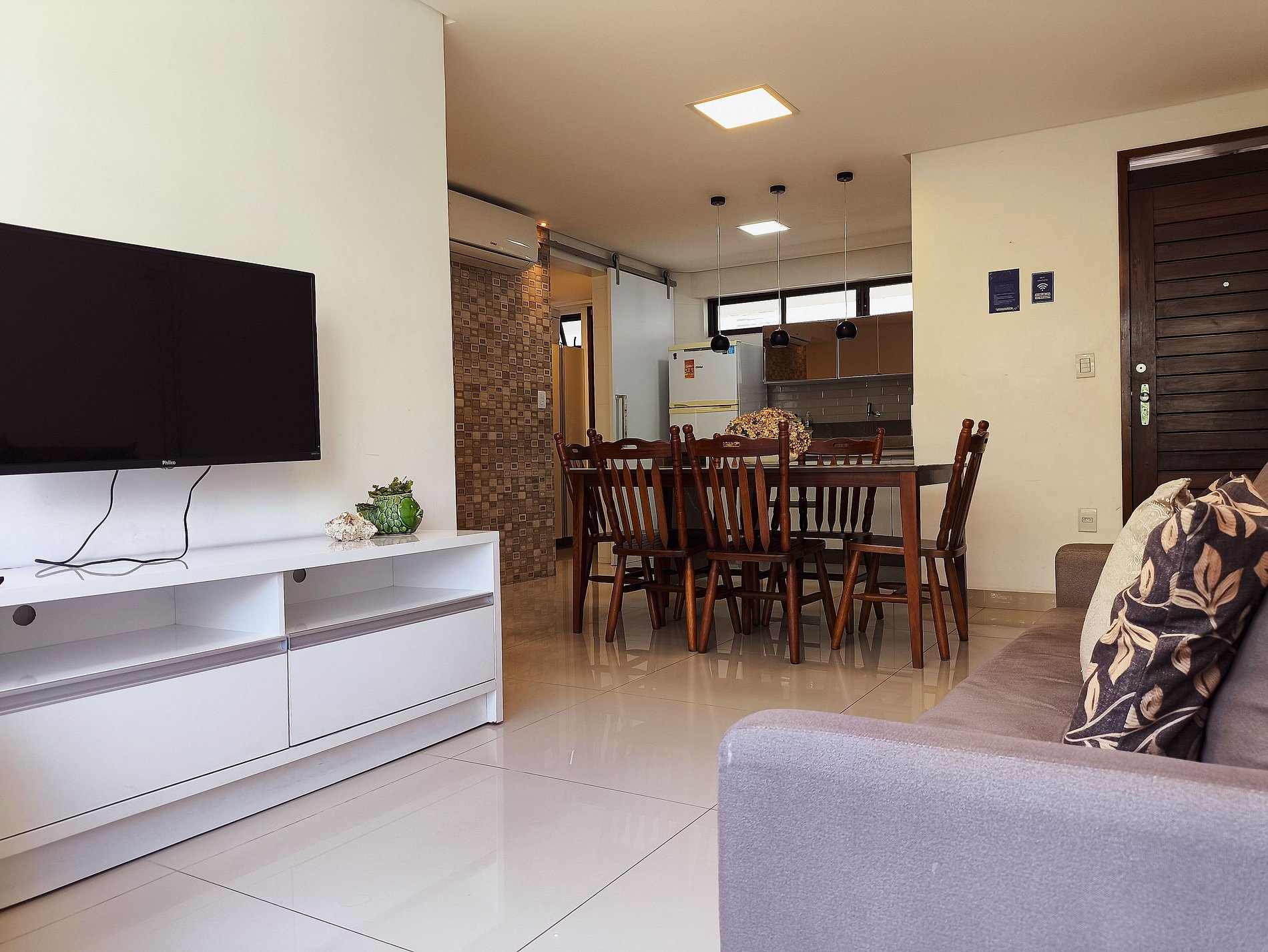 O apartamento possui uma sala de estar com cortina de vidro, sofá-cama para duas pessoas, além de uma smart tv. Na sala de jantar há uma grande mesa com 6 cadeiras. A cozinha do ap é completa, possuindo geladeira, fogão, coifa, micro-ondas, liquidificador, sanduicheira, cafeteira elétrica, panelas, talheres e outros utensílios domésticos. Há uma área de serviço com tanquinho de mão e pia, além de varal. O quarto principal é uma suíte, possui uma cama de casal e um guarda-roupas, também uma escrivaninha com cadeira e ar-condicionado. O segundo quarto, também suíte, possui uma cama de casal, guarda-roupas e ar-condicionado. Já o último quarto, que fica em frente ao banheiro social, possui também uma cama de casal, guarda-roupas e ar-condicionado. Em todos os banheiros há chuveiro elétrico.