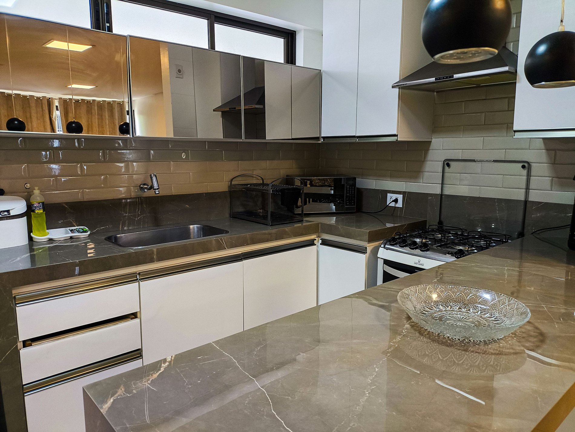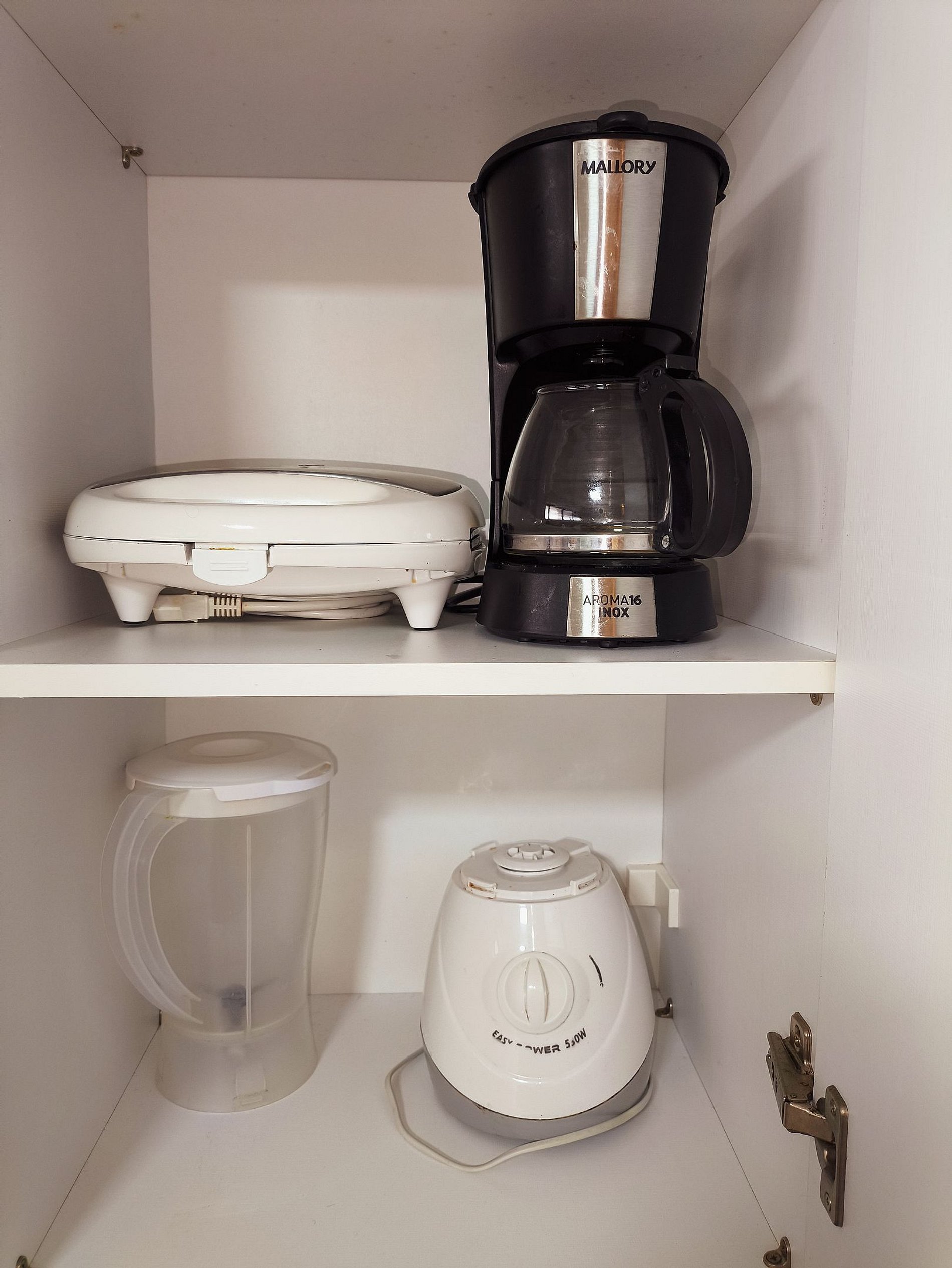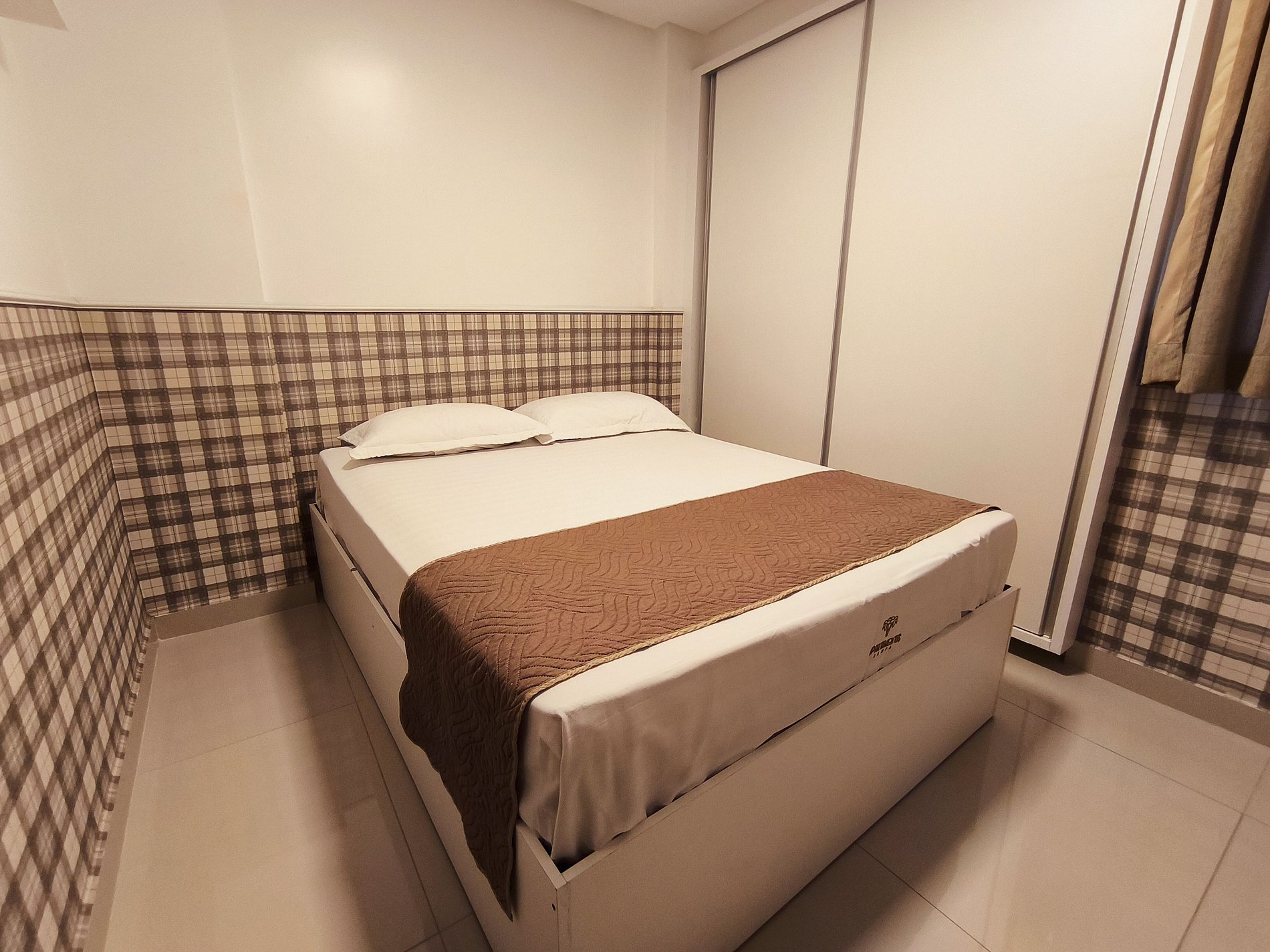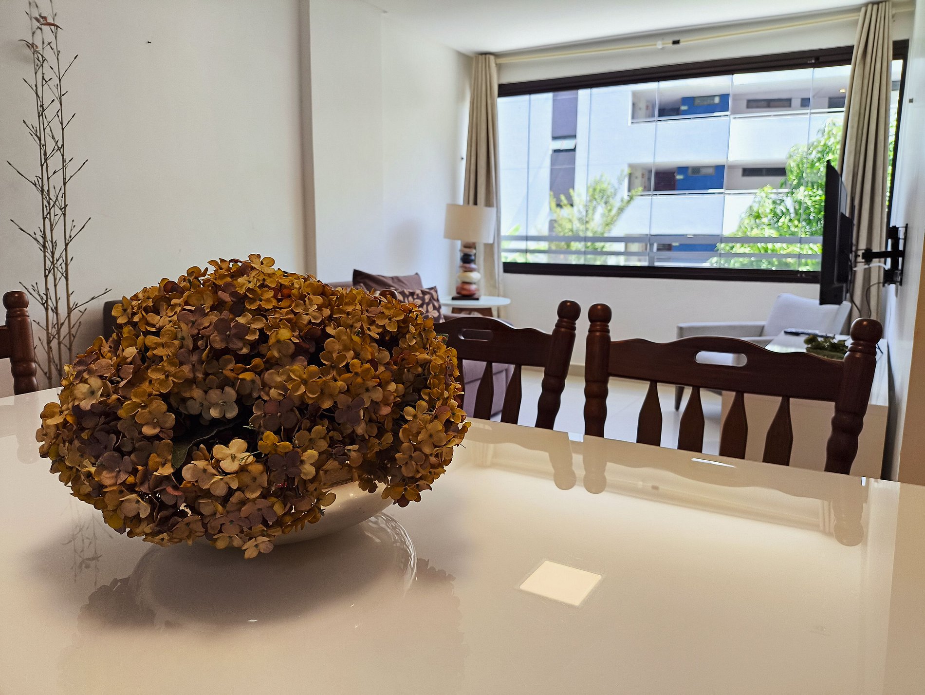 O apartamento possui uma sala de estar com cortina de vidro, sofá-cama para duas pessoas, além de uma smart tv. Na sala de jantar há uma grande mesa com 6 cadeiras. A cozinha do ap é completa, possuindo geladeira, fogão, coifa, micro-ondas, liquidificador, sanduicheira, cafeteira elétrica, panelas, talheres e outros utensílios domésticos. Há uma área de serviço com tanquinho de mão e pia, além de varal. O quarto principal é uma suíte, possui uma cama de casal e um guarda-roupas, também uma escrivaninha com cadeira e ar-condicionado. O segundo quarto, também suíte, possui uma cama de casal, guarda-roupas e ar-condicionado. Já o último quarto, que fica em frente ao banheiro social, possui também uma cama de casal, guarda-roupas e ar-condicionado. Em todos os banheiros há chuveiro elétrico.