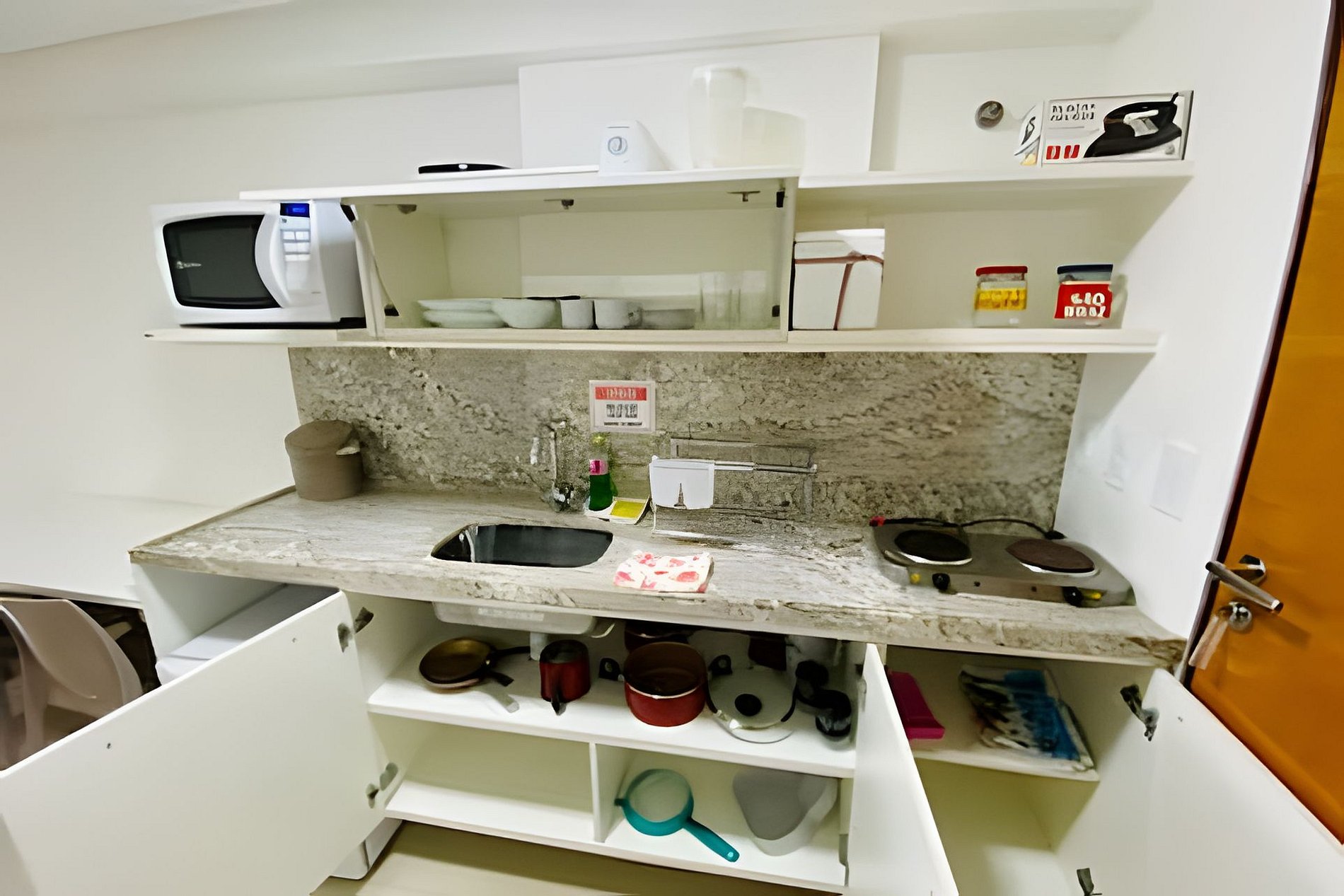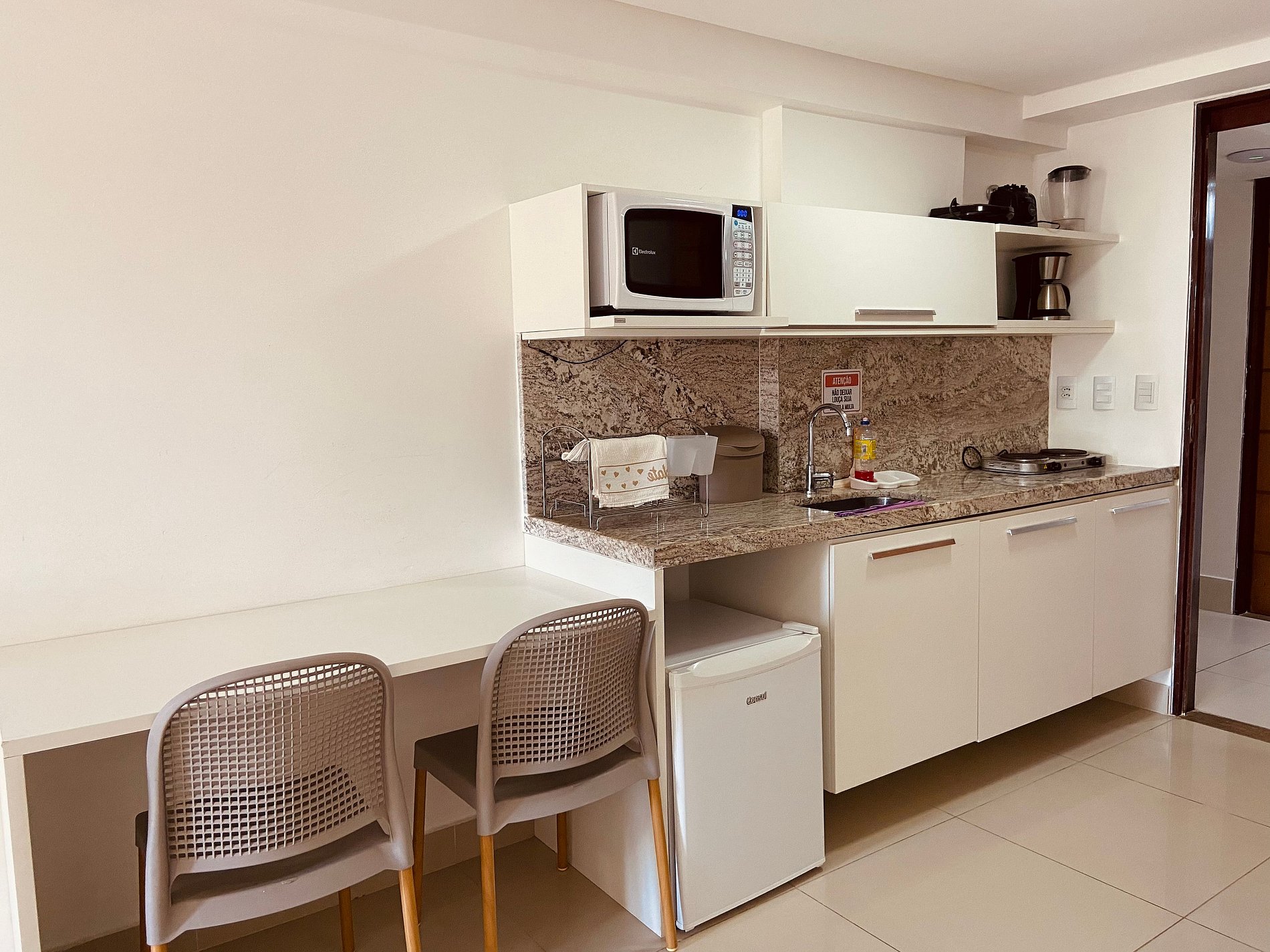 O apartamento é um espaço aberto perfeitamente bem integrado entre quarto, sala e cozinha, além de varanda e banheiro. Possui uma cama de casal e uma de solteiro, Smartv, ar condicionado, cozinha compacta com louças e utensílios. Possui também um espaço para trabalho com mesa.