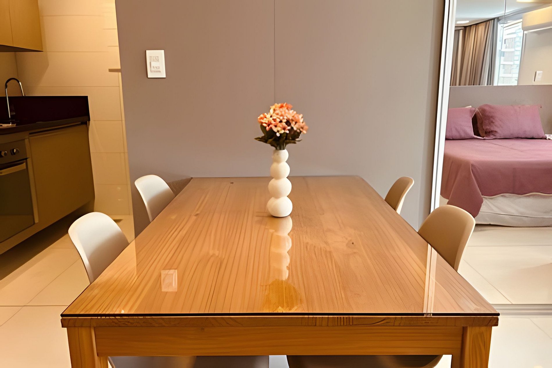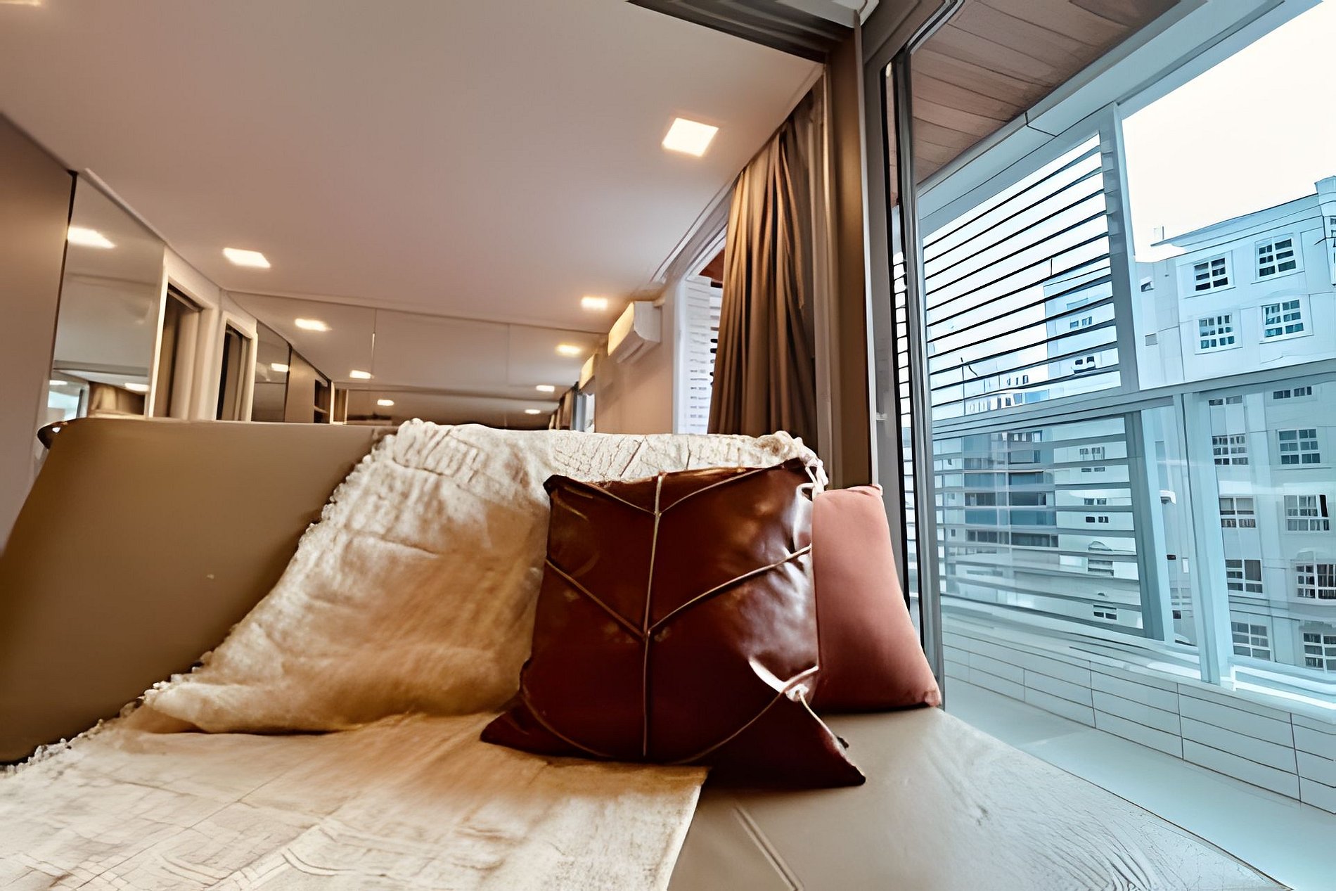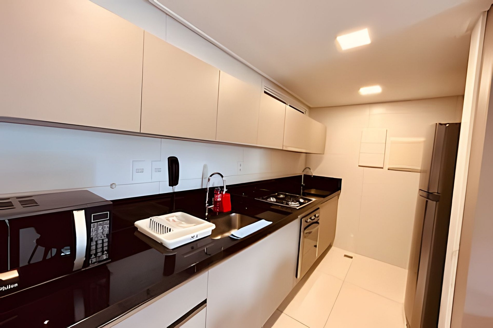O apartamento é um espaço aberto perfeitamente bem integrado entre quarto, sala, cozinha e banheiro. Possui uma cama de casal e um sofá-cama para duas pessoas, duas SmarTvs , ar condicionado no quarto e na sala, cozinha completa com louças e utensílios.