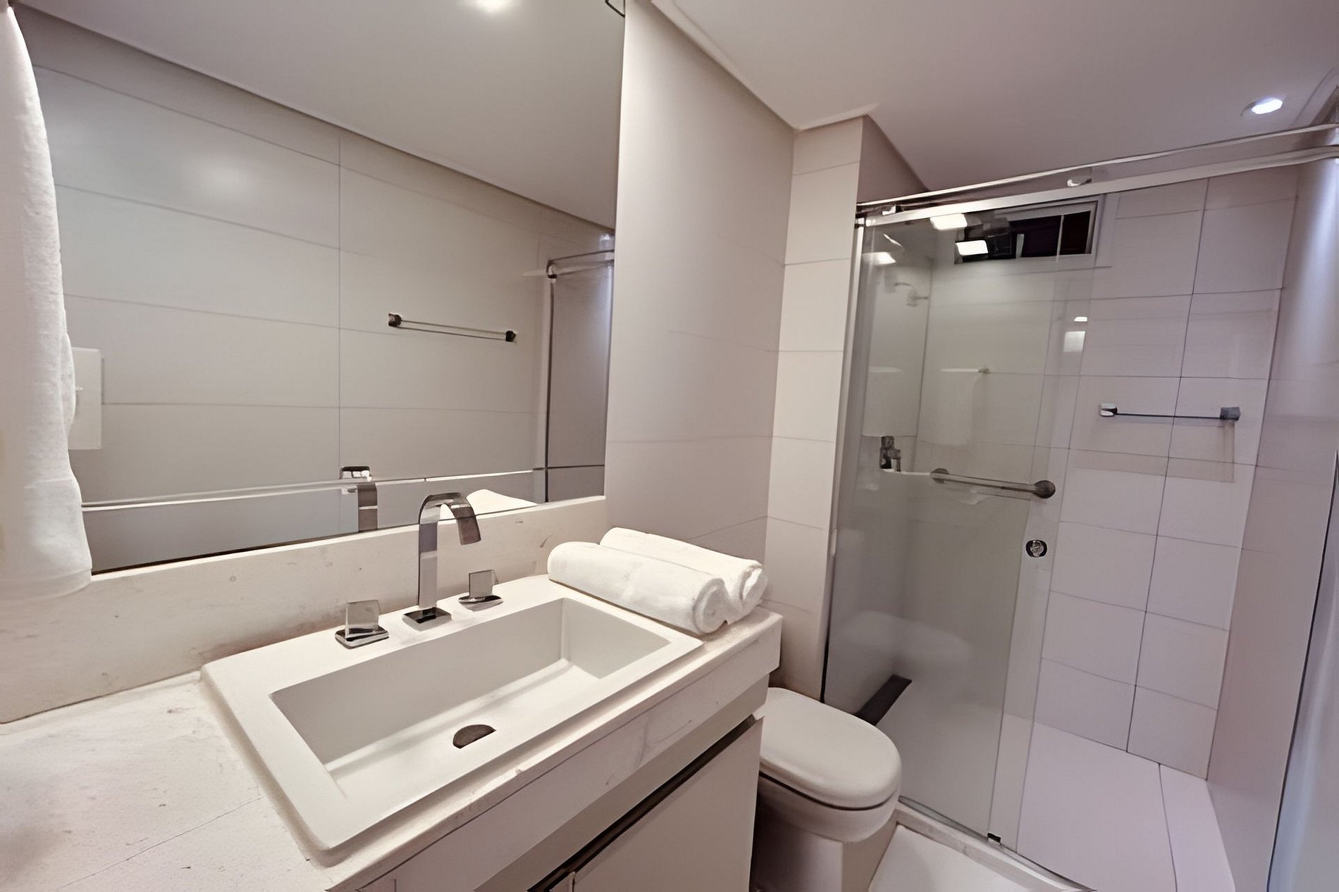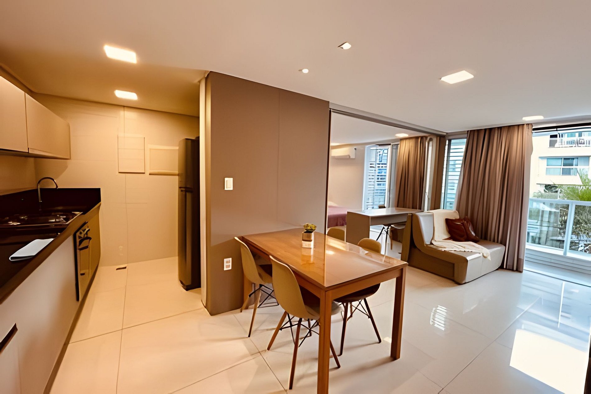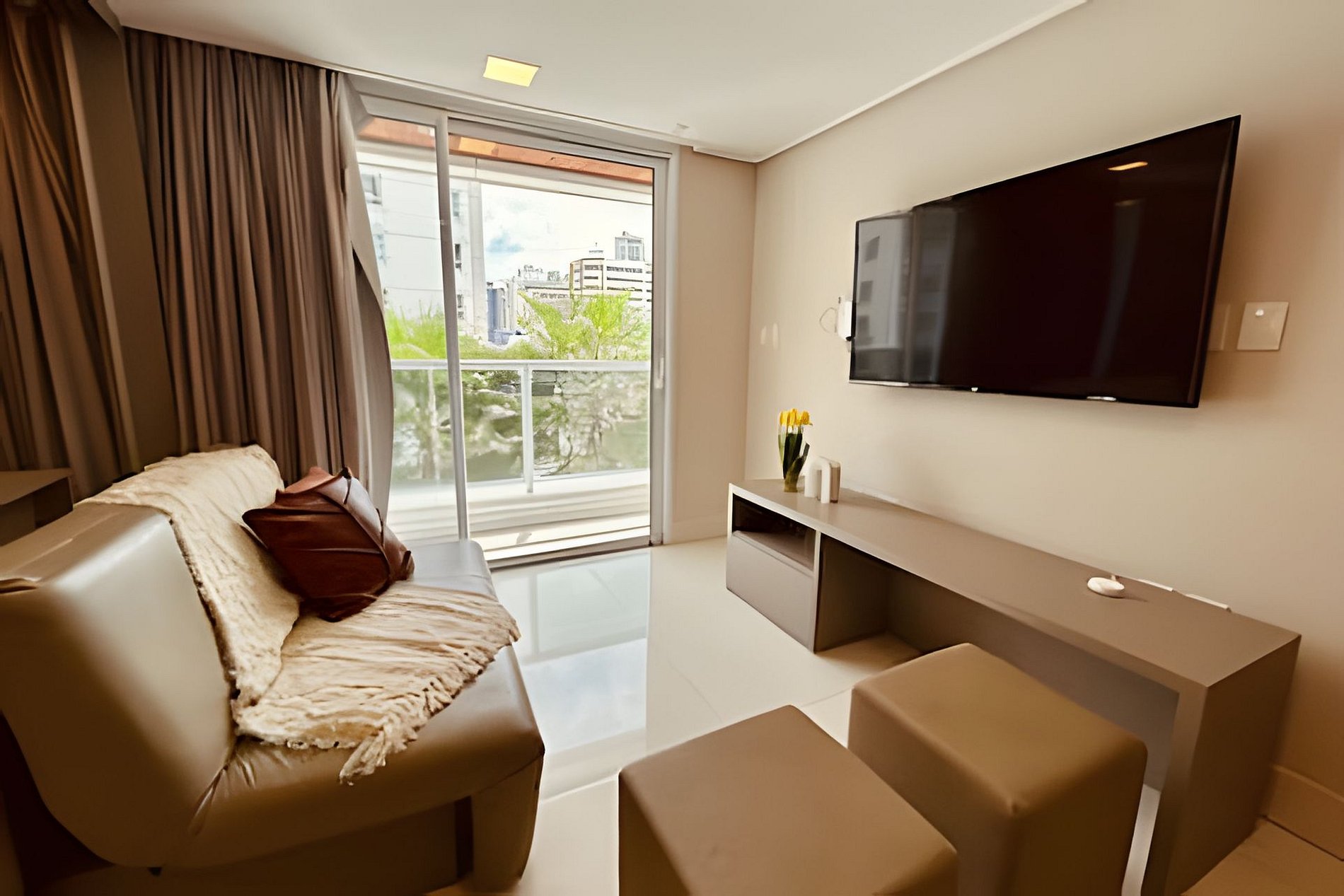 O apartamento é um espaço aberto perfeitamente bem integrado entre quarto, sala, cozinha e banheiro. Possui uma cama de casal e um sofá-cama para duas pessoas, duas SmarTvs , ar condicionado no quarto e na sala, cozinha completa com louças e utensílios.