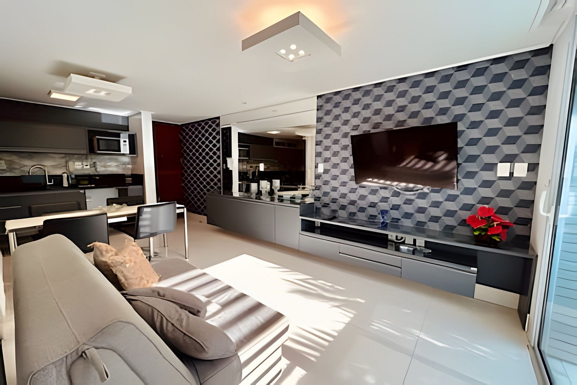 O apartamento é em estilo loft, aberto, mas que tem a opção de fechamento separando o quarto da sala, bastante útil quando hospedando mais de duas pessoas. Possui sala de estar com sofá cama, puffs, smart tv, mesa com quatro cadeiras, cozinha completa com talheres, potes e panelas. Quarto com cama tamanho queen e banheiro anexo amplo.