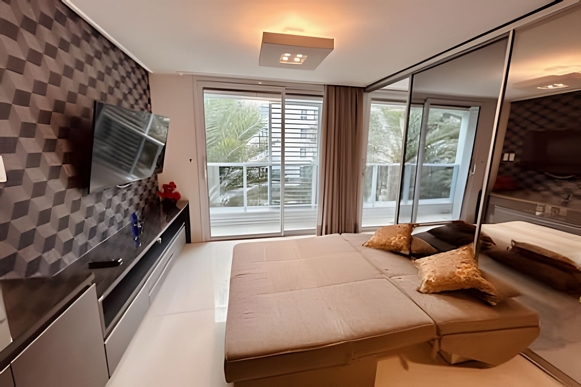 O apartamento é em estilo loft, aberto, mas que tem a opção de fechamento separando o quarto da sala, bastante útil quando hospedando mais de duas pessoas. Possui sala de estar com sofá cama, puffs, smart tv, mesa com quatro cadeiras, cozinha completa com talheres, potes e panelas. Quarto com cama tamanho queen e banheiro anexo amplo.