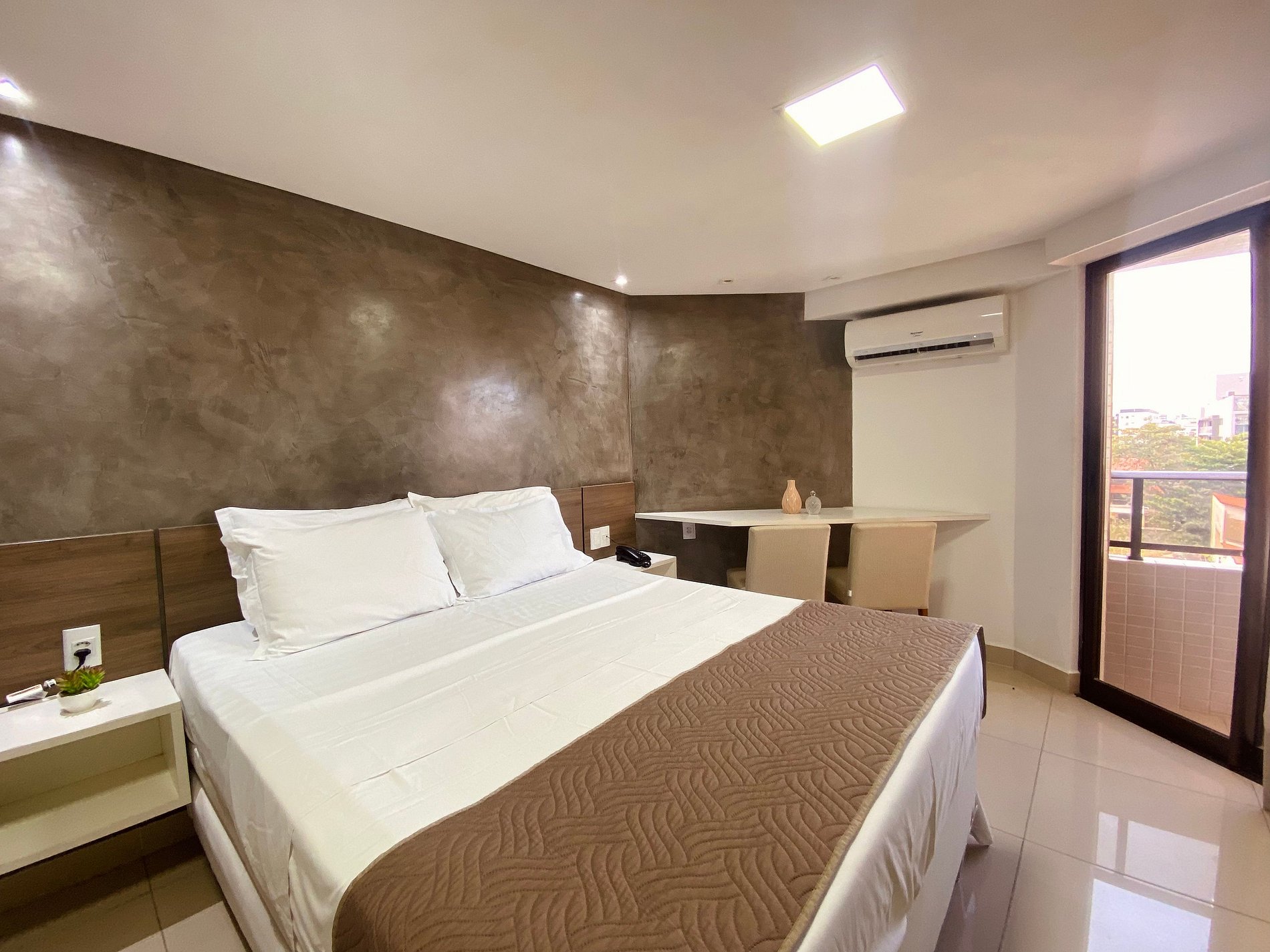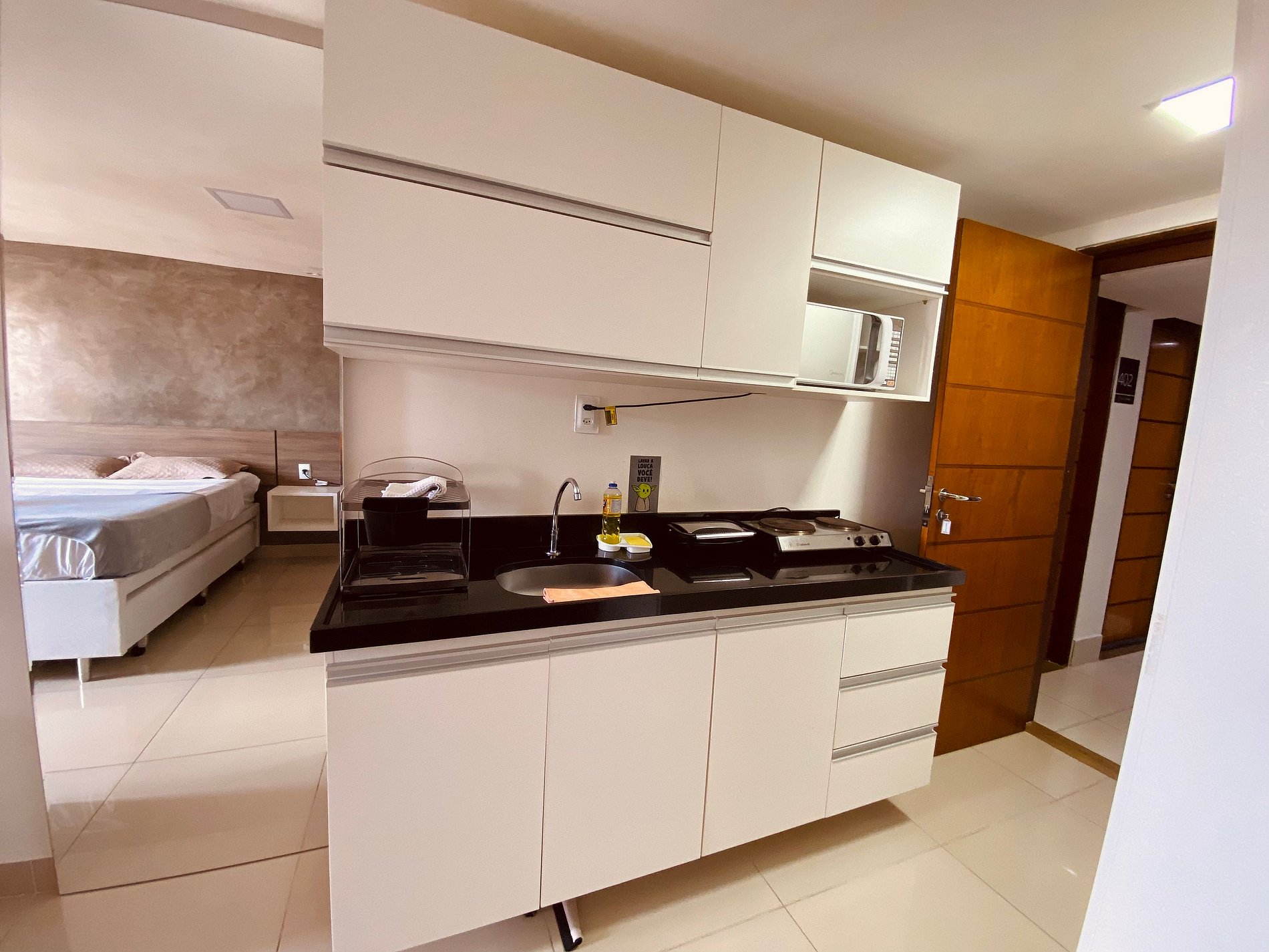 O apartamento é um espaço compacto extremamente confortável, contando com uma cama tamanho queen e duas camas auxiliares, SmarTv e canais a cabo, cozinha completa para preparação de alimentos, mesa com quatro cadeiras e banheiro. O apartamento faz parte do Gold Flat, que conta com a rede de hotéis Littoral, compartilhando seus serviços: limpeza de quarto, internet, tv à cabo, recepção 24h, lavanderia, restaurante e bar, tudo ao seu dispor.