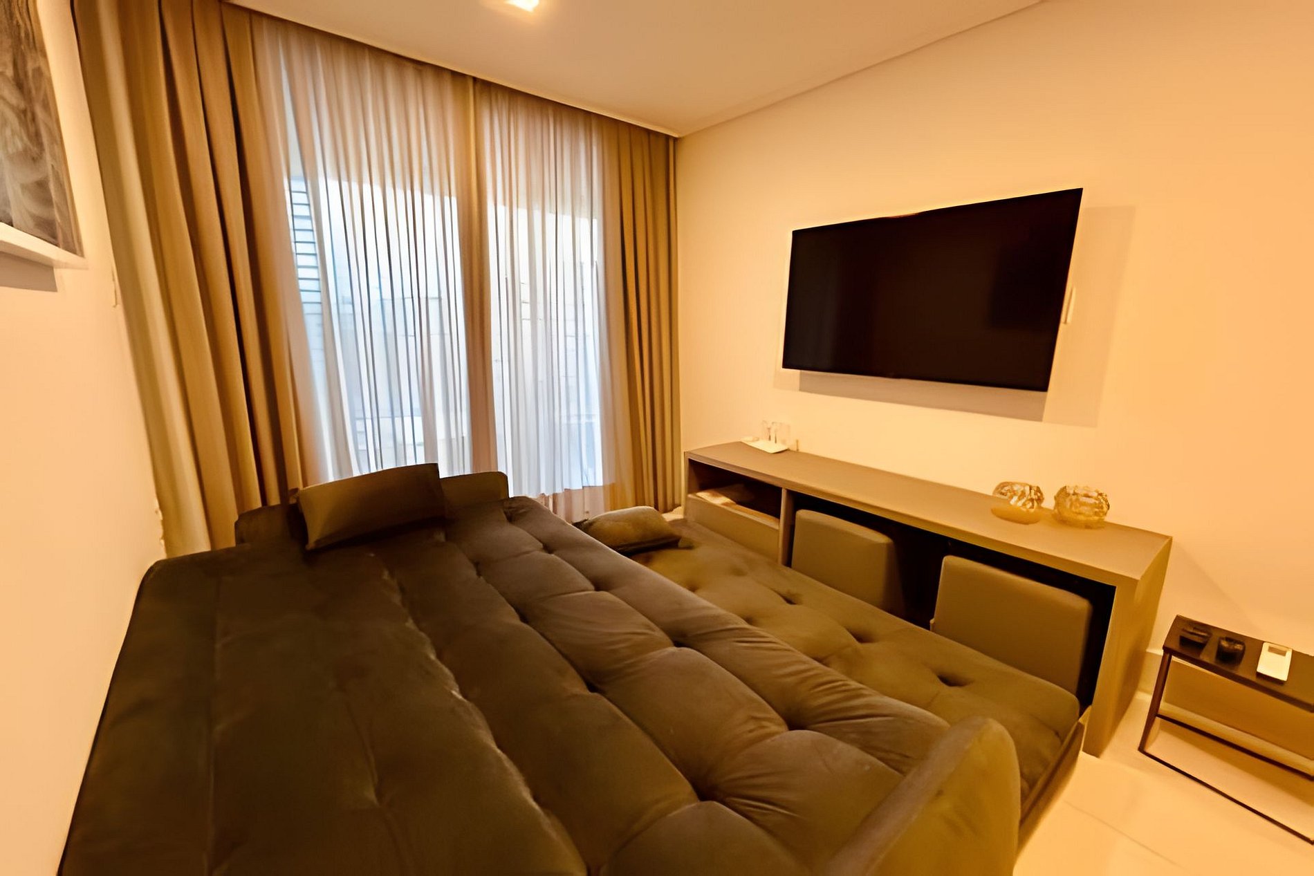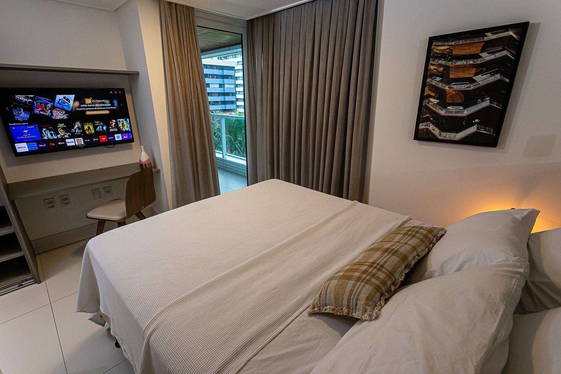 O apartamento possui dois quartos, sendo uma suíte com uma cama queen, escrivaninha para trabalho, SmarTv e ar condicionado. Um segundo quarto com cama duas camas de solteiro e ar condicionado. Sala de estar com sofá cama, smart tv e outro ar, mesa com cinco cadeiras, cozinha completa com talheres, potes e panelas. Por fim, há um segundo banheiro: o social.