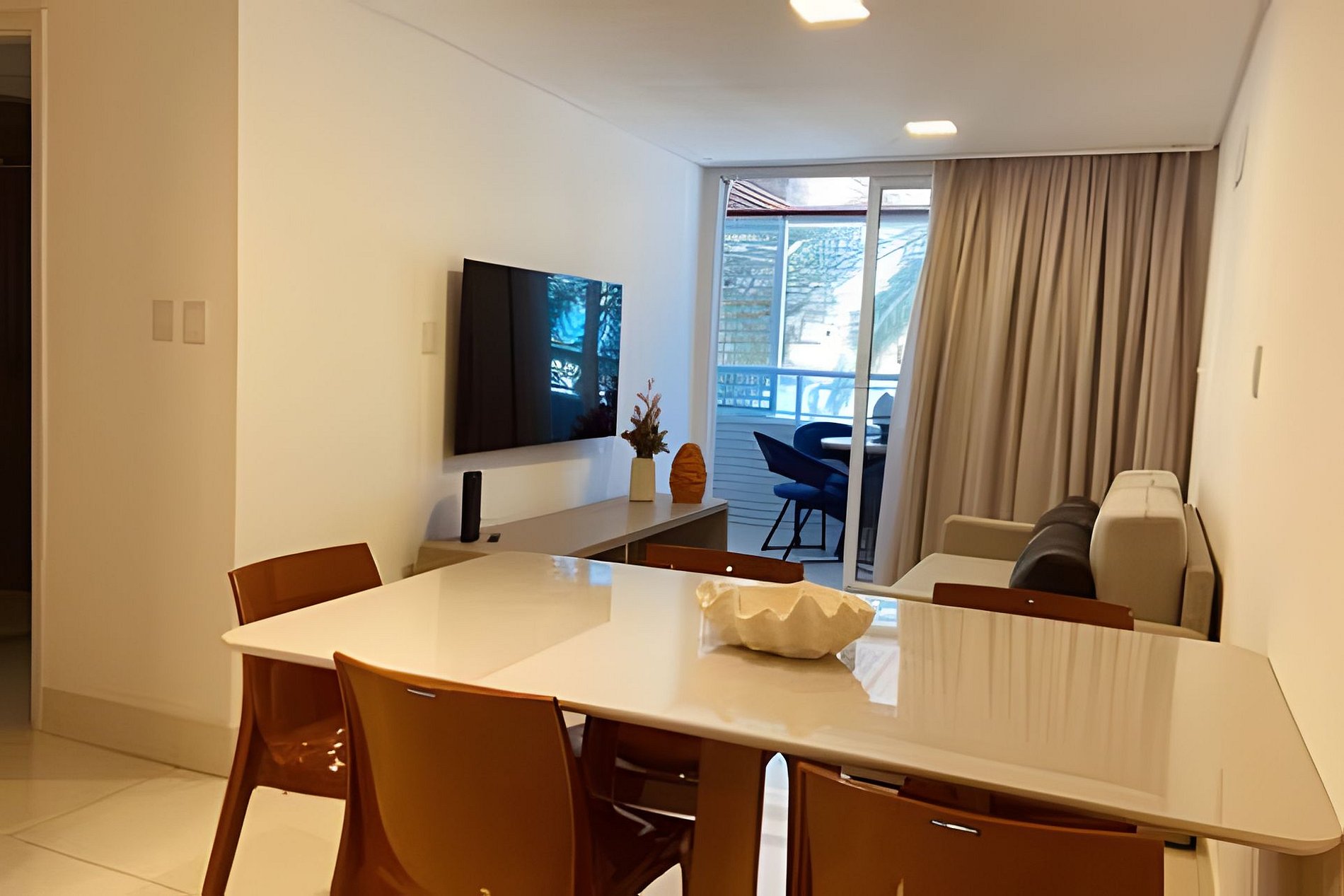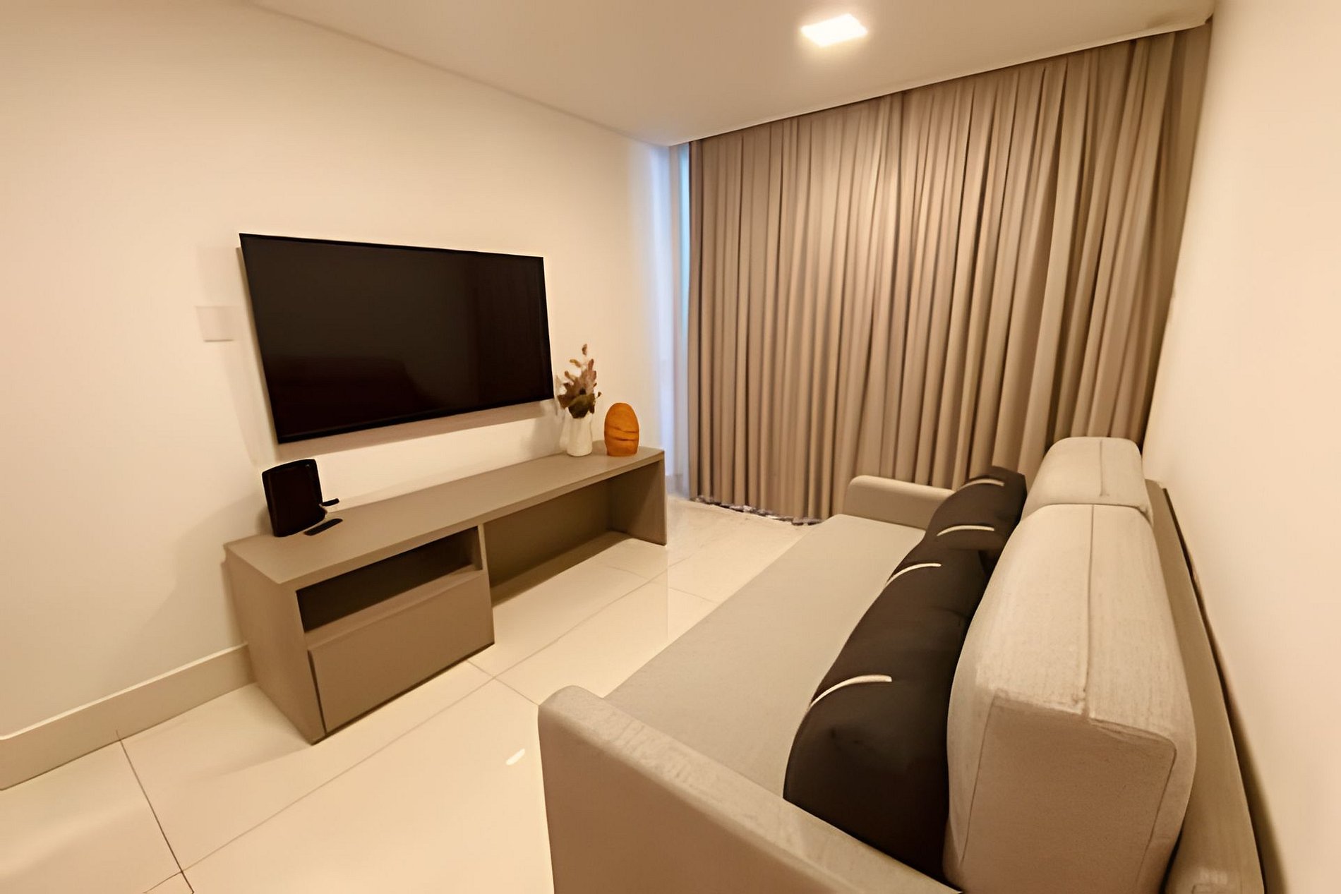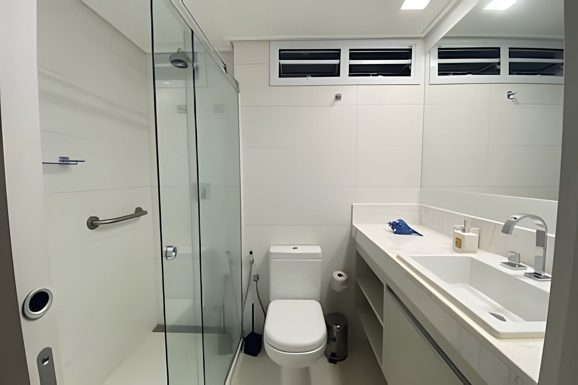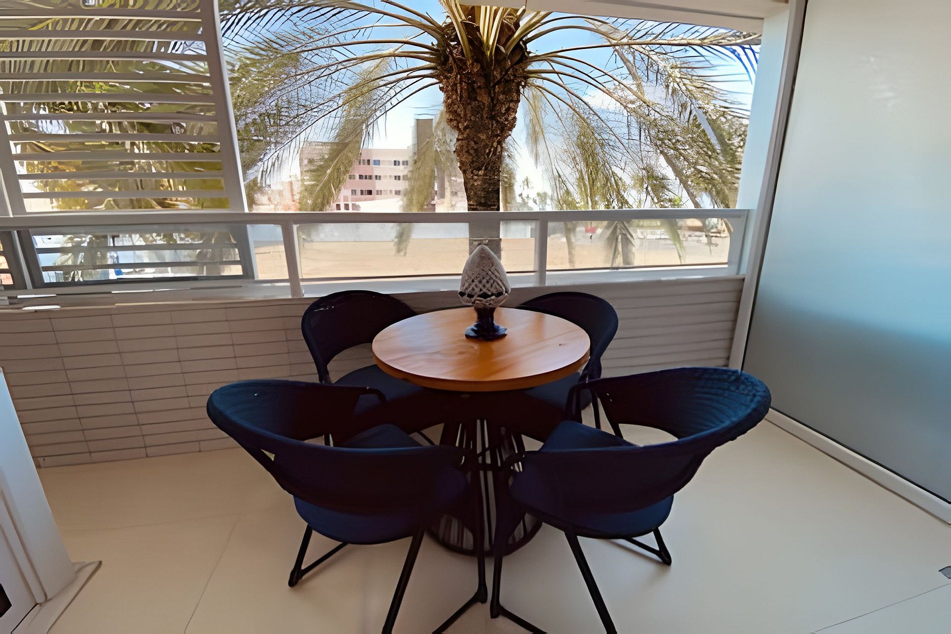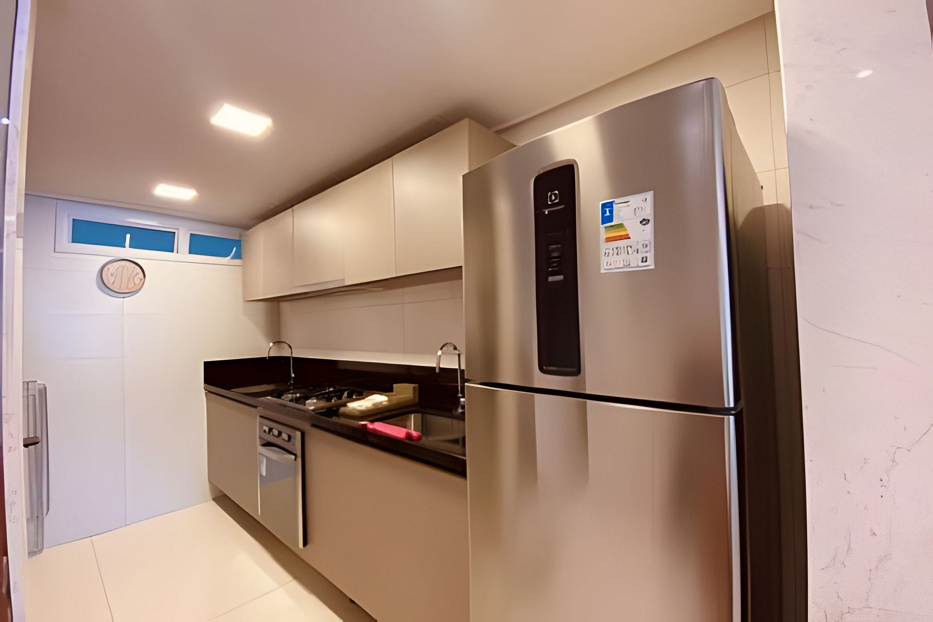 O apartamento possui uma suíte disponível para os hóspedes, com cama queen size, escrivaninha para trabalho e SmarTv. Sala de estar com sofa, smart tv e ar condicionado, mesa com quatro cadeiras, cozinha completa com talheres, potes e panelas. Há um segundo banheiro: o social. Por fim, um segundo quarto com cama de casal.