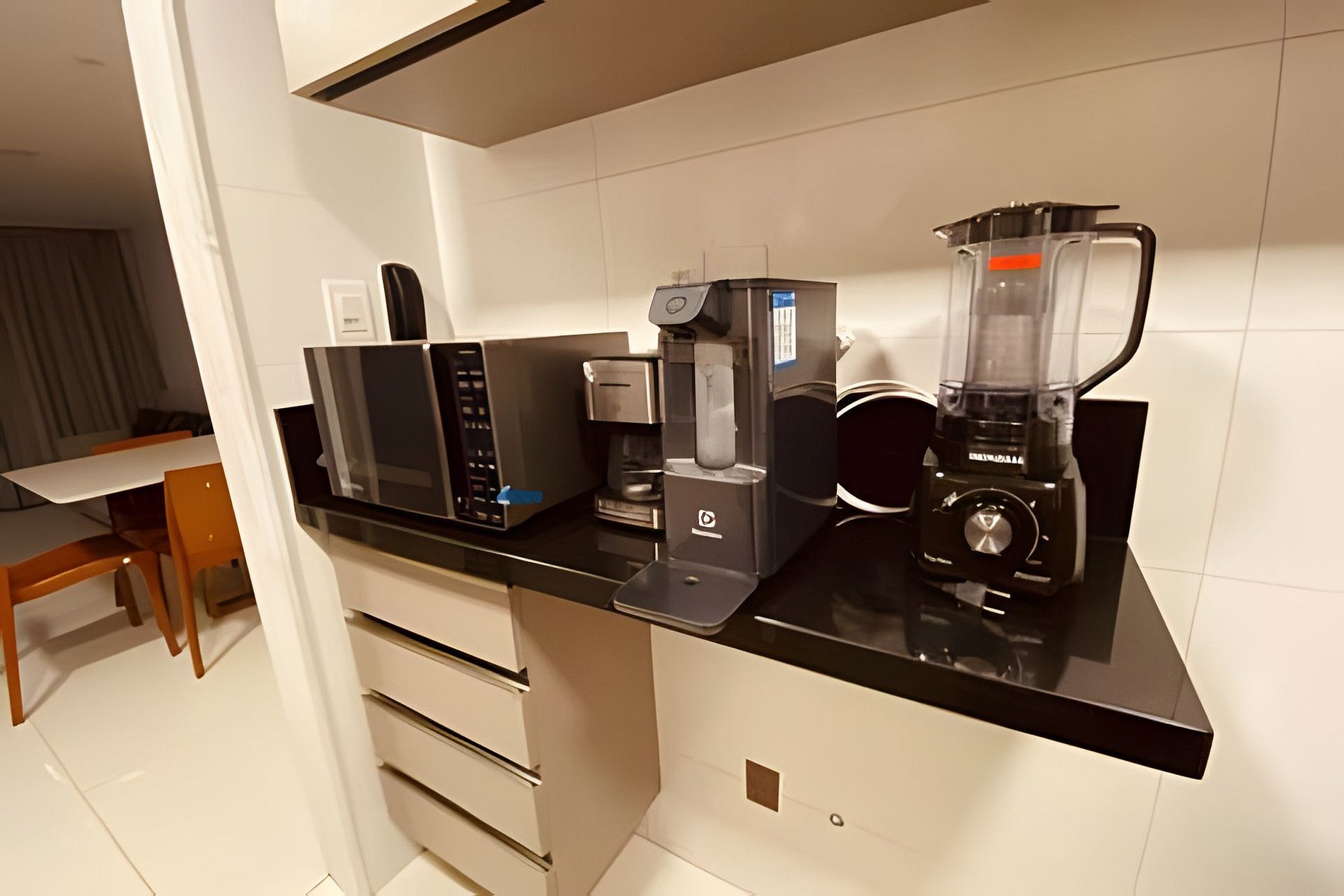 O apartamento possui uma suíte disponível para os hóspedes, com cama queen size, escrivaninha para trabalho e SmarTv. Sala de estar com sofa, smart tv e ar condicionado, mesa com quatro cadeiras, cozinha completa com talheres, potes e panelas. Há um segundo banheiro: o social. Por fim, um segundo quarto com cama de casal.