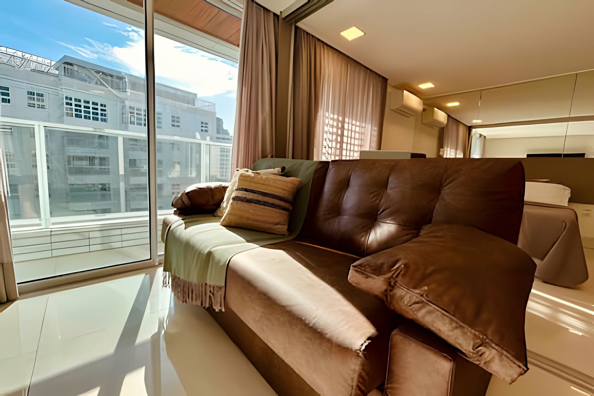 Todas as portas do apartamento são de vidro duplo, que o isolam acusticamente e mantém a temperatura interna por mais tempo.