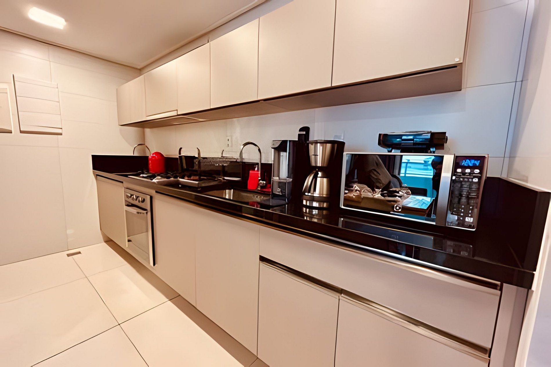 O apartamento é em estilo loft, aberto, mas que tem a opção de fechamento separando o quarto da sala, bastante útil quando hospedando mais de duas pessoas. Possui sala de estar com sofá cama, com dois níveis (comporta uma pessoa em cada nível), puffs, smart tv e ar condicionado, mesa com quatro cadeiras, cozinha completa com talheres, potes e panelas. Quarto com cama tamanho queen e banheiro anexo amplo.