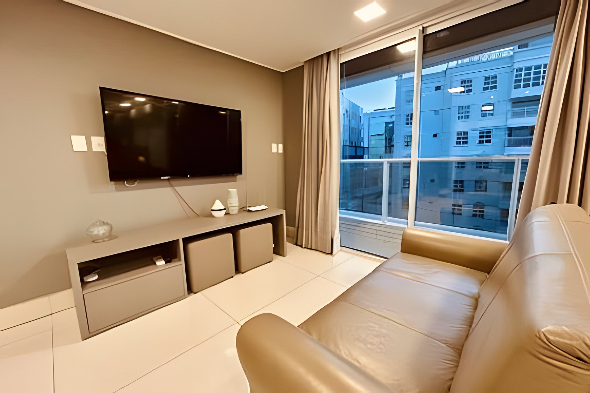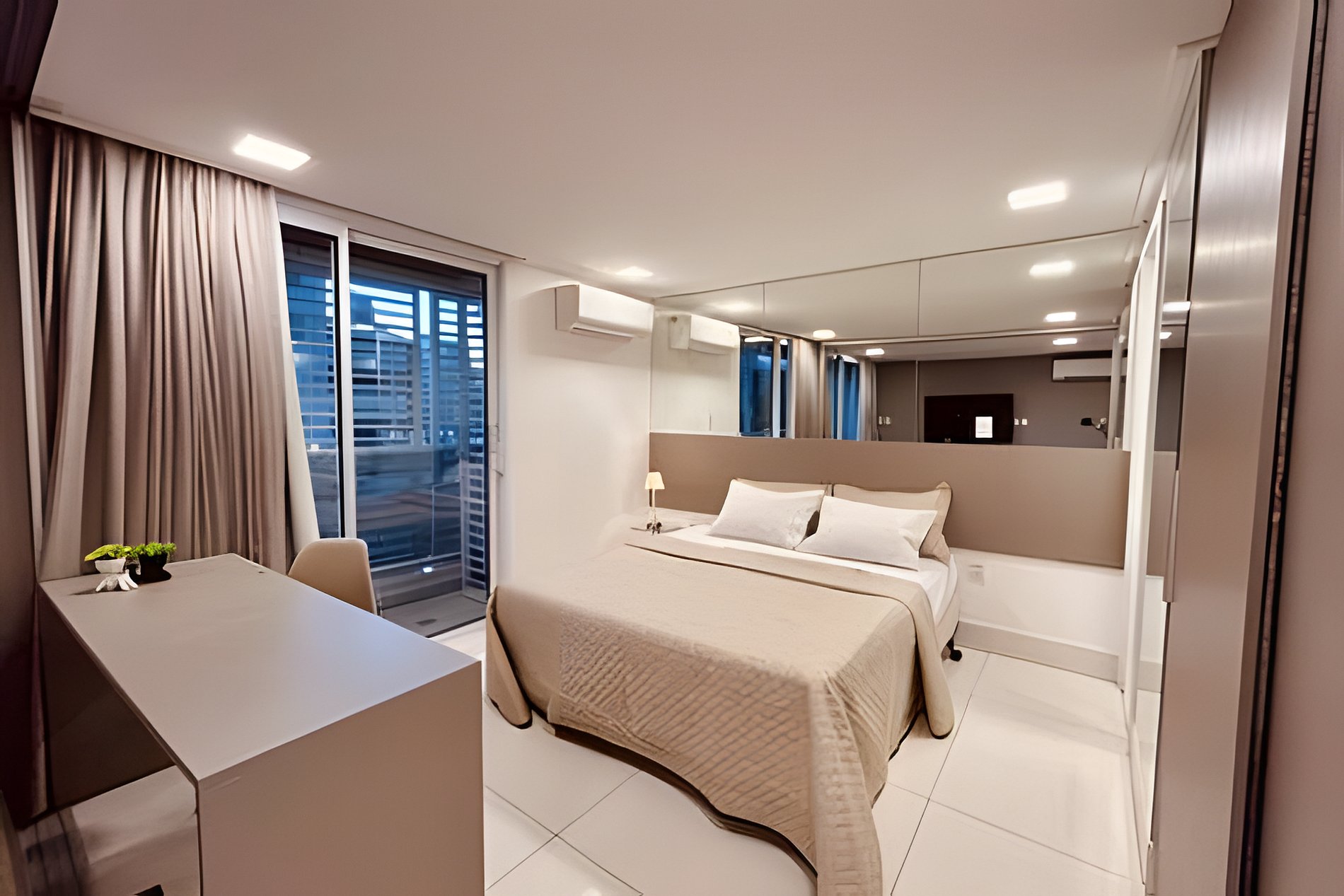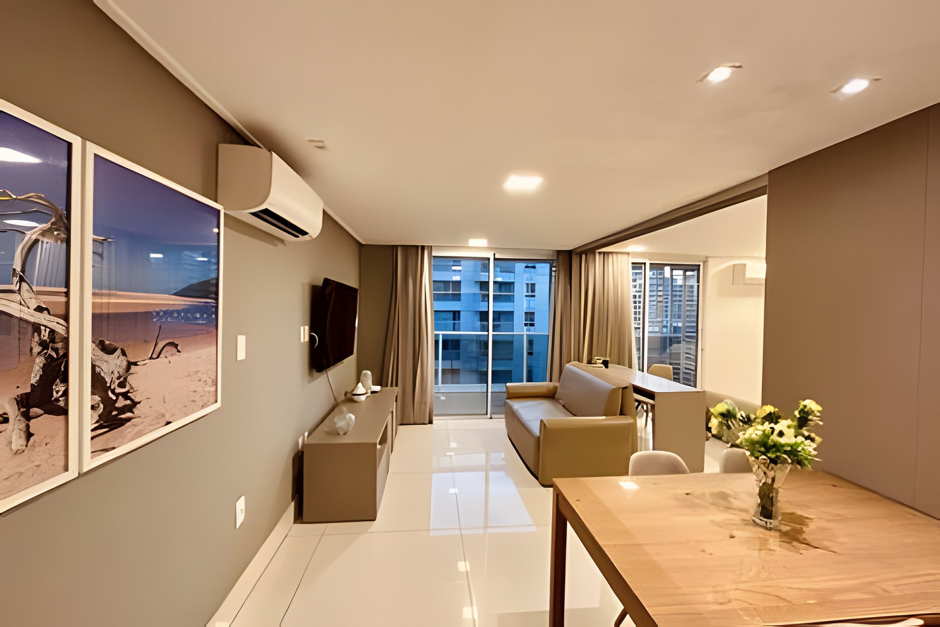 O apartamento é em estilo loft, aberto, mas que tem a opção de fechamento separando o quarto da sala, bastante útil quando hospedando mais de duas pessoas. Possui sala de estar com sofá cama, puffs, smart tv e ar condicionado, mesa com quatro cadeiras, cozinha completa com talheres, potes e panelas. Quarto com cama tamanho queen e banheiro anexo amplo.