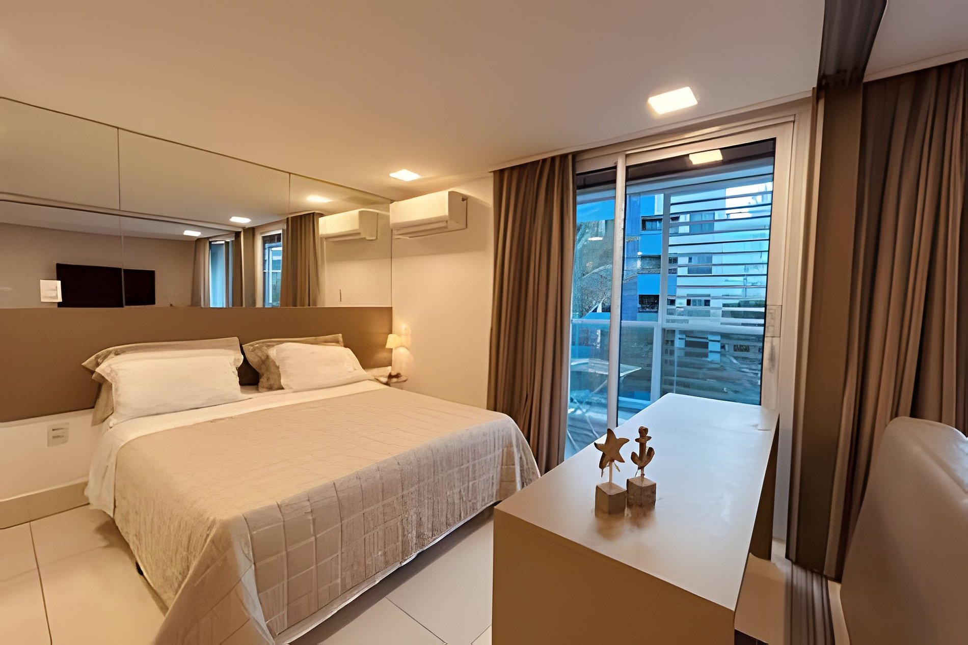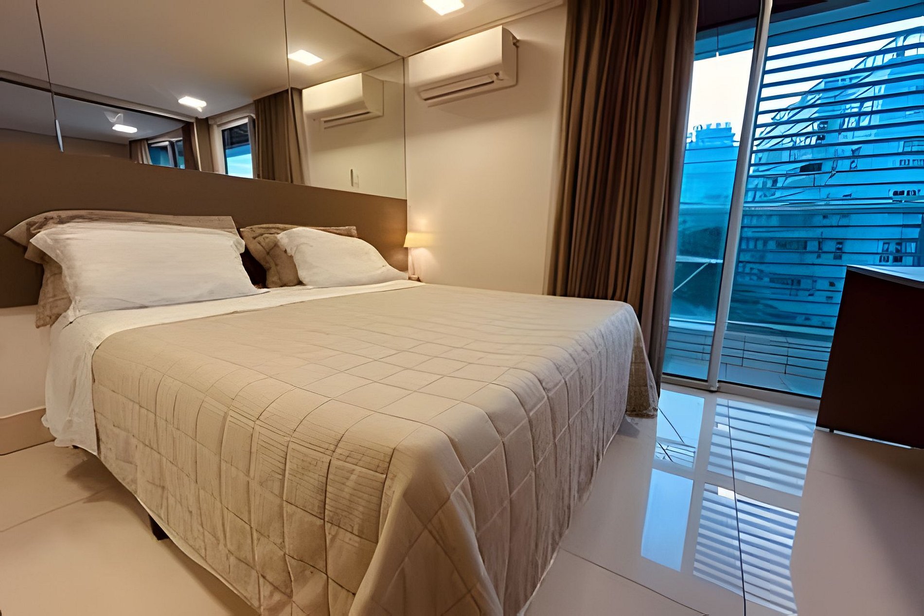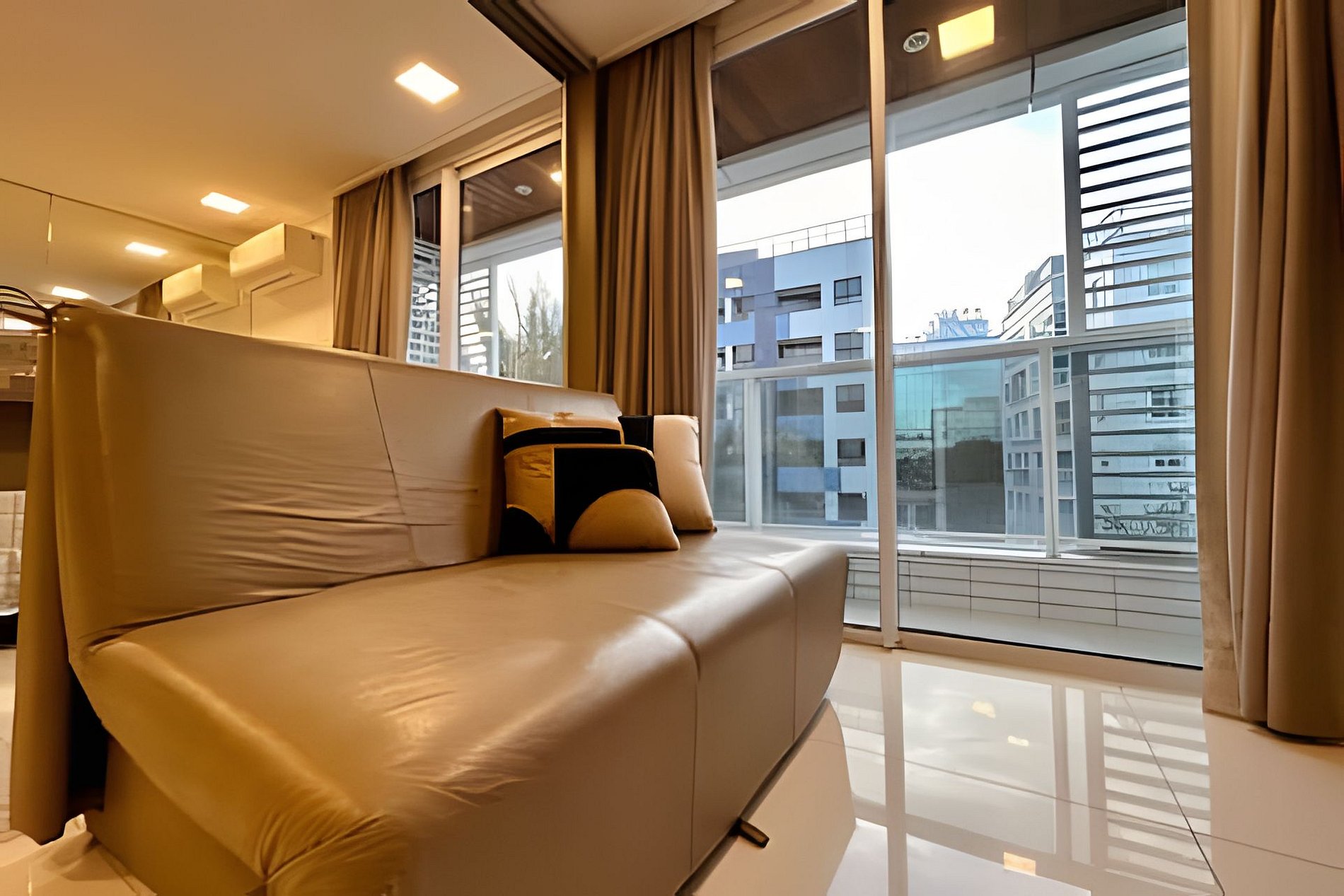 O apartamento é em estilo loft, aberto, mas que tem a opção de fechamento separando o quarto da sala, bastante útil quando hospedando mais de duas pessoas. Possui sala de estar com sofá cama, puffs, smart tv e ar condicionado, mesa com quatro cadeiras, cozinha completa com talheres, potes e panelas. Quarto com cama tamanho queen e banheiro anexo amplo.