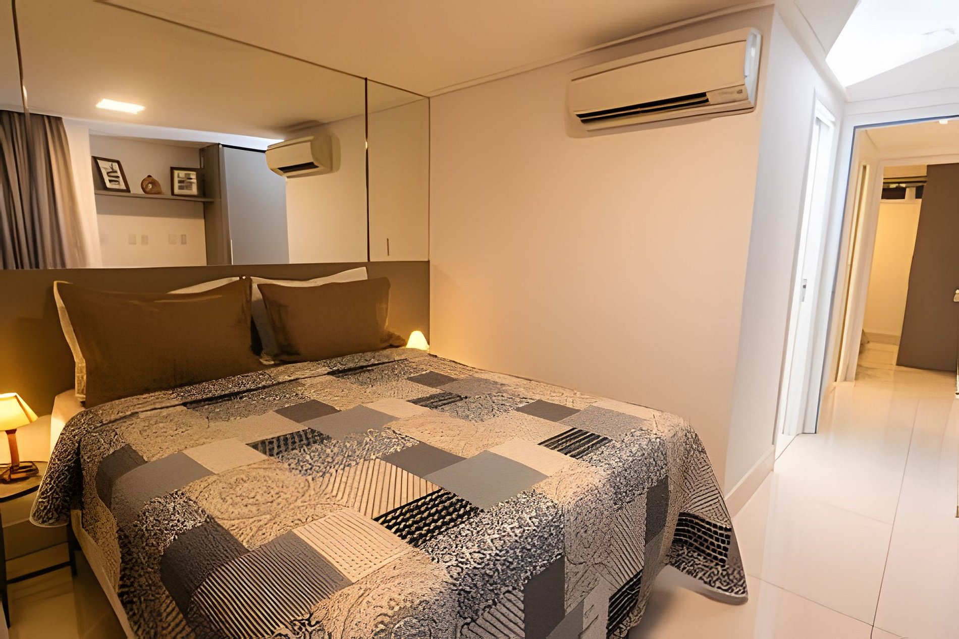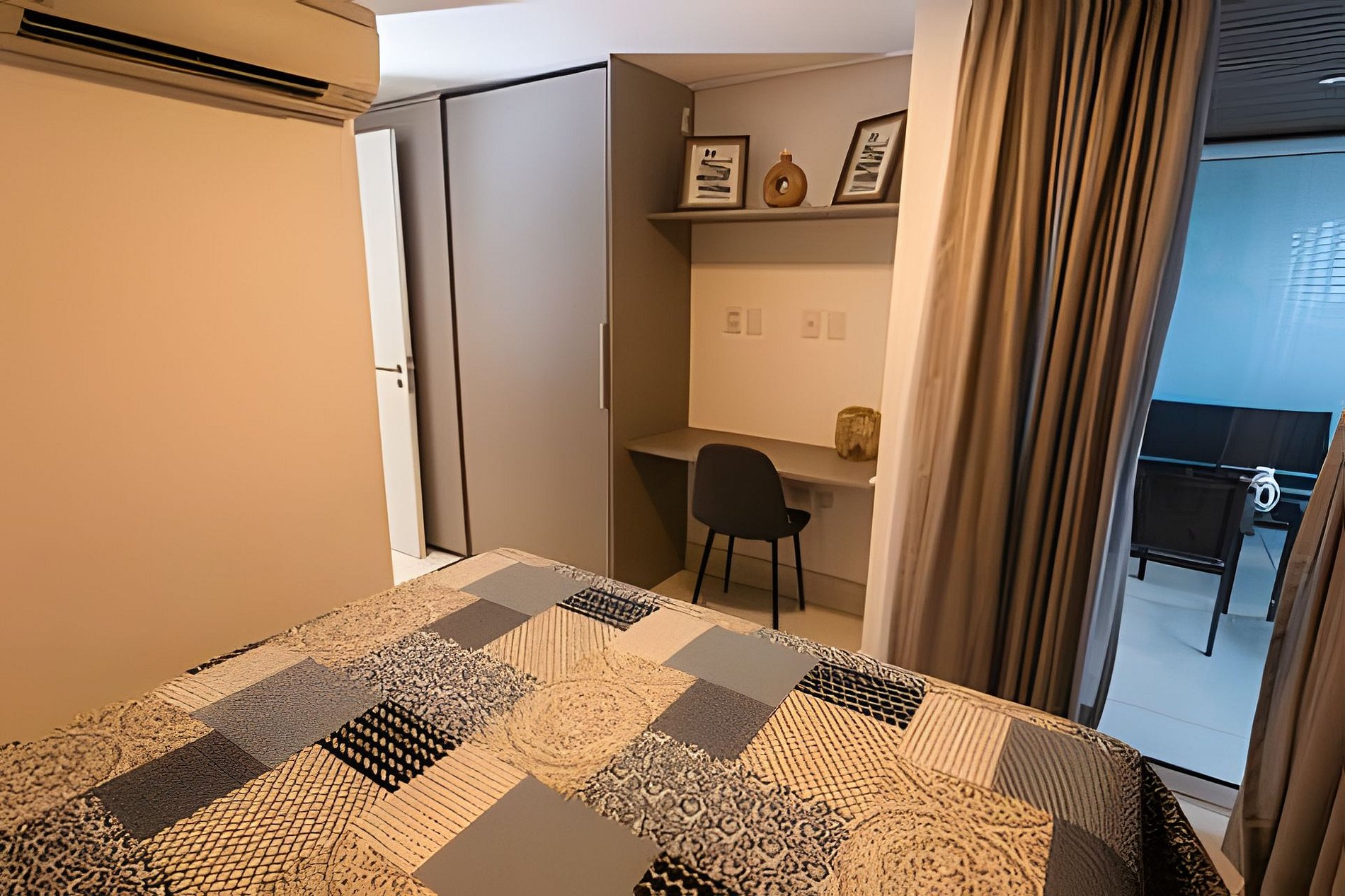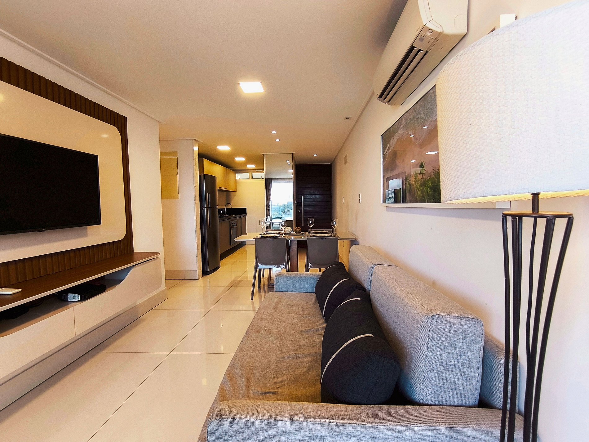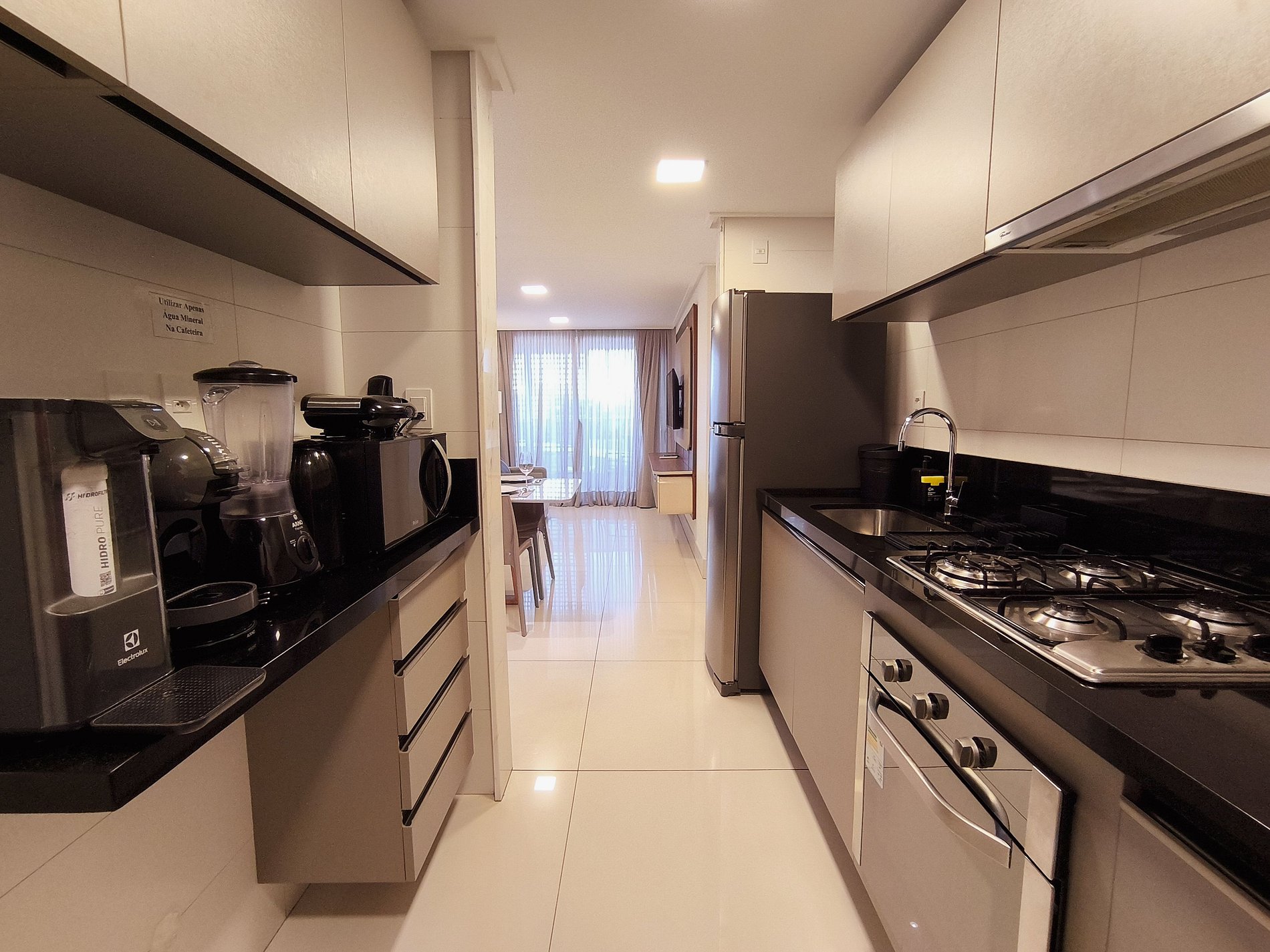 O apartamento possui uma suíte disponível para os hóspedes, com cama queen size, escrivaninha para trabalho e SmarTv. Sala de estar com sofa, smart tv e ar condicionado, mesa com quatro cadeiras, cozinha completa com talheres, potes e panelas. Há um segundo banheiro: o social. Por fim, um segundo quarto com cama de casal.