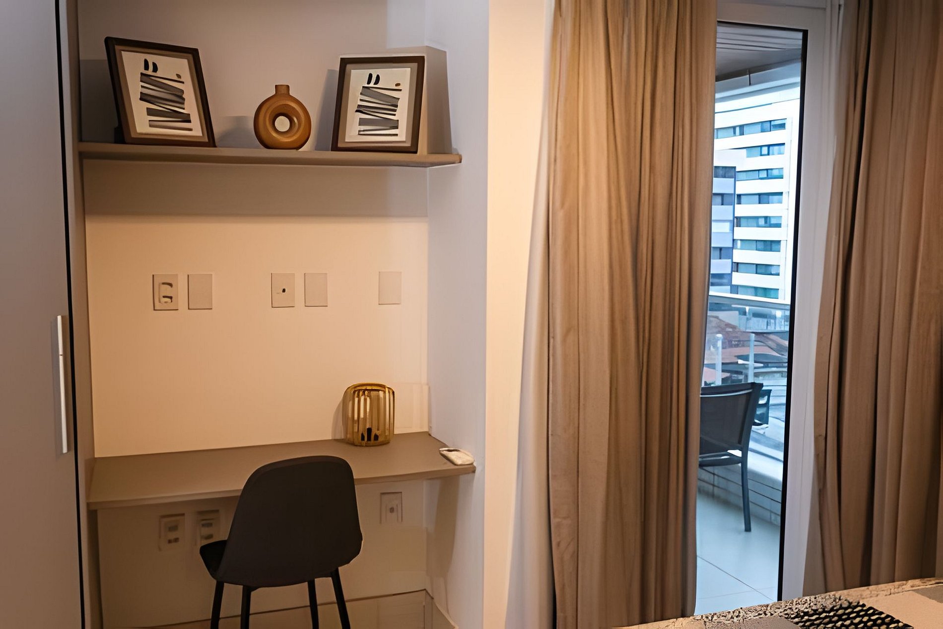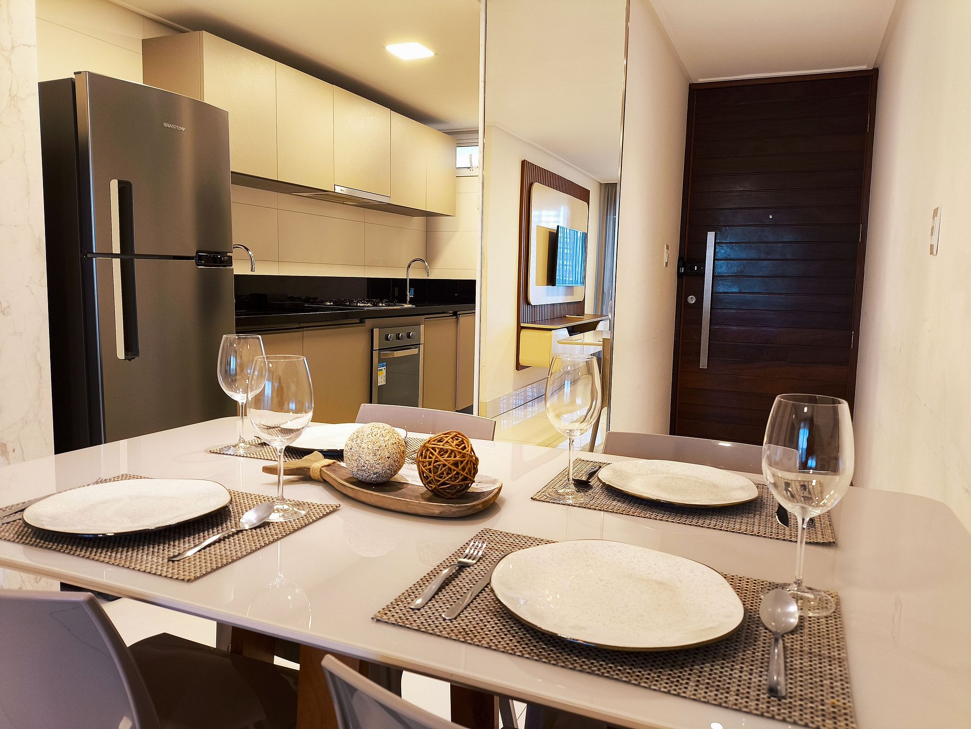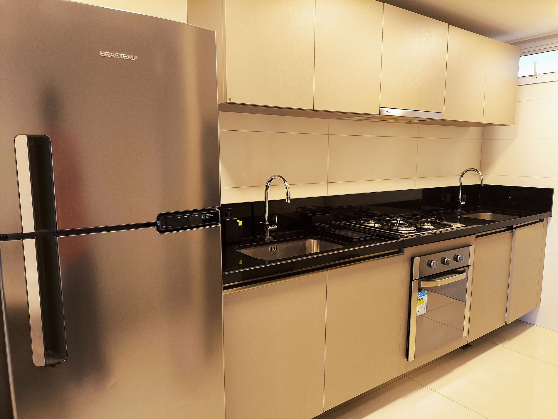 O apartamento possui uma suíte disponível para os hóspedes, com cama queen size, escrivaninha para trabalho e SmarTv. Sala de estar com sofa, smart tv e ar condicionado, mesa com quatro cadeiras, cozinha completa com talheres, potes e panelas. Há um segundo banheiro: o social. Por fim, um segundo quarto com cama de casal.