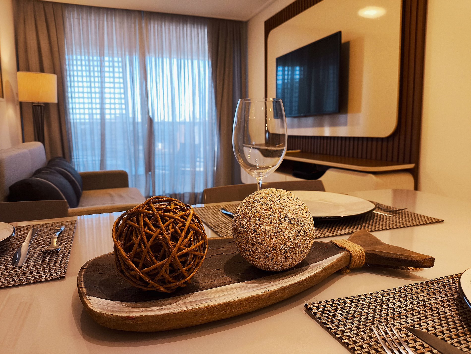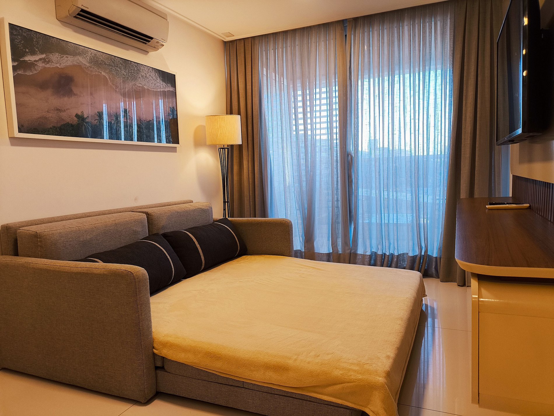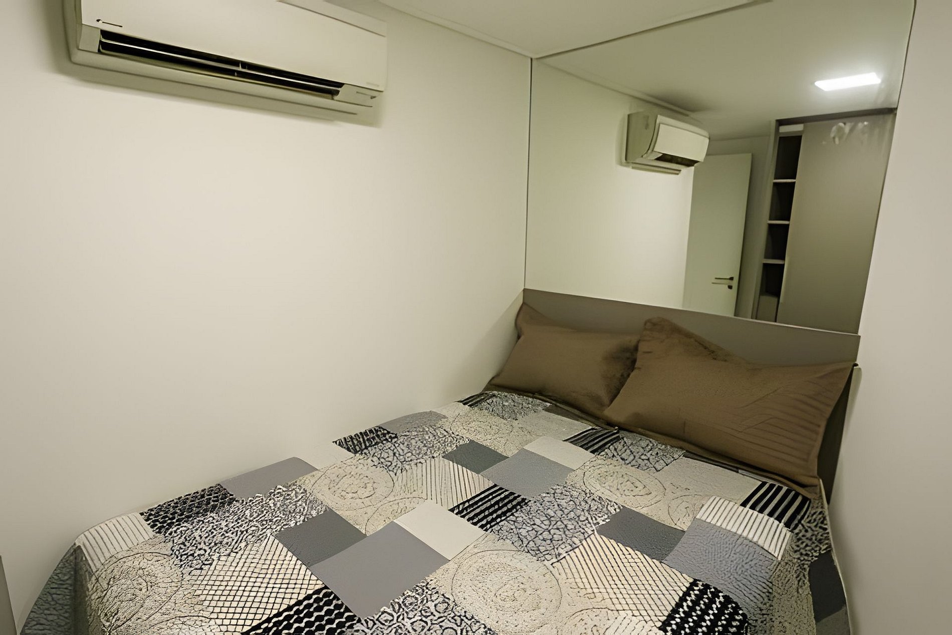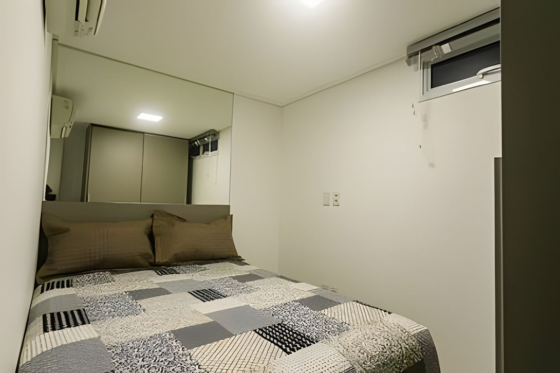O apartamento possui uma suíte disponível para os hóspedes, com cama queen size, escrivaninha para trabalho e SmarTv. Sala de estar com sofa, smart tv e ar condicionado, mesa com quatro cadeiras, cozinha completa com talheres, potes e panelas. Há um segundo banheiro: o social. Por fim, um segundo quarto com cama de casal.