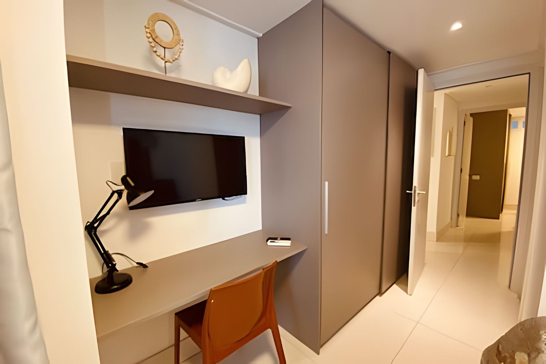 O apartamento possui uma suíte disponível para os hóspedes, com cama queen size, escrivaninha para trabalho e SmarTv. Sala de estar com sofa, smart tv e ar condicionado, mesa com quatro cadeiras, cozinha completa com talheres, potes e panelas. Há um segundo banheiro: o social. Por fim, um segundo quarto com cama de casal.
