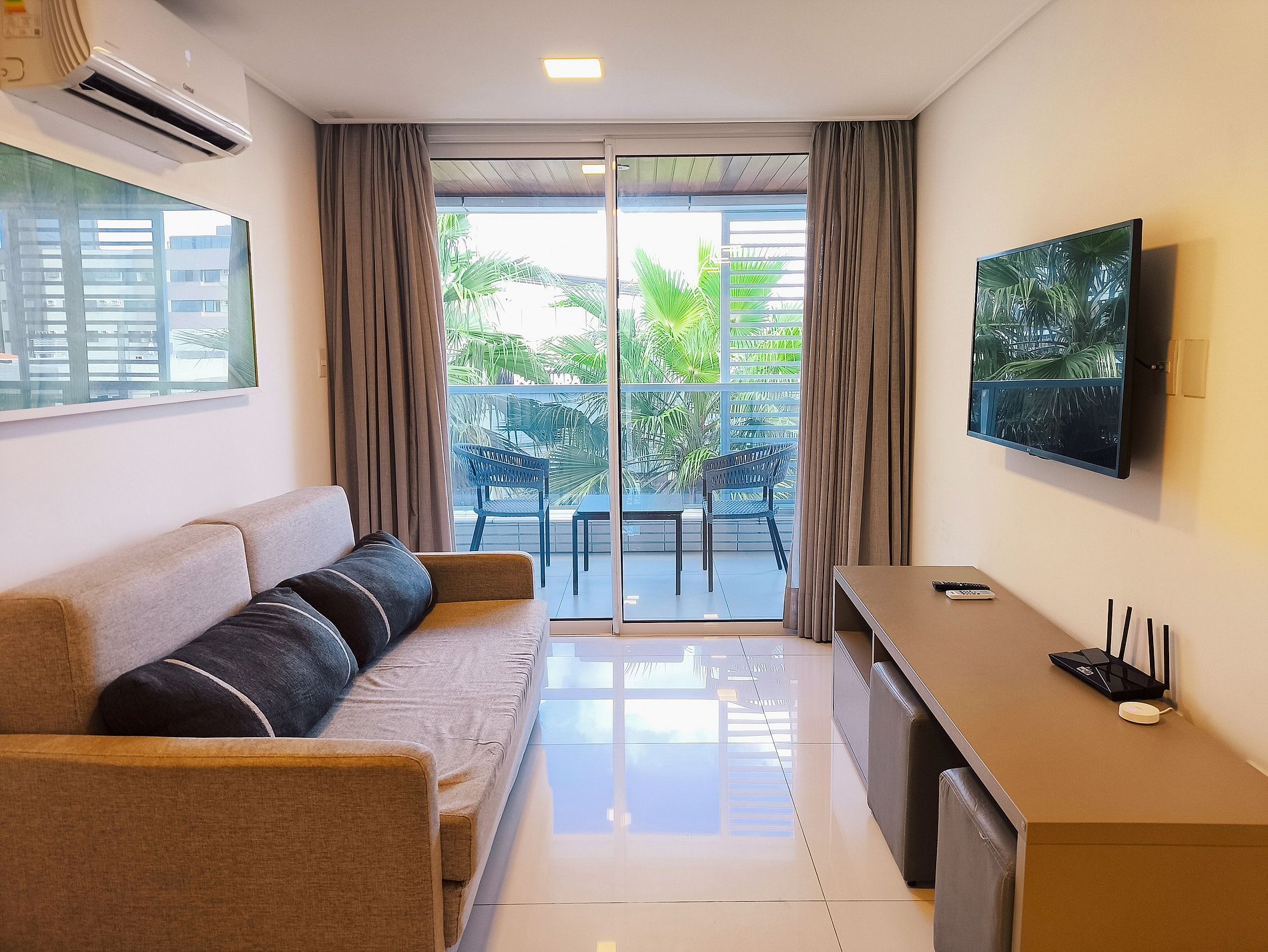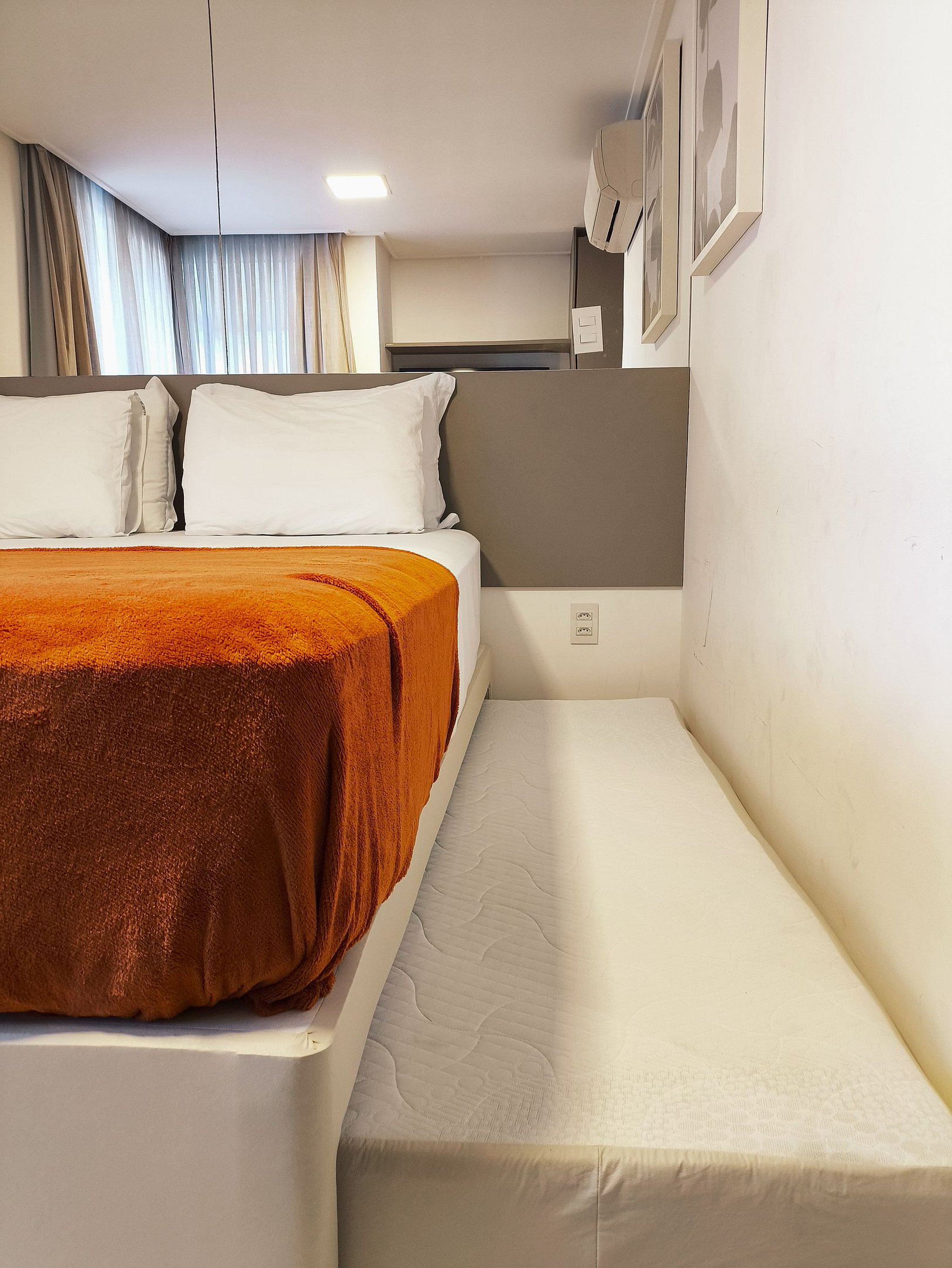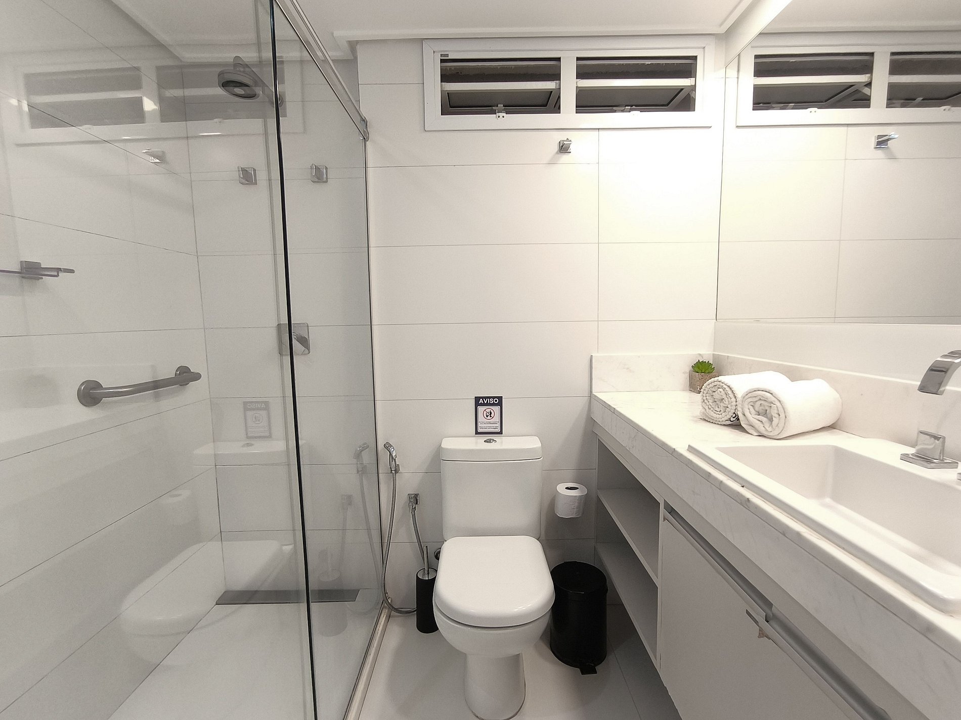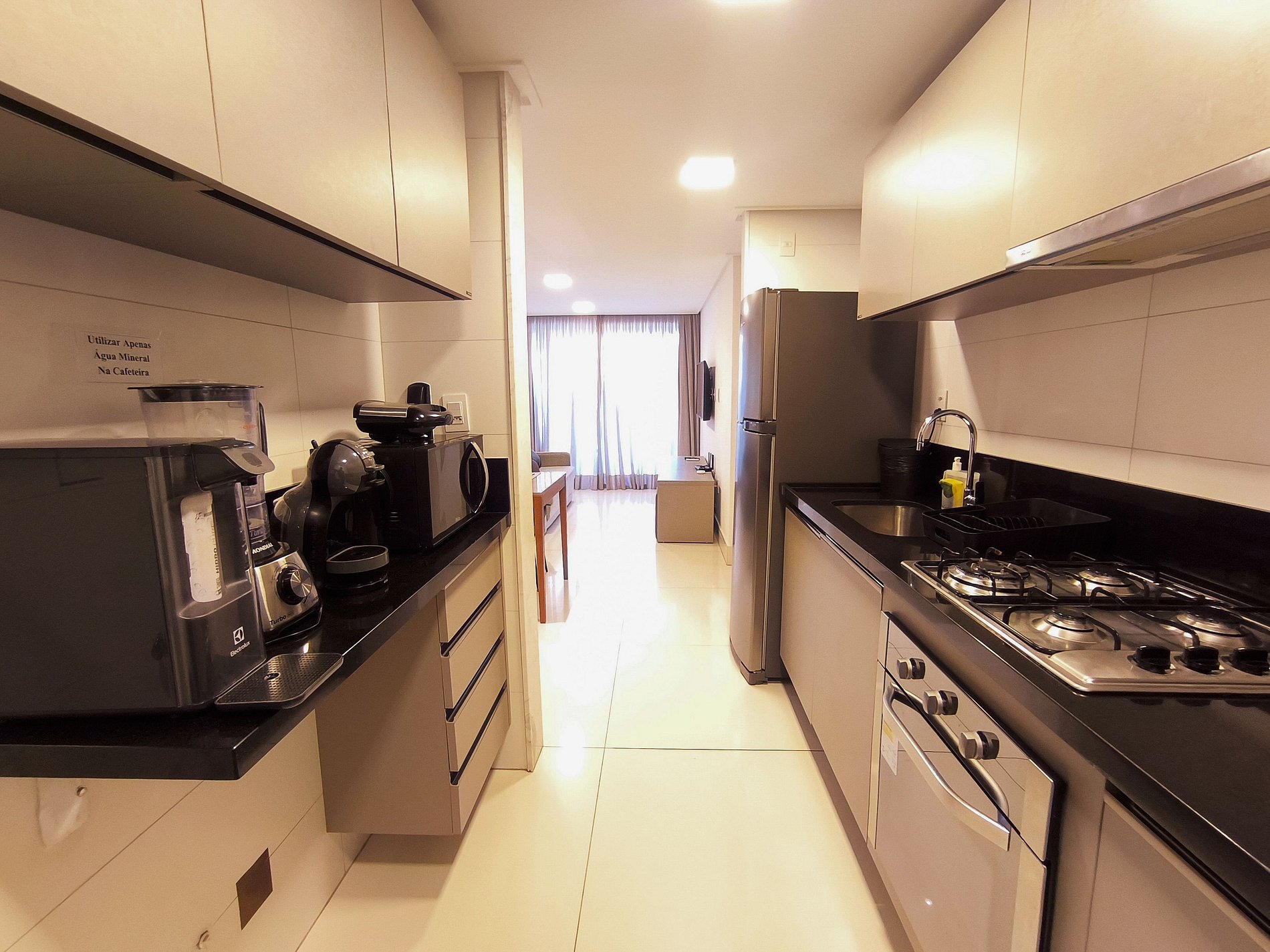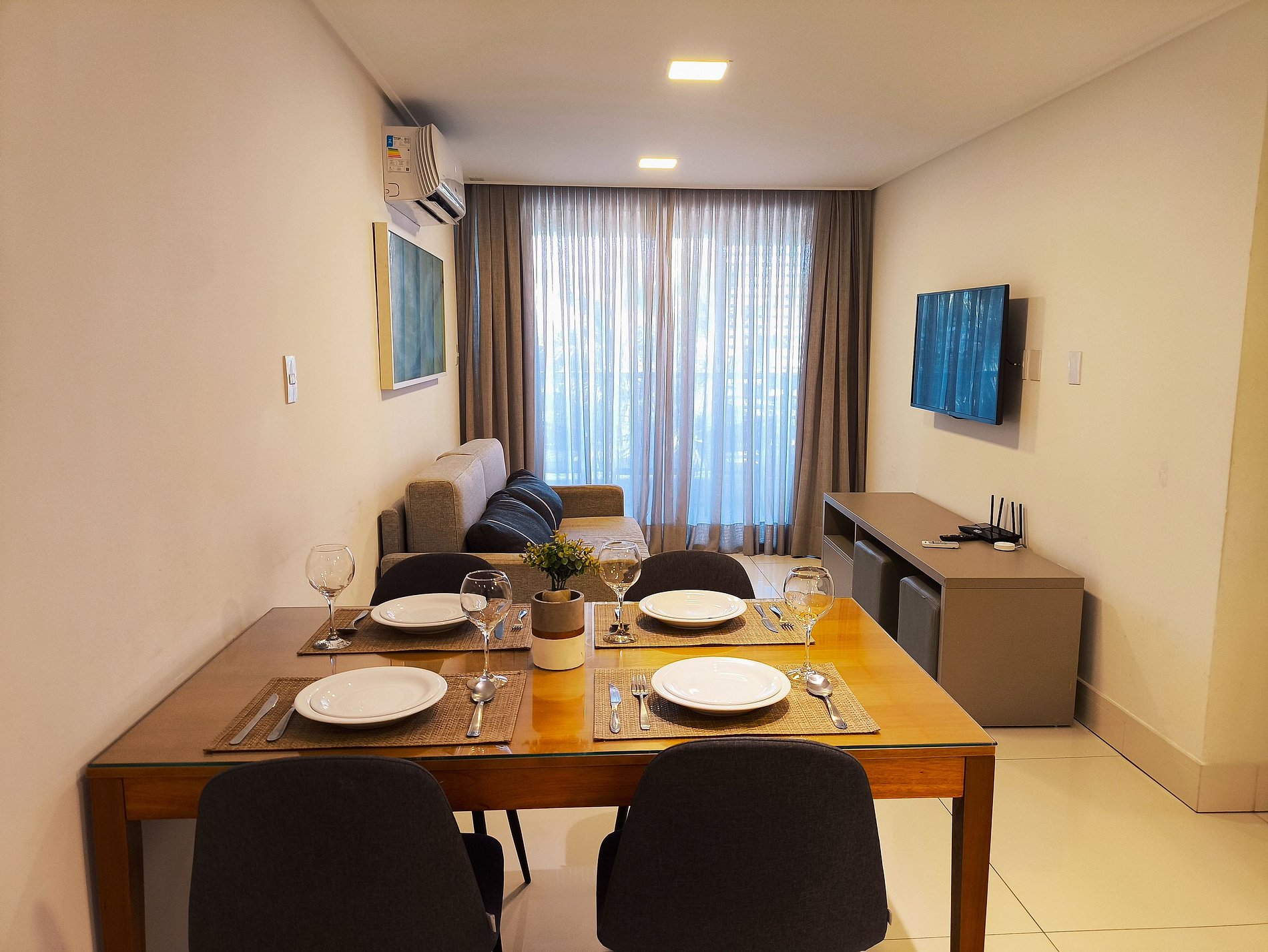 O apartamento possui uma suíte disponível para os hóspedes, com cama queen size, escrivaninha para trabalho e SmarTv. Sala de estar com sofa, smart tv e ar condicionado, mesa com quatro cadeiras, cozinha completa com talheres, potes e panelas. Há um segundo banheiro: o social. Por fim, um segundo quarto com cama de casal.