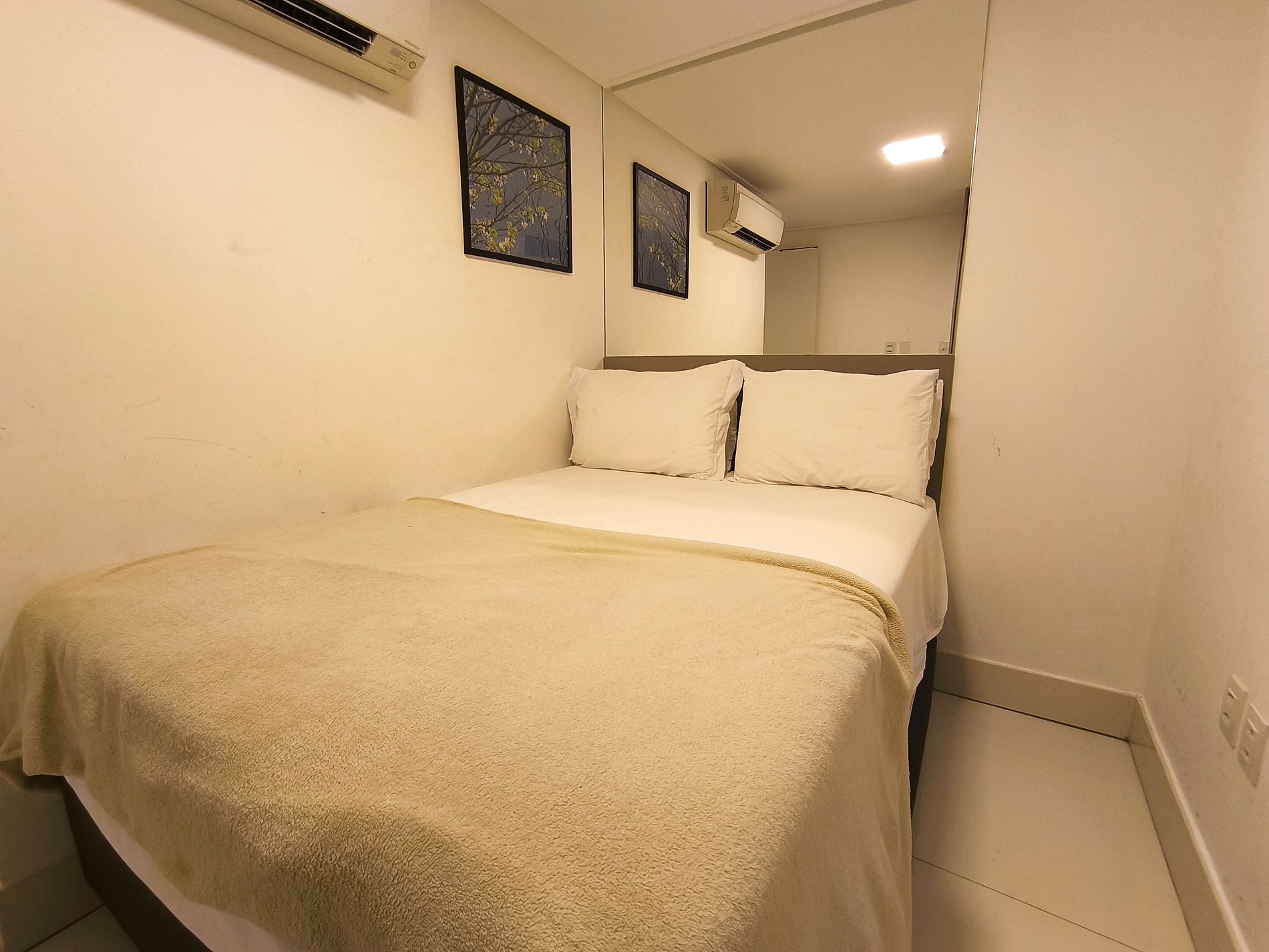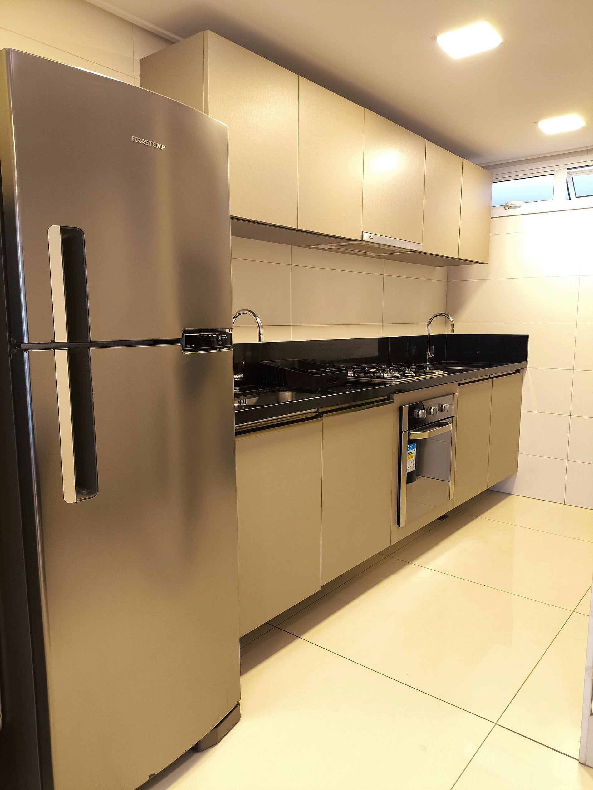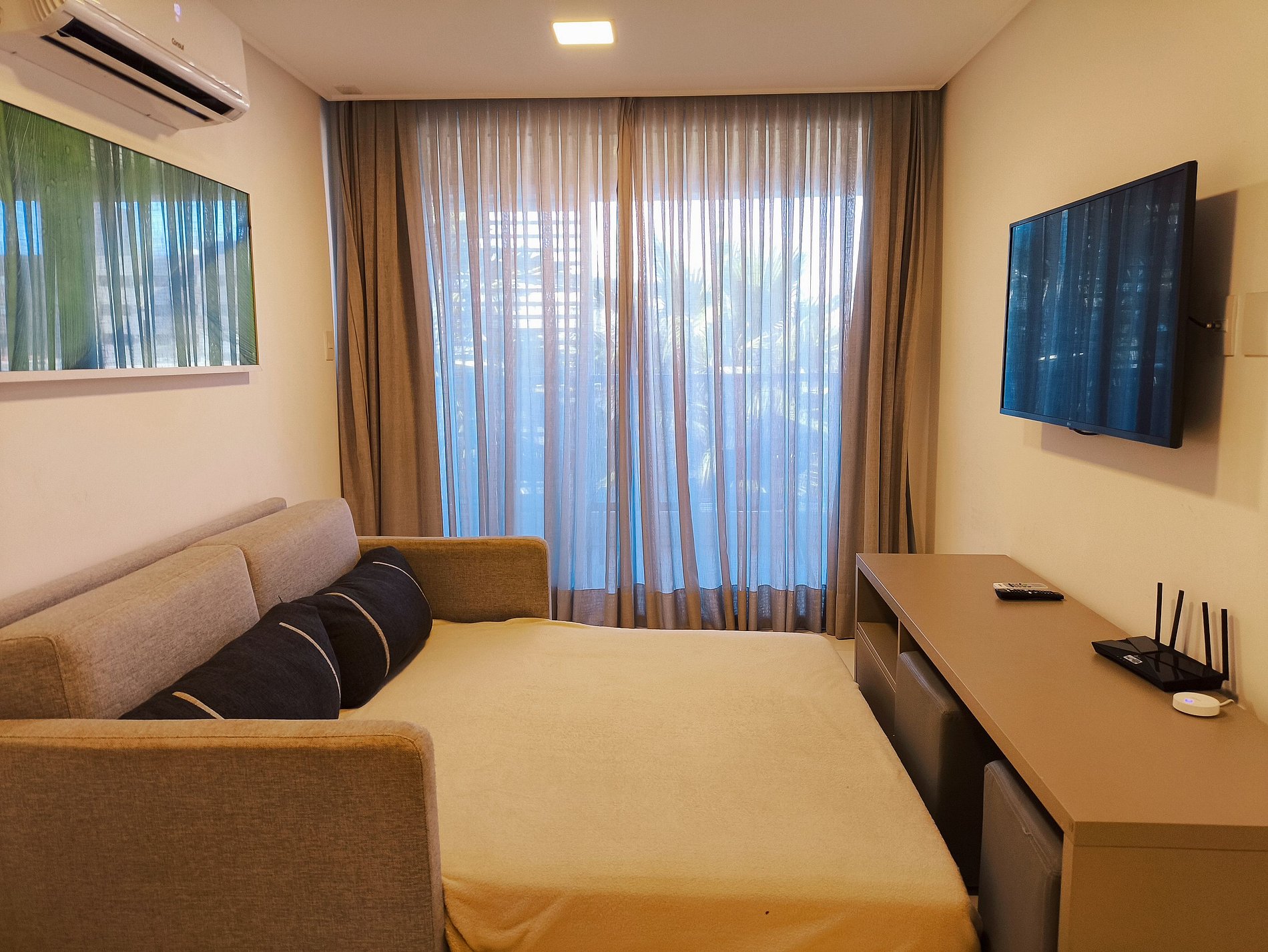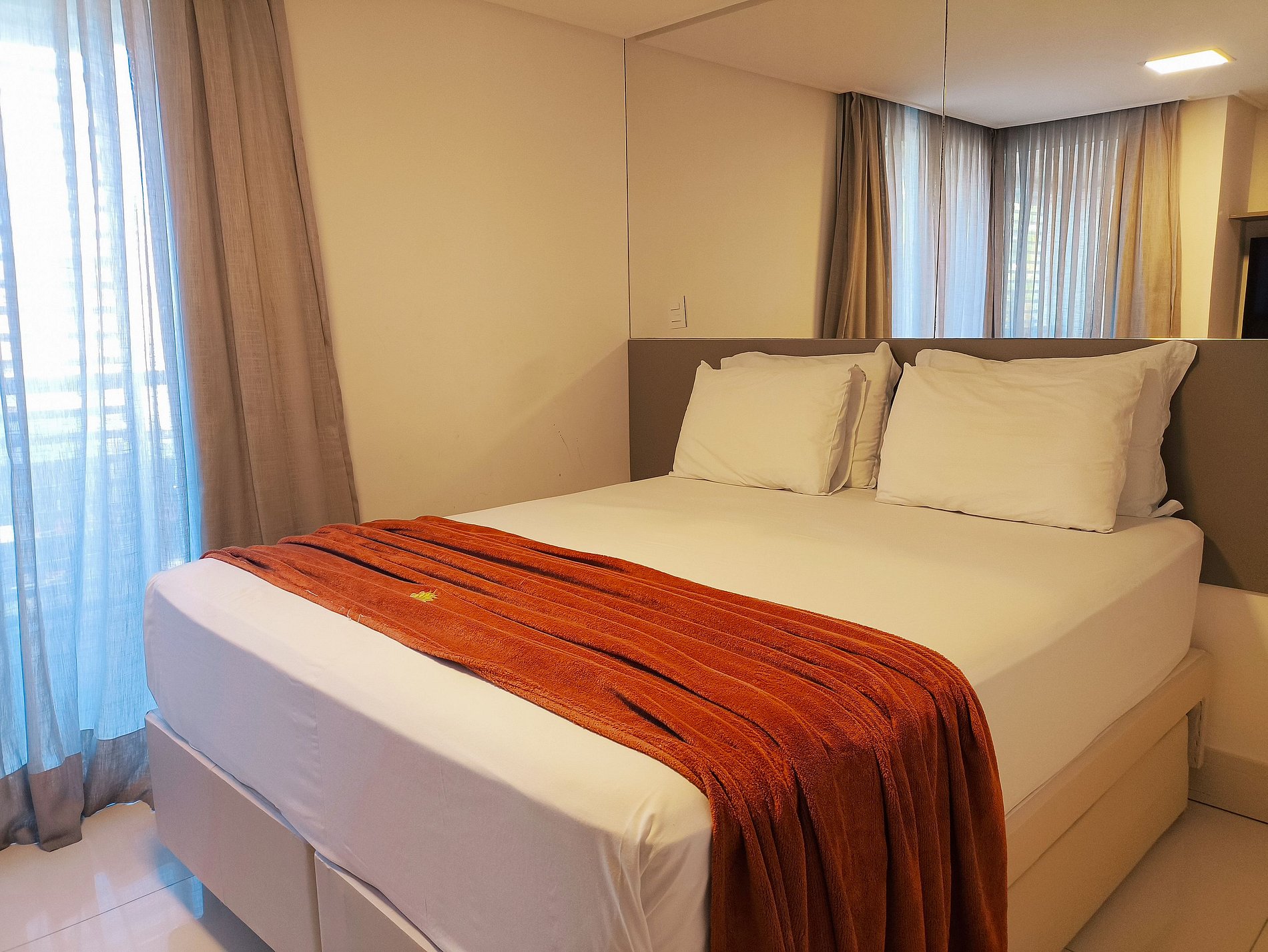 O apartamento possui uma suíte disponível para os hóspedes, com cama queen size, escrivaninha para trabalho e SmarTv. Sala de estar com sofa, smart tv e ar condicionado, mesa com quatro cadeiras, cozinha completa com talheres, potes e panelas. Há um segundo banheiro: o social. Por fim, um segundo quarto com cama de casal.