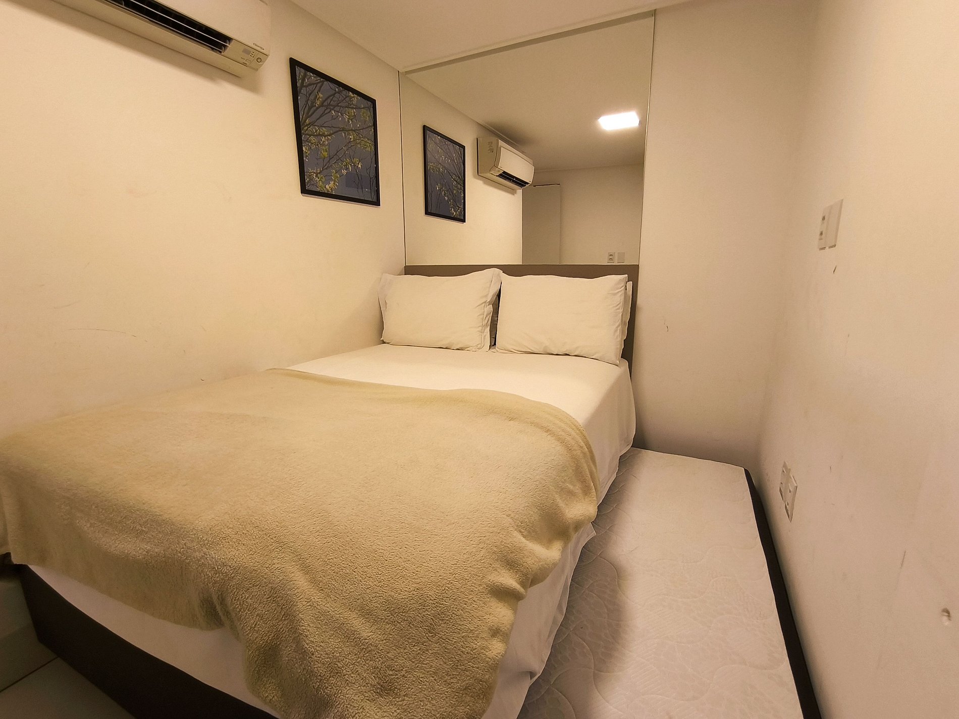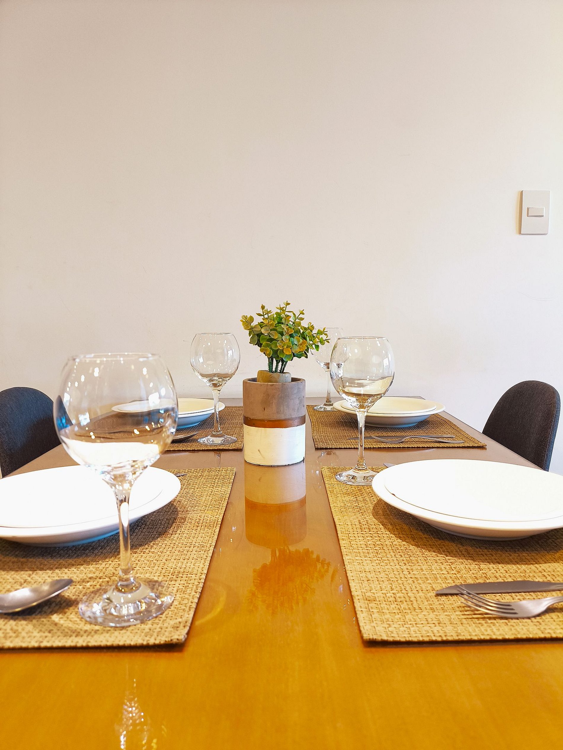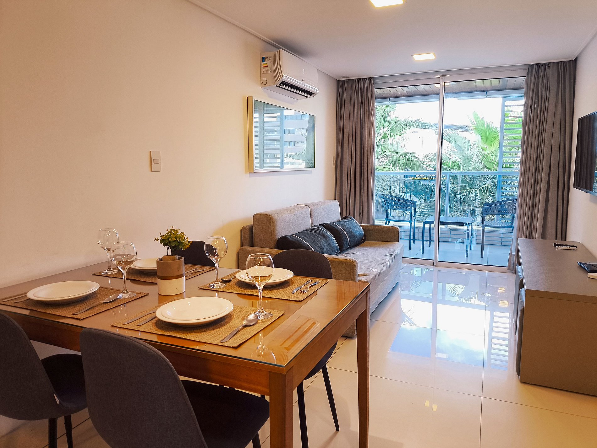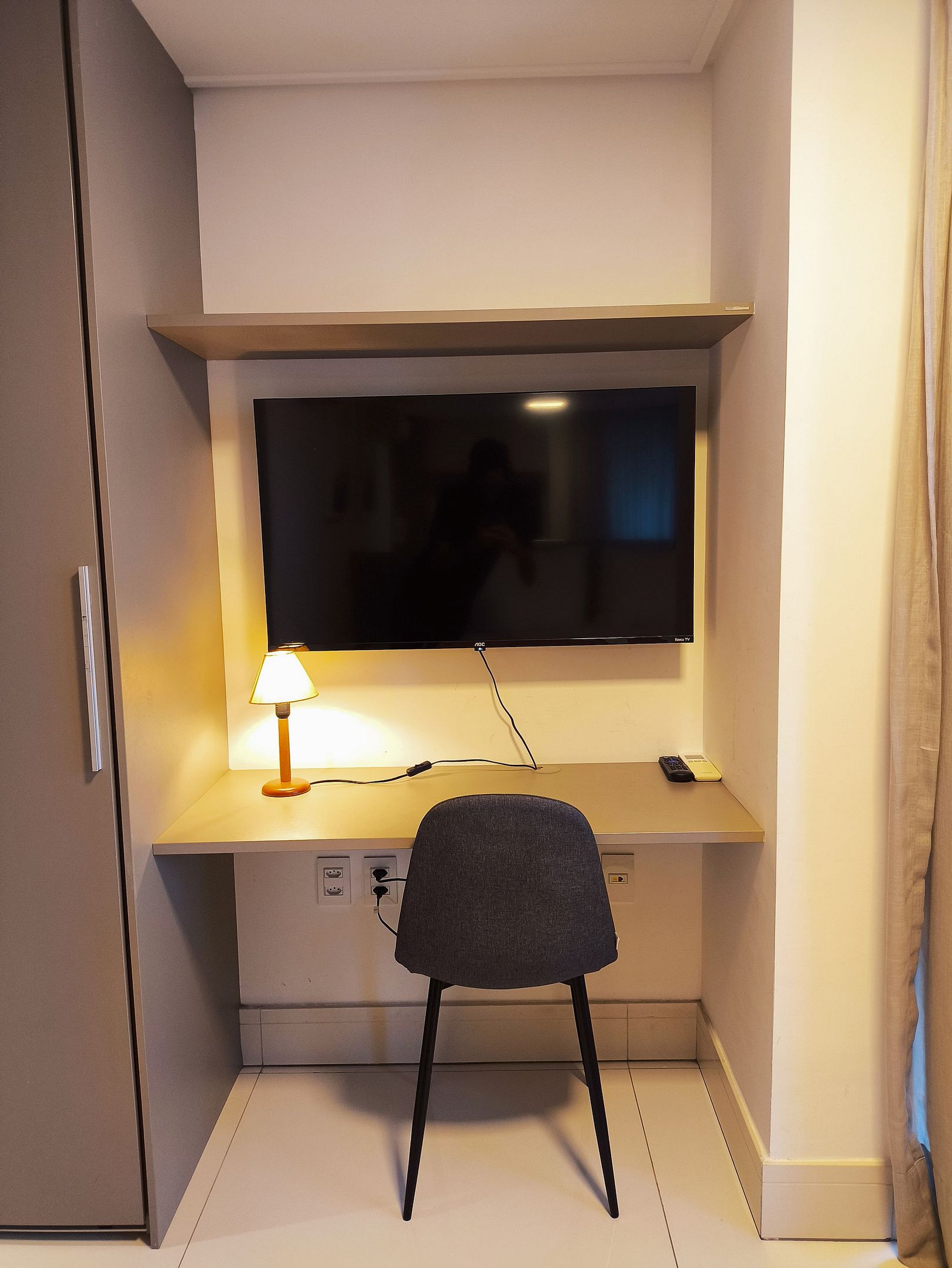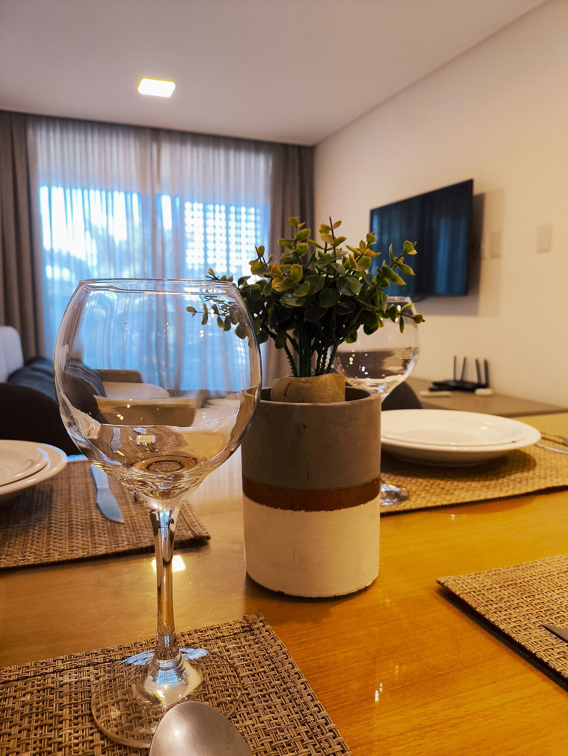 O apartamento possui uma suíte disponível para os hóspedes, com cama queen size, escrivaninha para trabalho e SmarTv. Sala de estar com sofa, smart tv e ar condicionado, mesa com quatro cadeiras, cozinha completa com talheres, potes e panelas. Há um segundo banheiro: o social. Por fim, um segundo quarto com cama de casal.