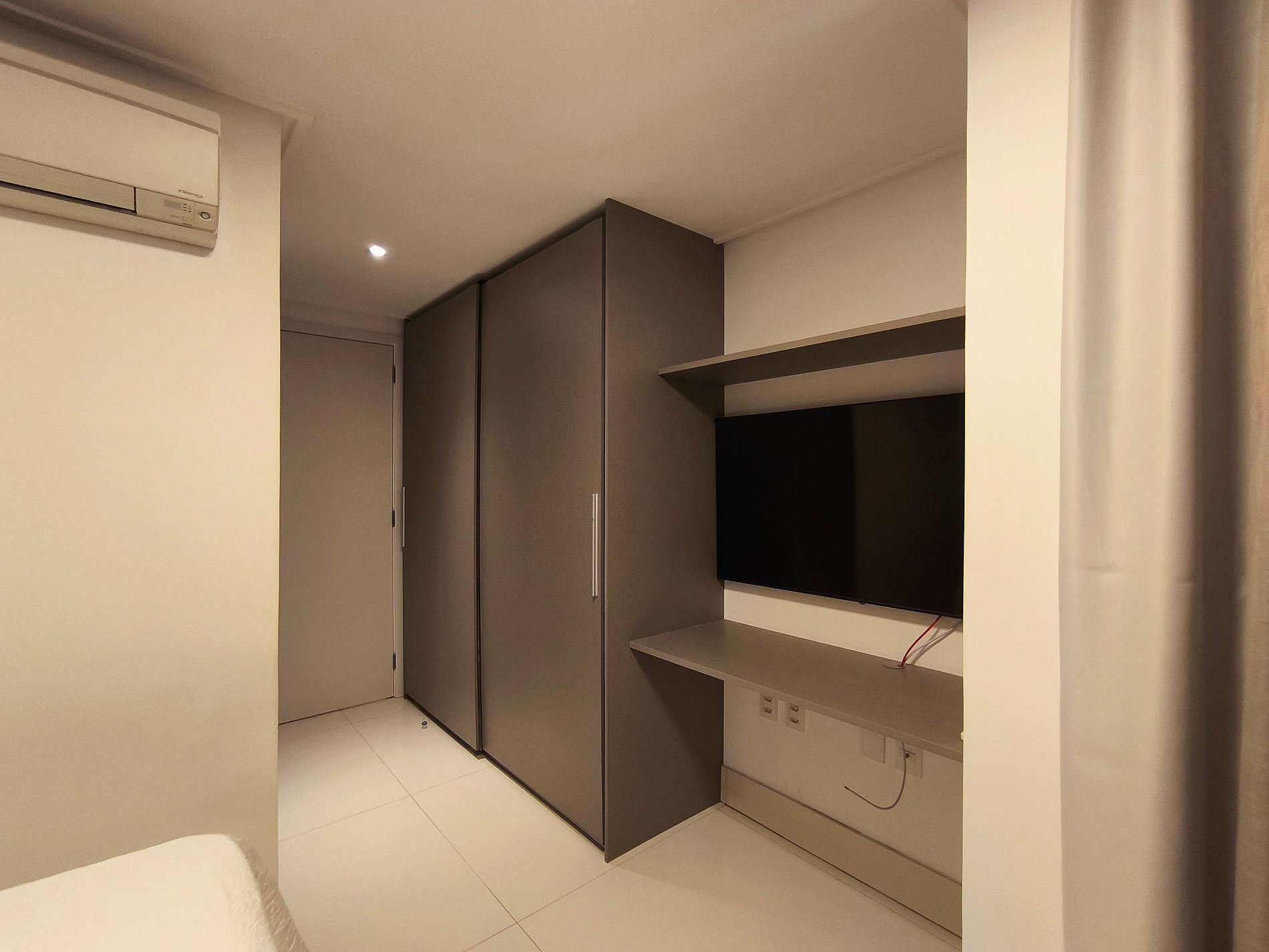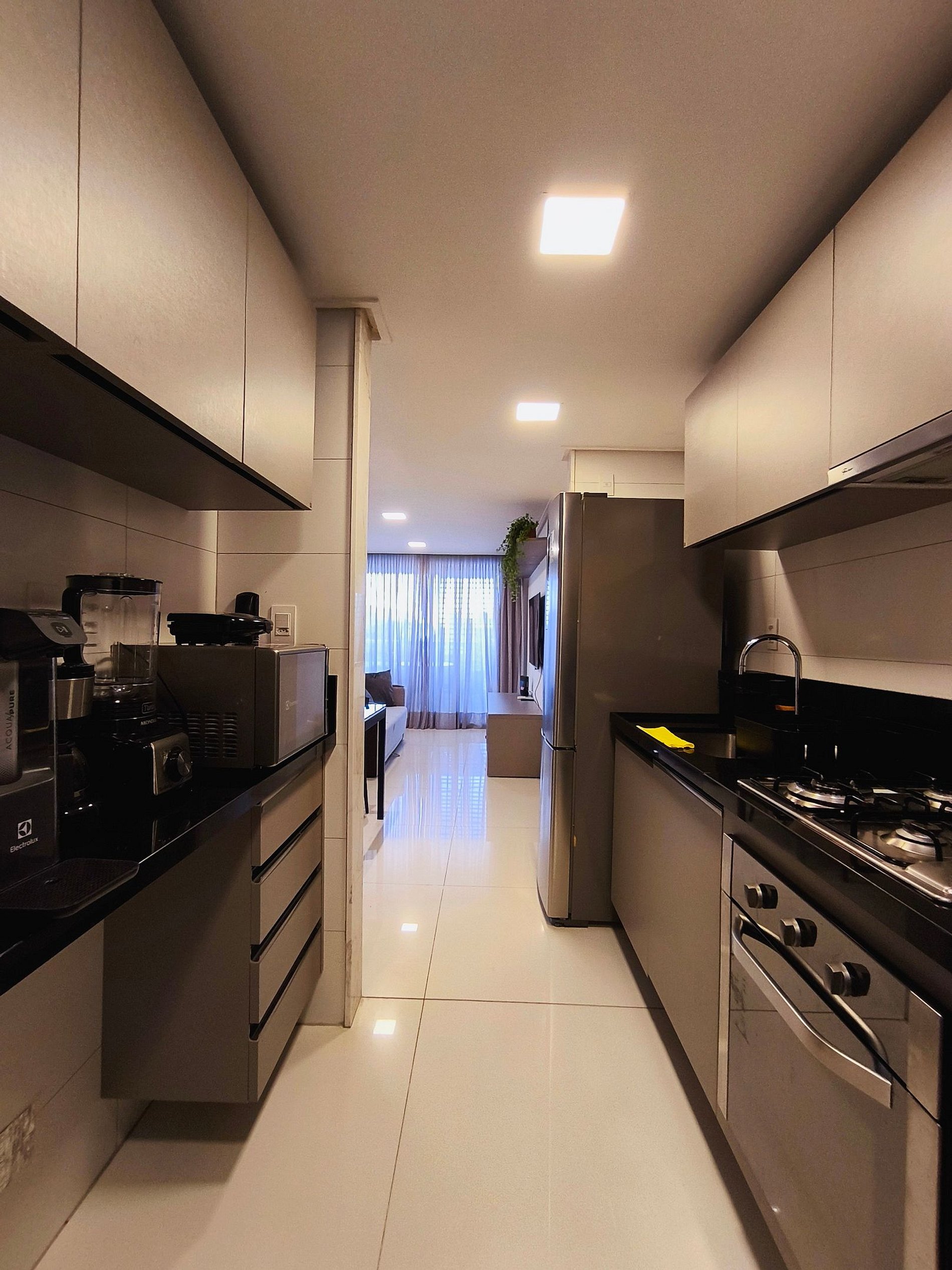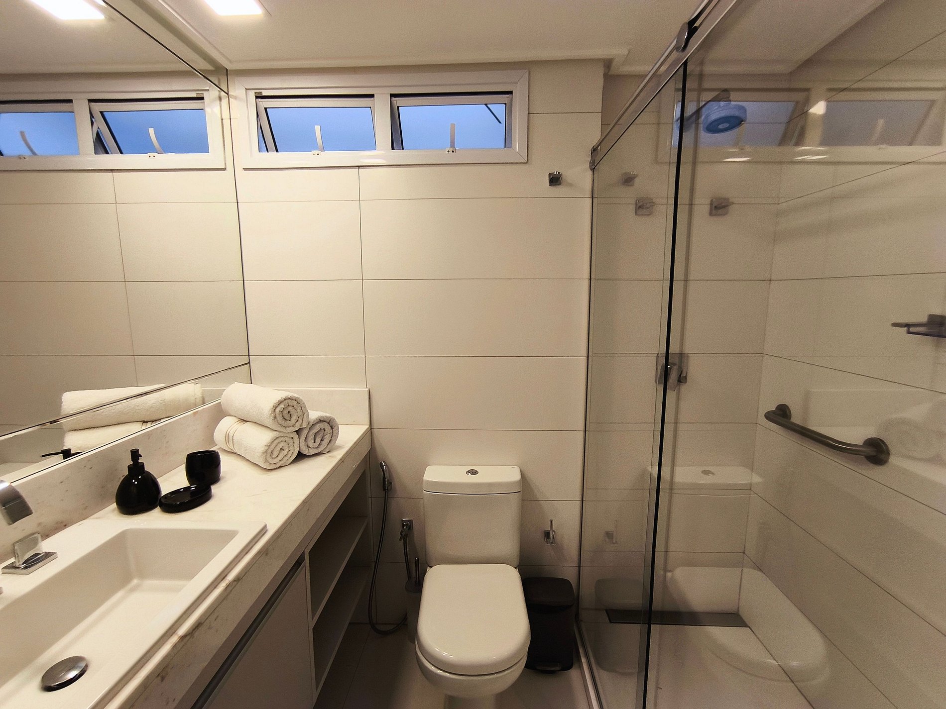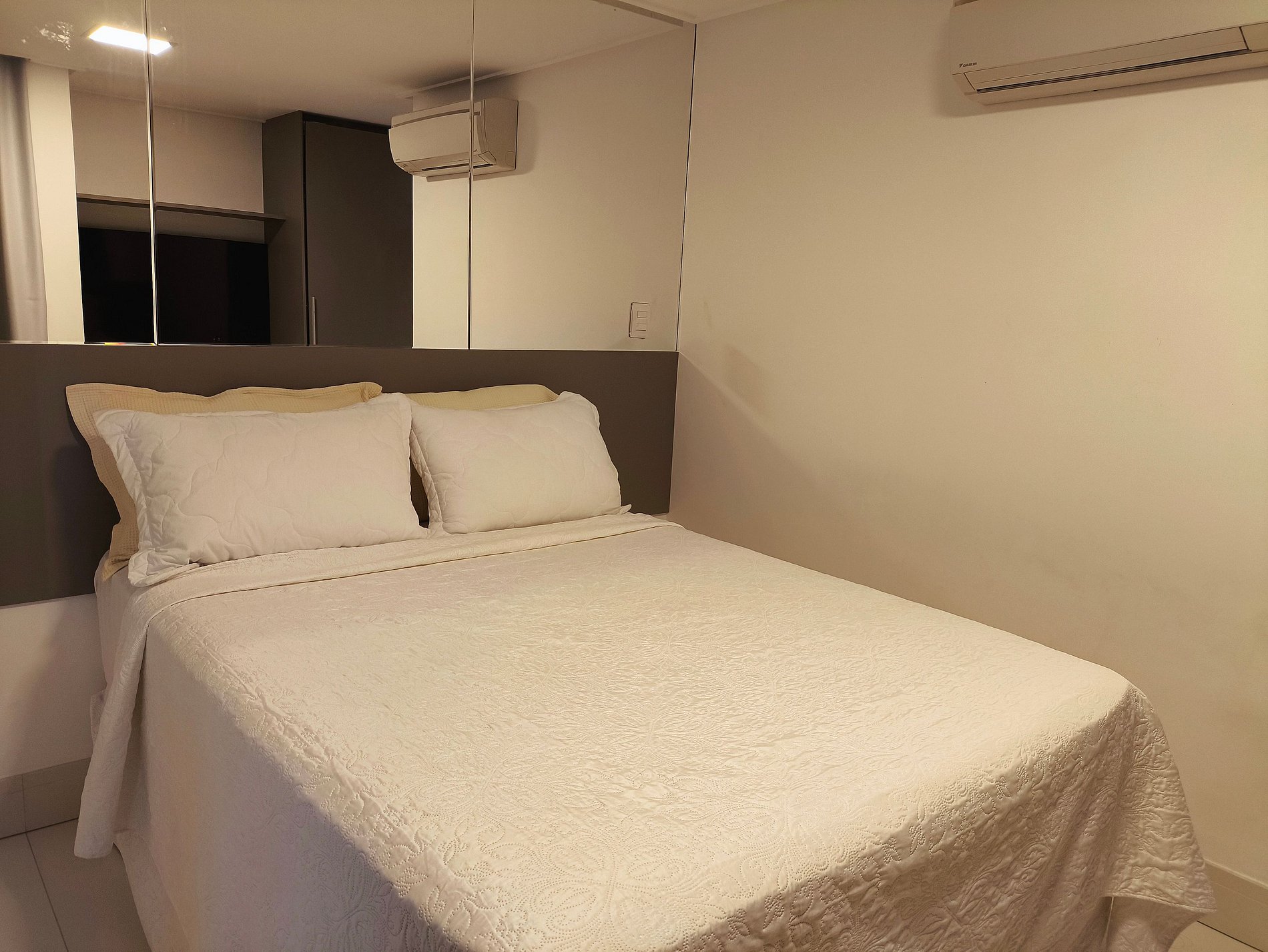 O apartamento possui uma suíte disponível para os hóspedes, com cama queen size com uma cama auxiliar de solteiro, escrivaninha para trabalho e SmarTv. Sala de estar com sofa, smart tv e ar condicionado, mesa com quatro cadeiras, cozinha completa com talheres, potes e panelas. Há um segundo banheiro: o social. Por fim, um segundo quarto com cama de casal também com uma cama auxiliar de solteiro.