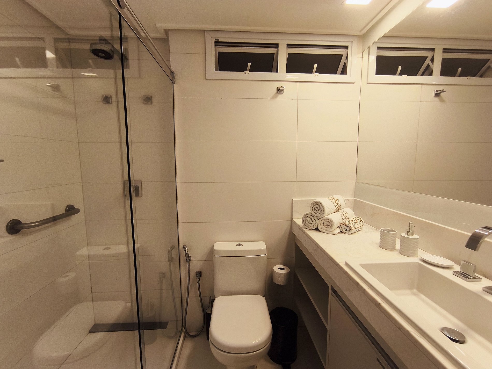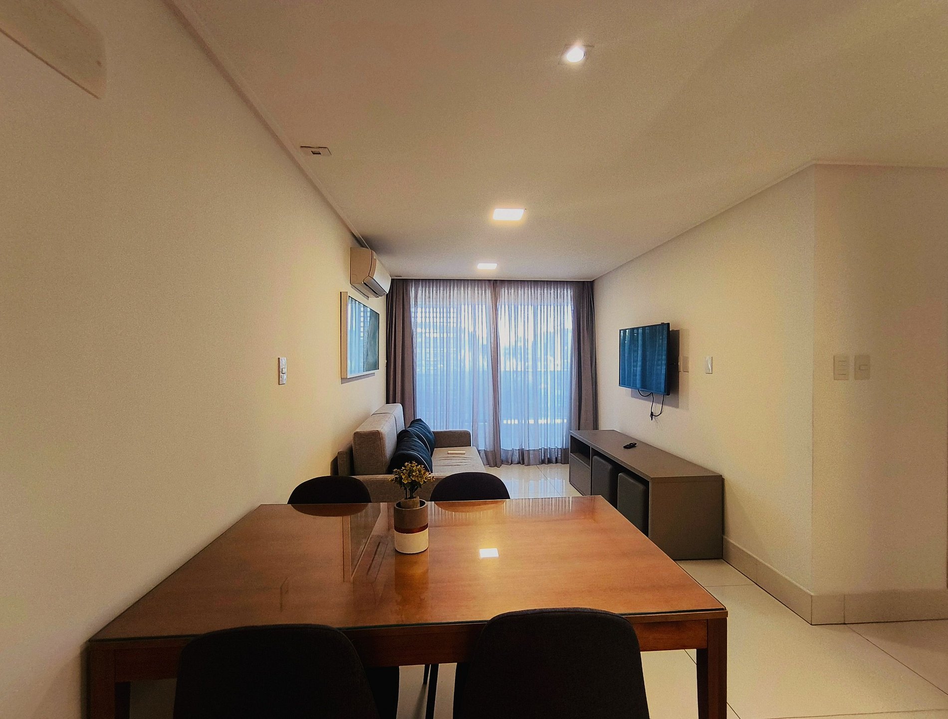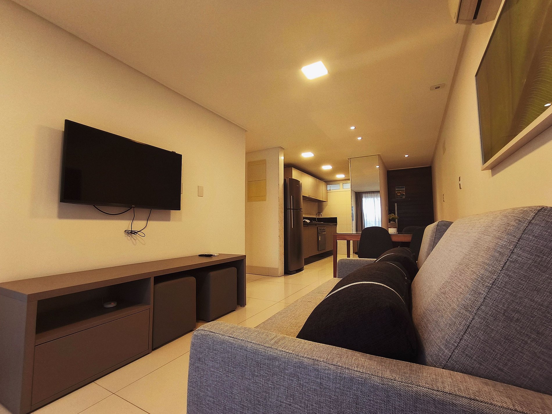 O apartamento possui uma suíte disponível para os hóspedes, com cama queen size, escrivaninha para trabalho e SmarTv. Sala de estar com sofa, smart tv e ar condicionado, mesa com quatro cadeiras, cozinha completa com talheres, potes e panelas. Há um segundo banheiro: o social. Por fim, um segundo quarto com cama de casal.