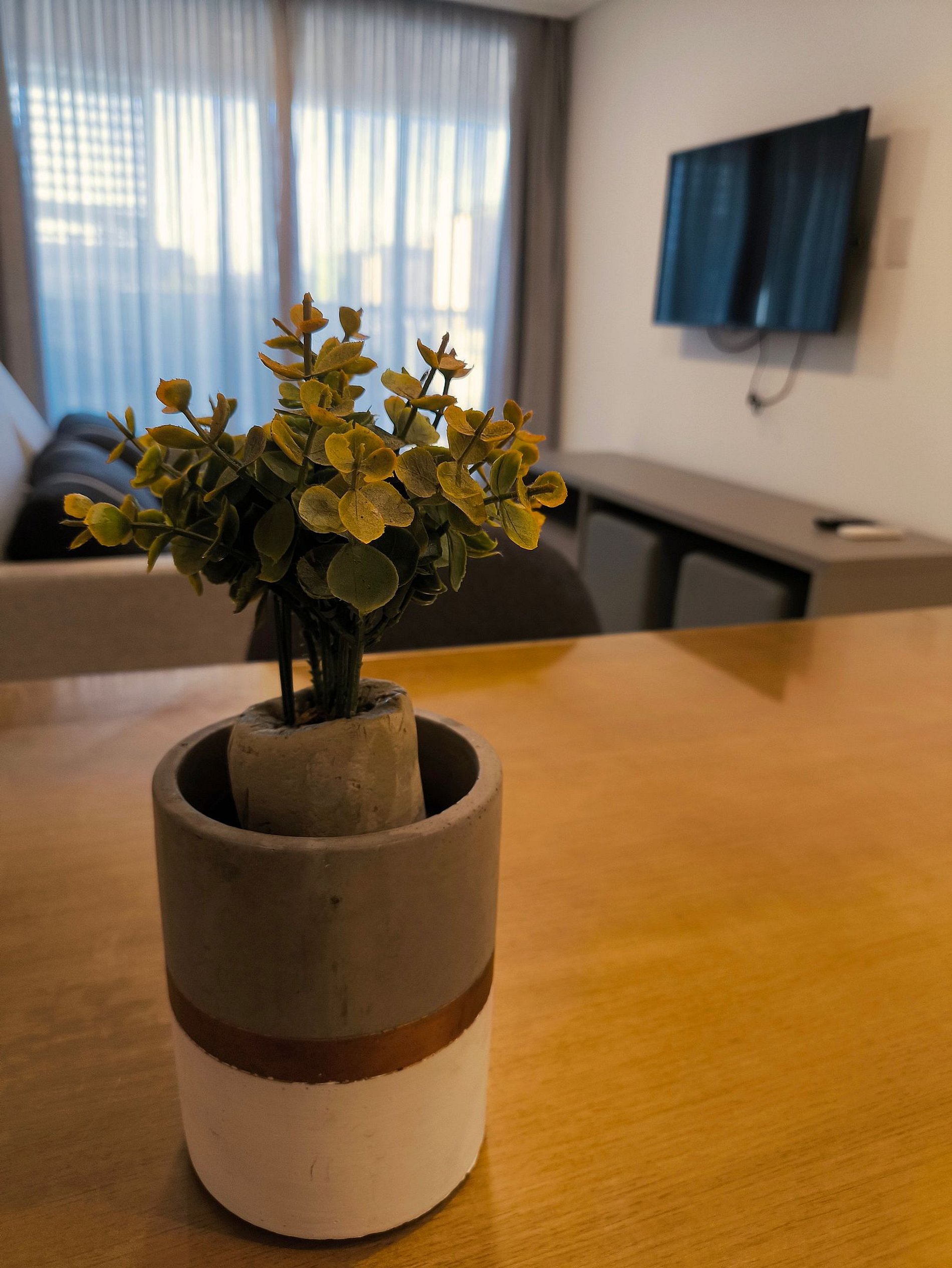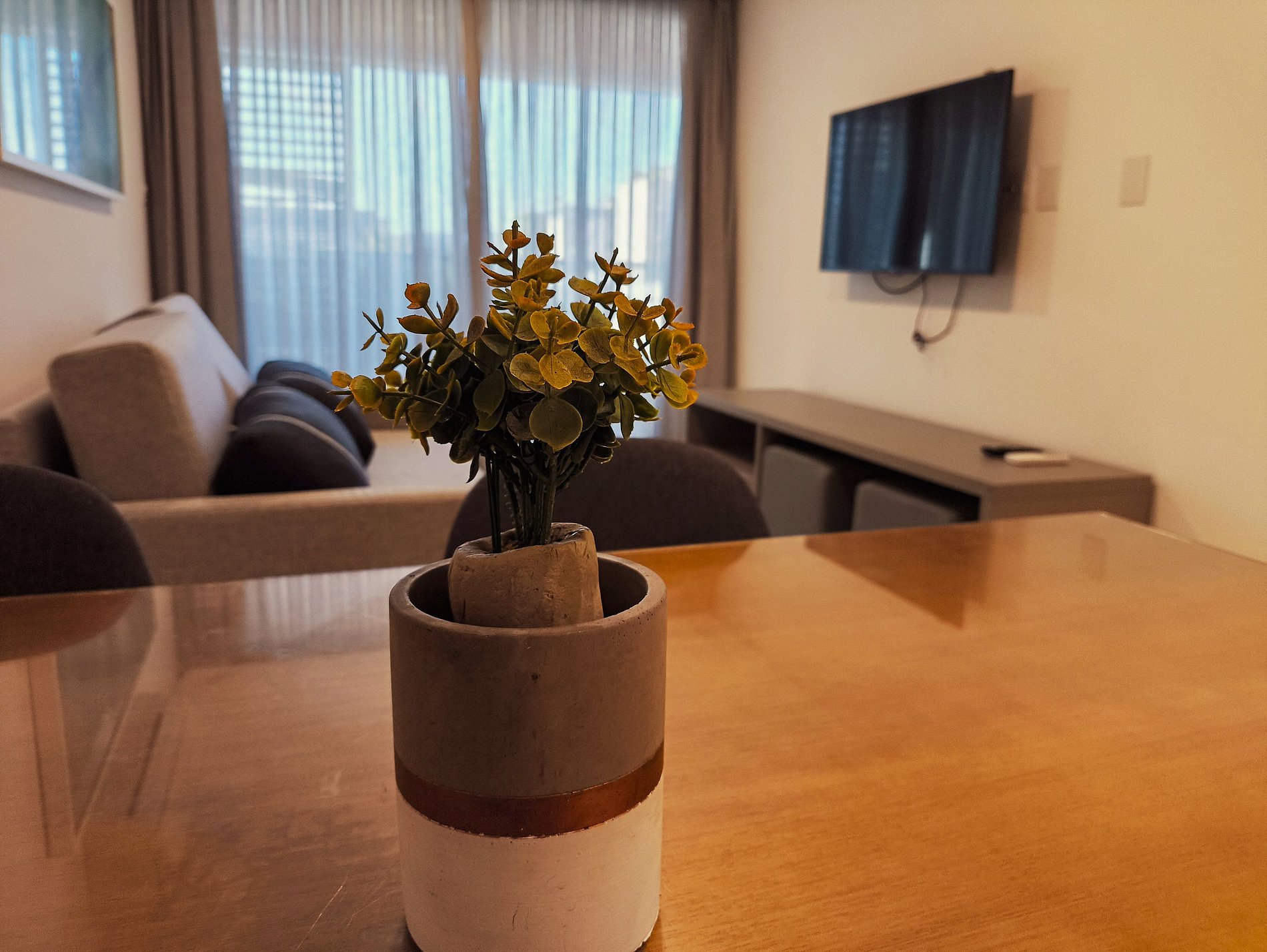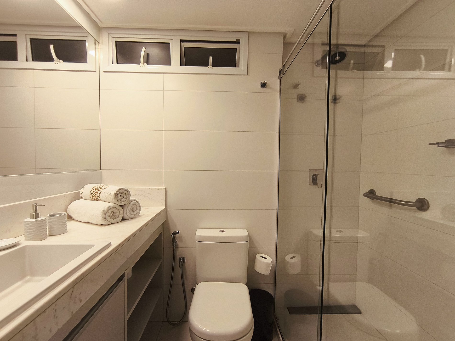 O apartamento possui uma suíte disponível para os hóspedes, com cama queen size, escrivaninha para trabalho e SmarTv. Sala de estar com sofa, smart tv e ar condicionado, mesa com quatro cadeiras, cozinha completa com talheres, potes e panelas. Há um segundo banheiro: o social. Por fim, um segundo quarto com cama de casal.