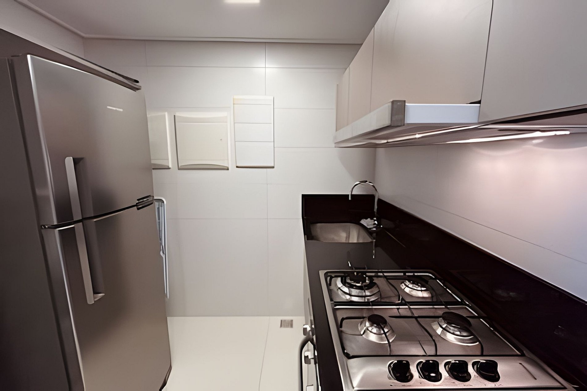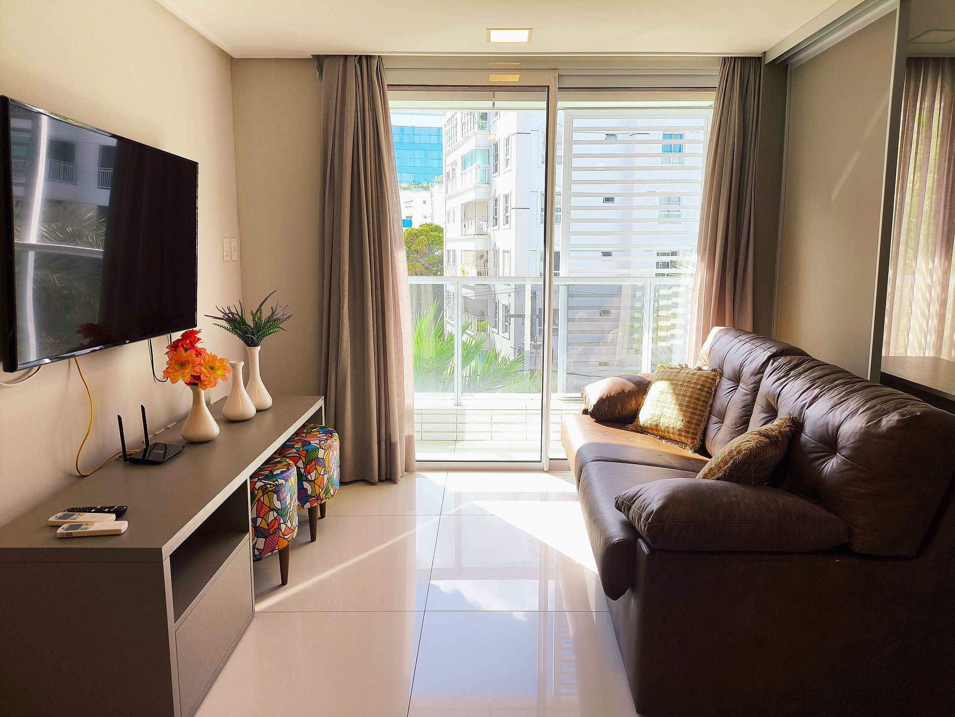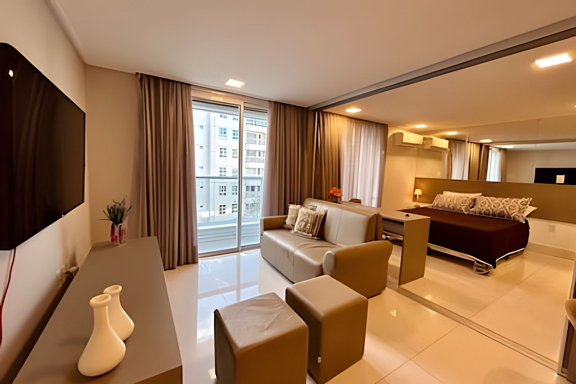 O apartamento é em estilo loft, aberto, mas que tem a opção de fechamento separando o quarto da sala, bastante útil quando hospedando mais de duas pessoas. Possui sala de estar com sofá cama, puffs, smart tv e ar condicionado, mesa com quatro cadeiras, cozinha completa com talheres, potes e panelas. Quarto com cama tamanho queen e banheiro anexo amplo.