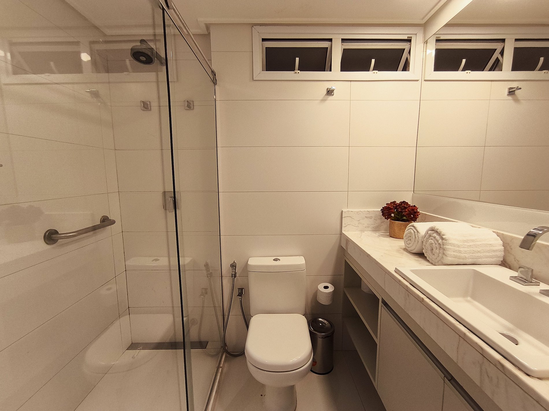 Todas as portas do apartamento são de vidro duplo, que o isolam acusticamente e mantém a temperatura interna por mais tempo.