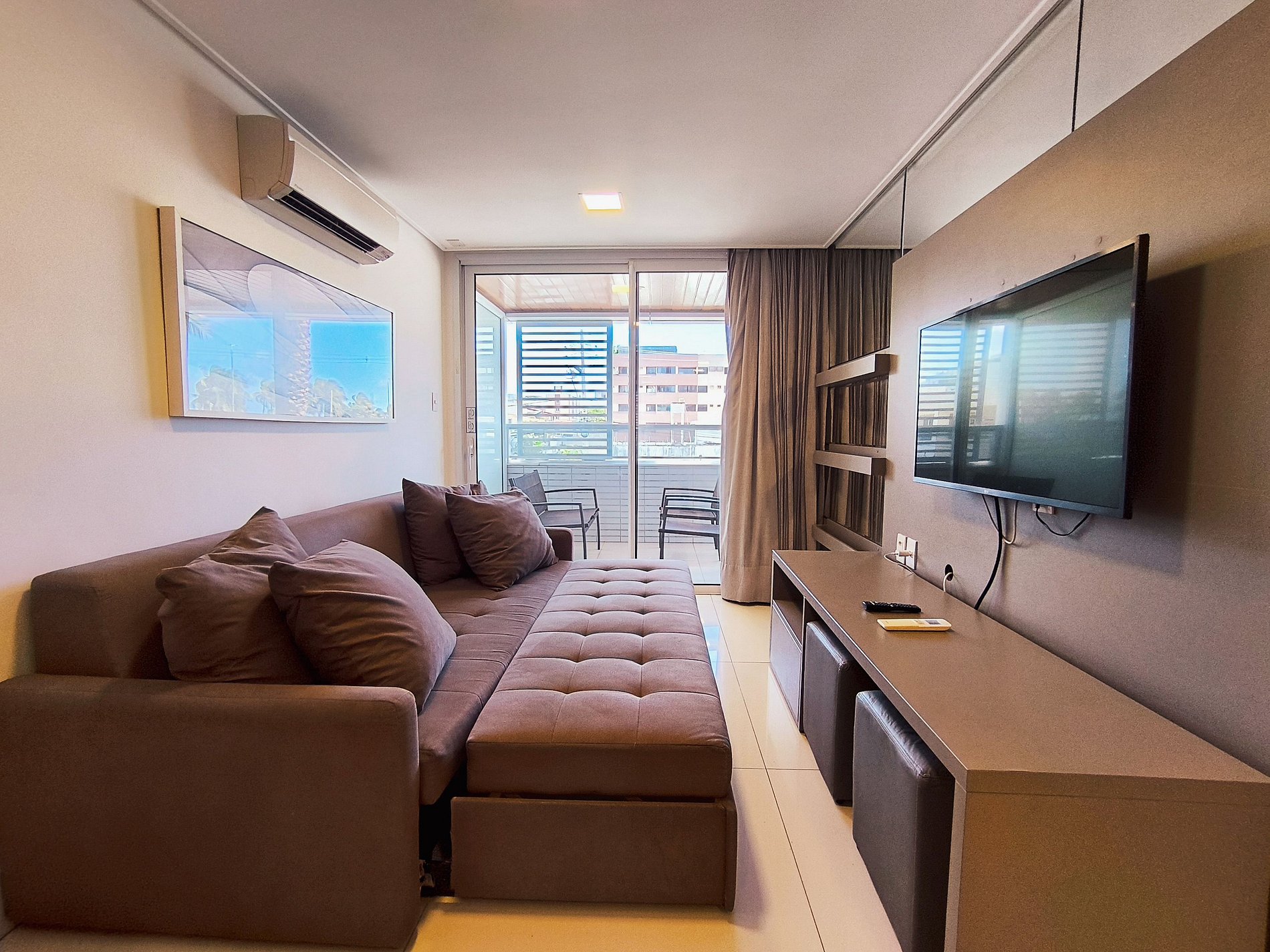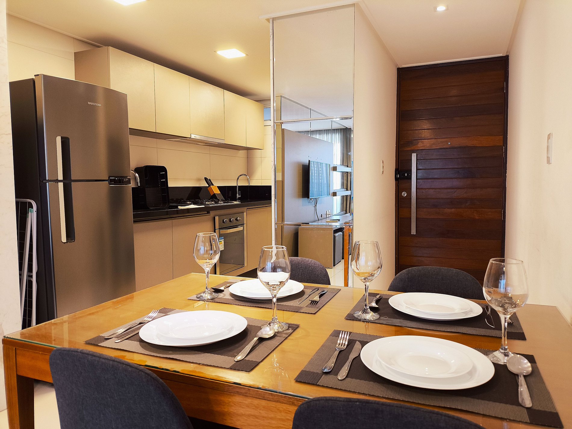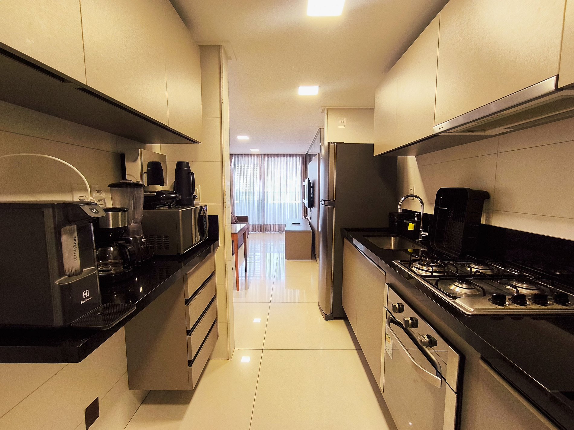 O apartamento possui uma suíte disponível para os hóspedes, com cama queen size, escrivaninha para trabalho e SmarTv. Sala de estar com sofá-cama, puffs, smart tv e ar condicionado, mesa com quatro cadeiras, cozinha completa com talheres, potes e panelas. Há um segundo banheiro: o social. Por fim, um segundo quarto com cama de solteiro.