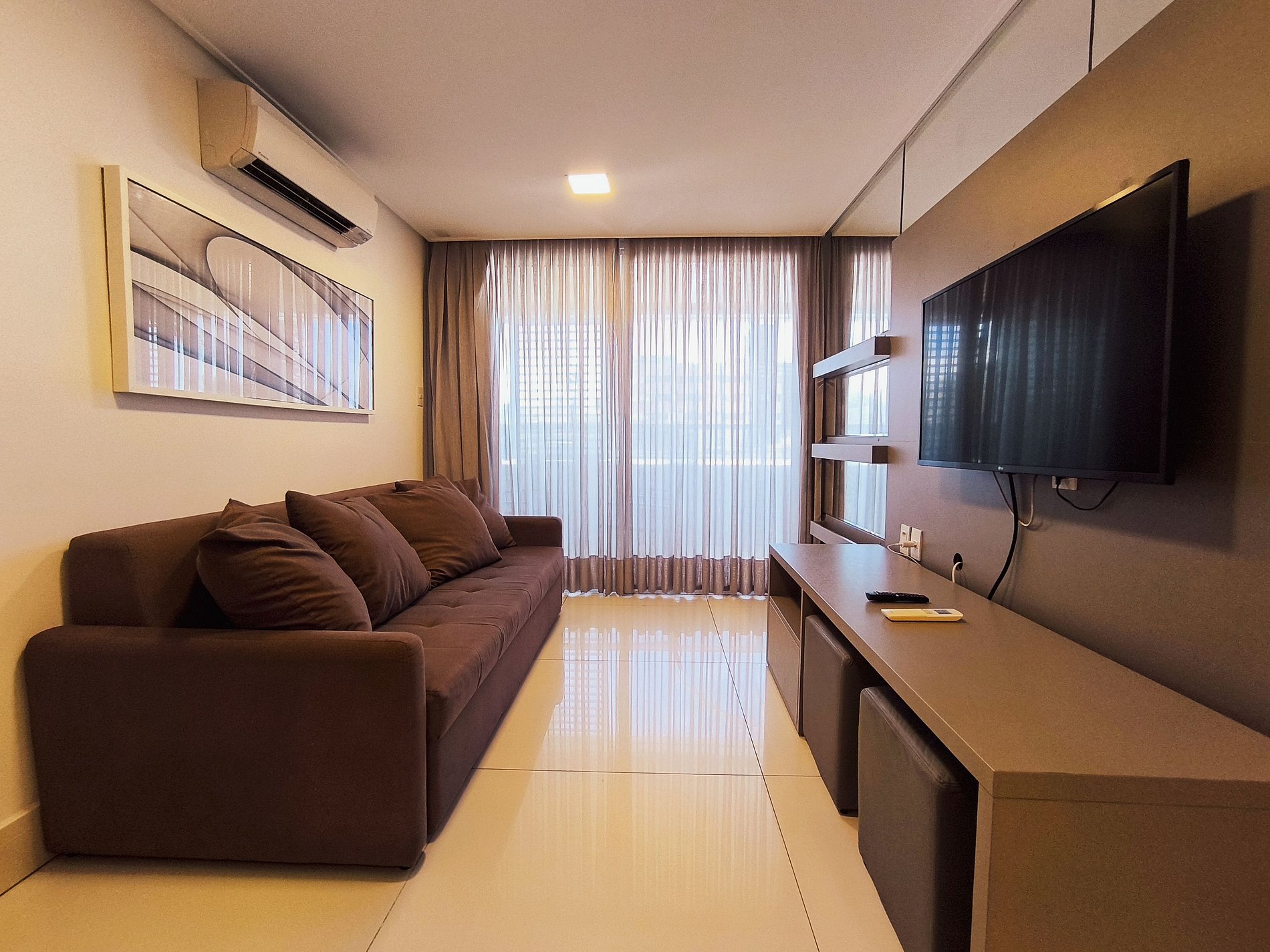 O apartamento possui uma suíte disponível para os hóspedes, com cama queen size, escrivaninha para trabalho e SmarTv. Sala de estar com sofá-cama, puffs, smart tv e ar condicionado, mesa com quatro cadeiras, cozinha completa com talheres, potes e panelas. Há um segundo banheiro: o social. Por fim, um segundo quarto com cama de solteiro.