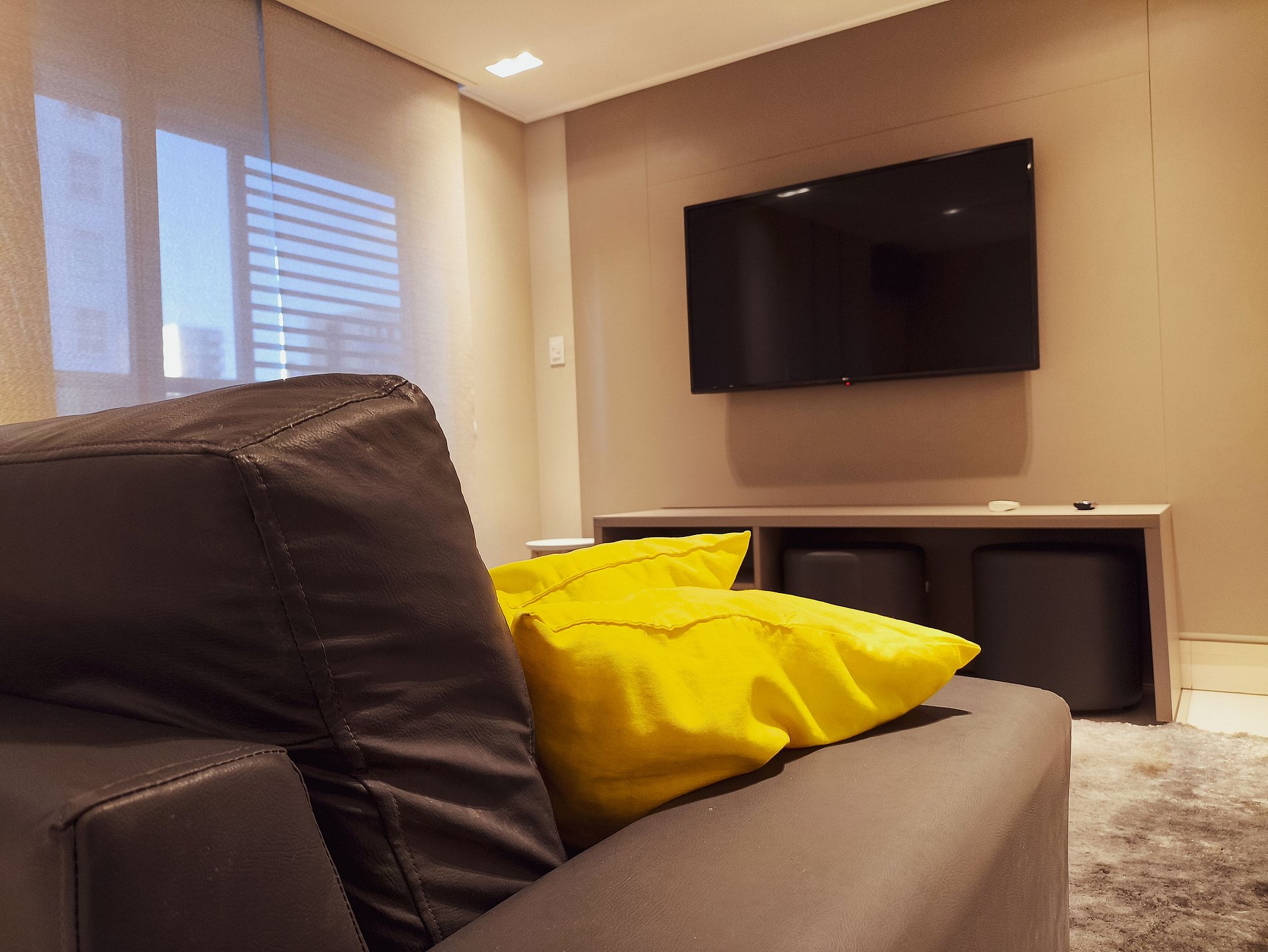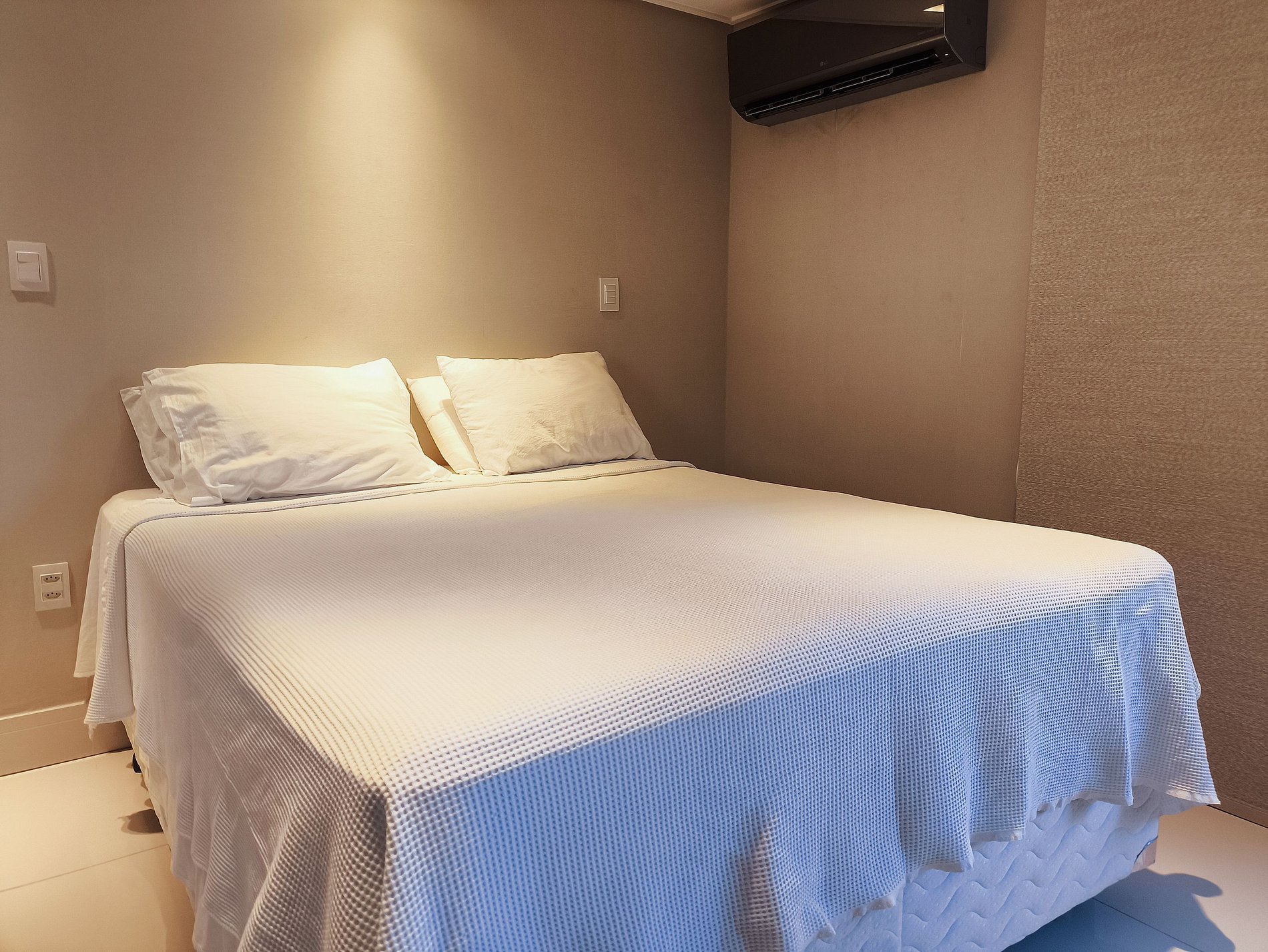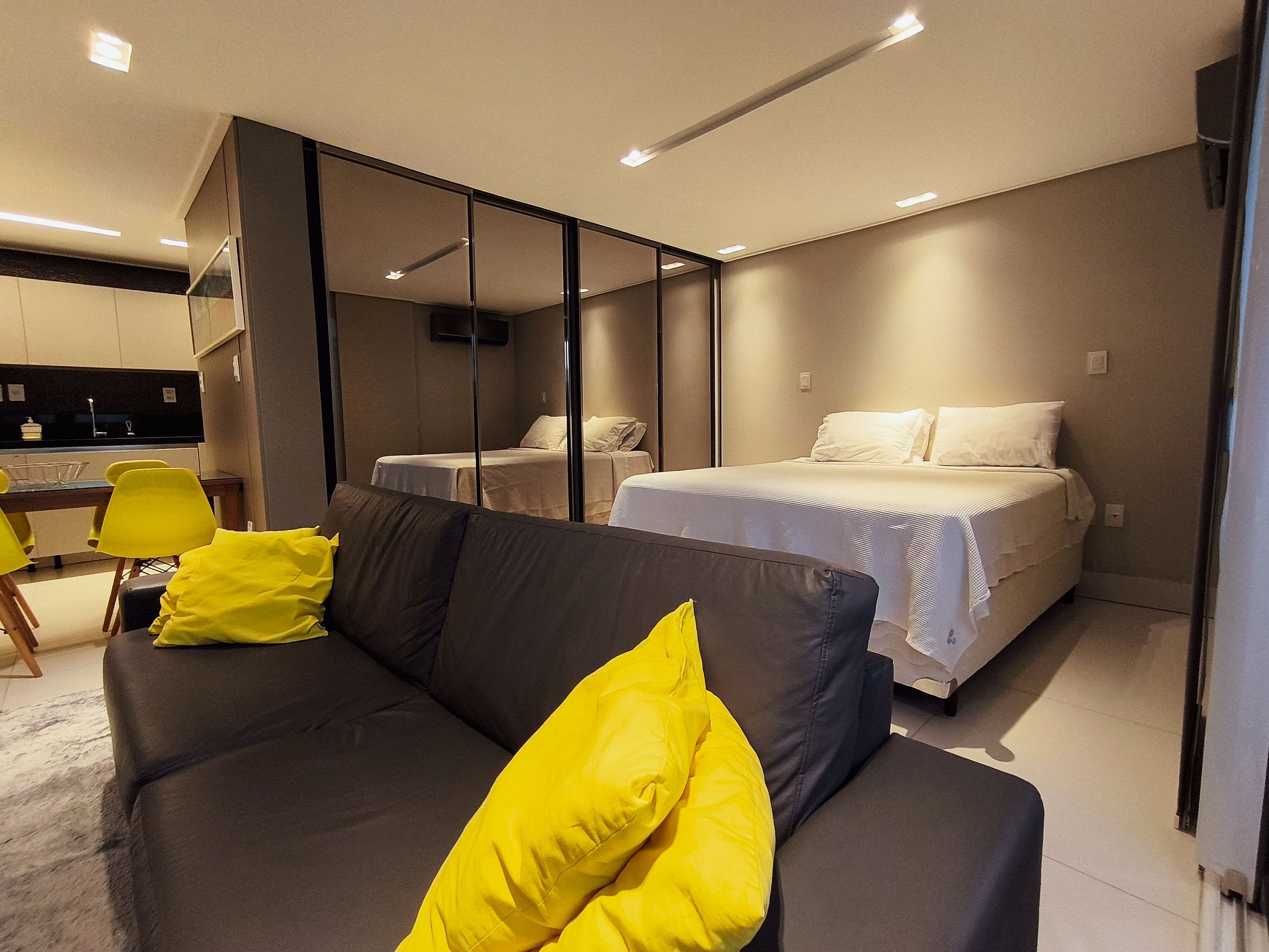 O apartamento é em estilo loft. Possui sala de estar com sofá, puffs, smart tv e ar condicionado, mesa com quatro cadeiras, cozinha completa com talheres, potes e panelas. Quarto com cama tamanho queen e banheiro anexo amplo.