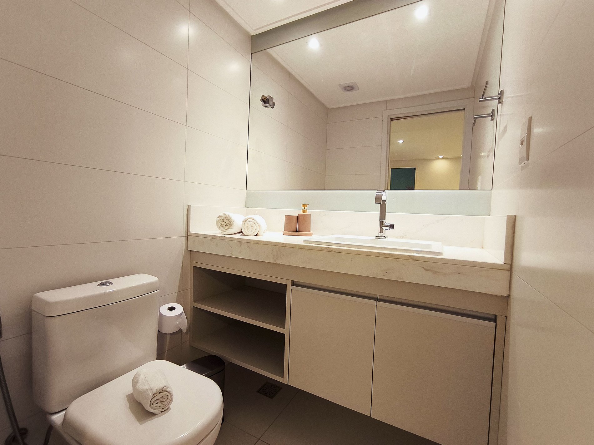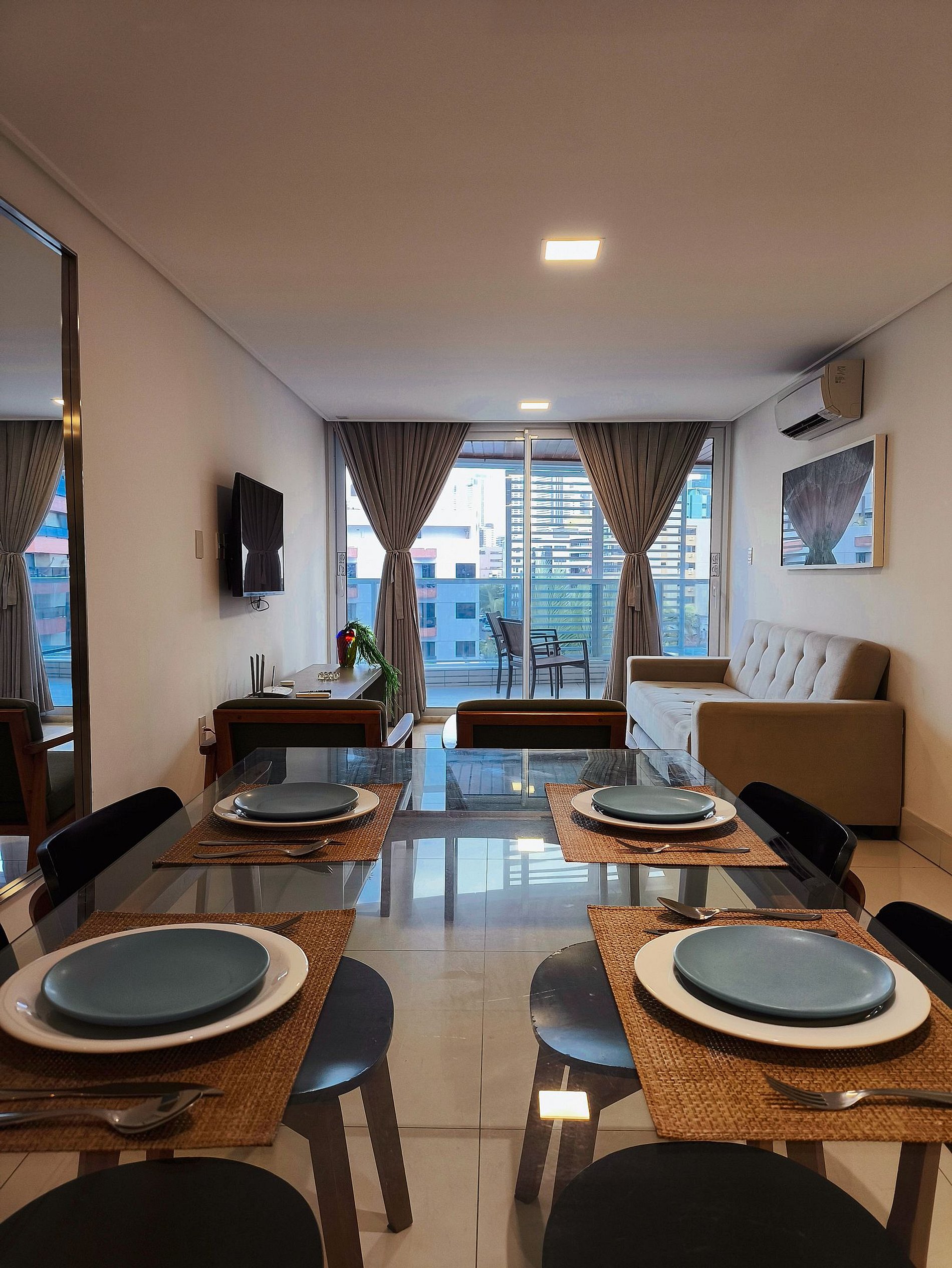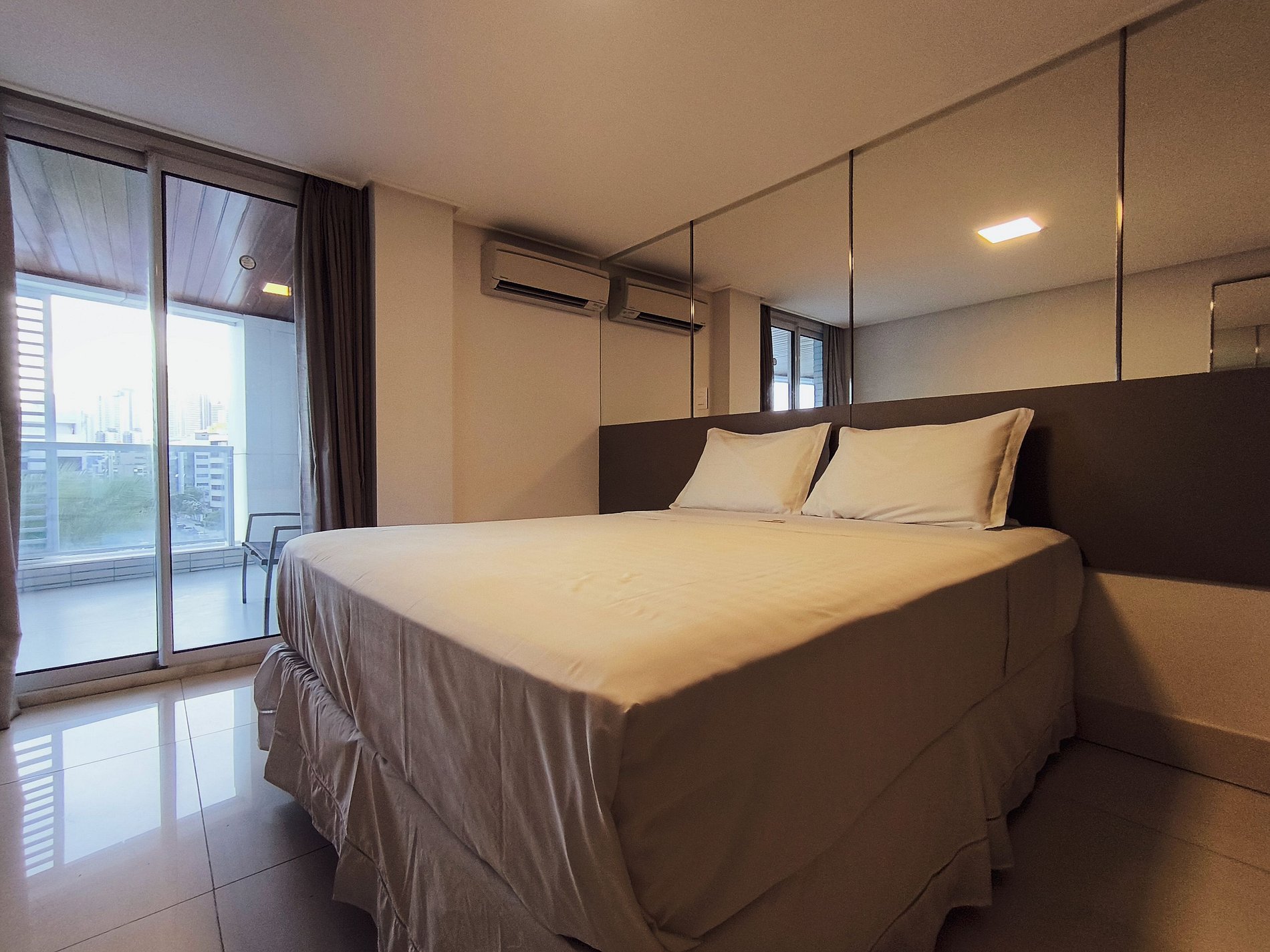 O apartamento é em estilo loft, aberto. Possui sala de estar com sofá cama, puffs, smart tv e ar condicionado, mesa com quatro cadeiras, cozinha completa com talheres, potes e panelas. Quarto com cama tamanho queen e banheiro anexo amplo e um segundo banheiro separado.
