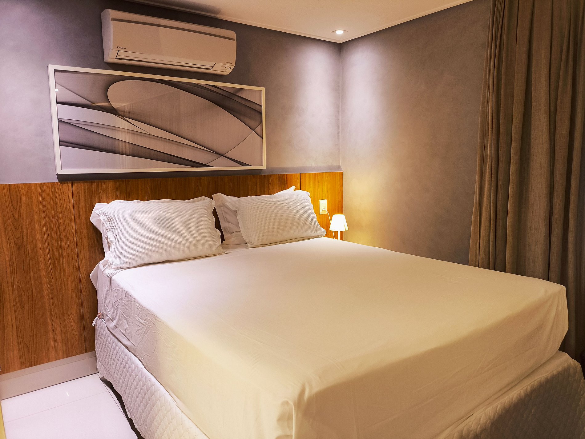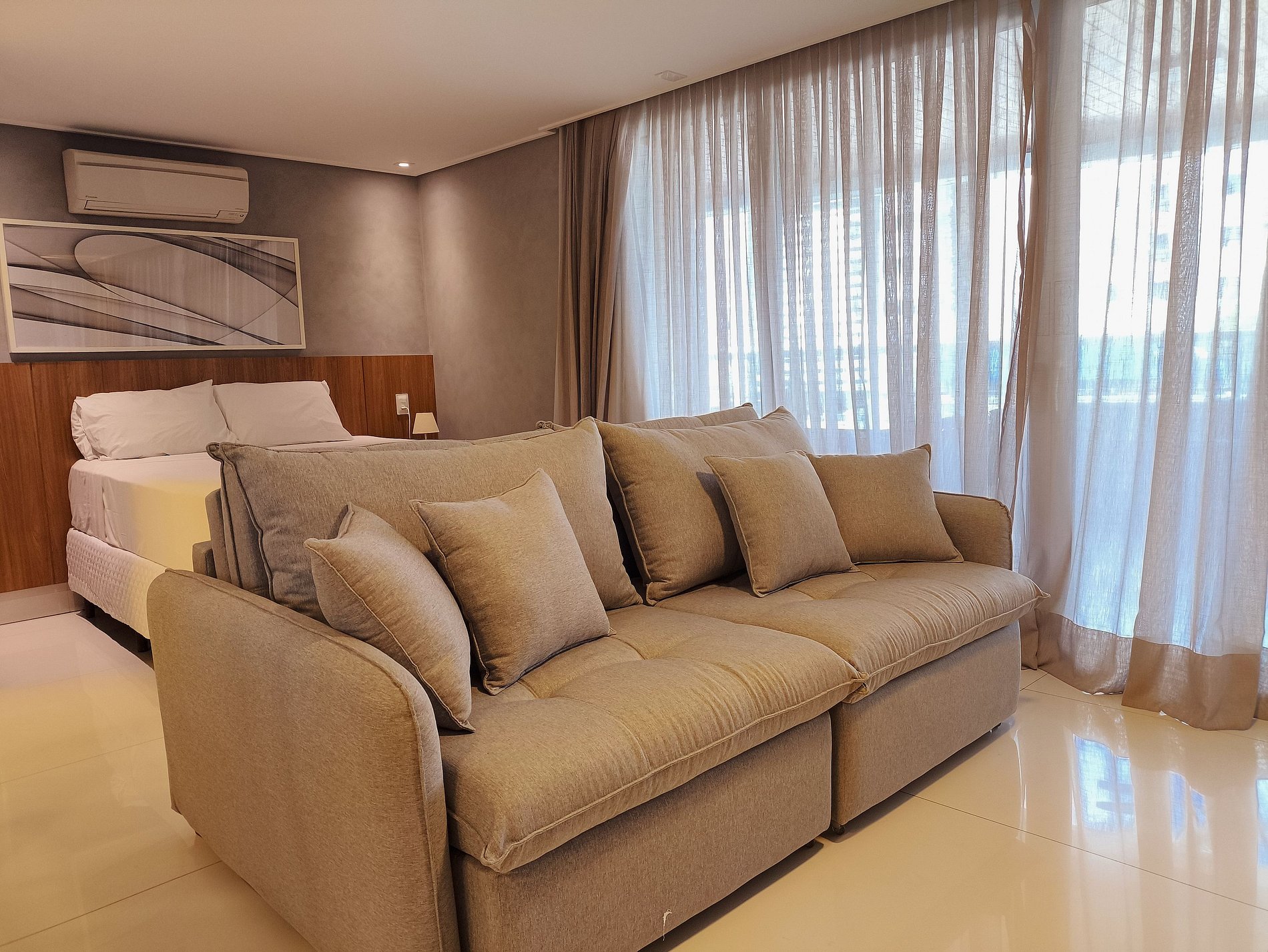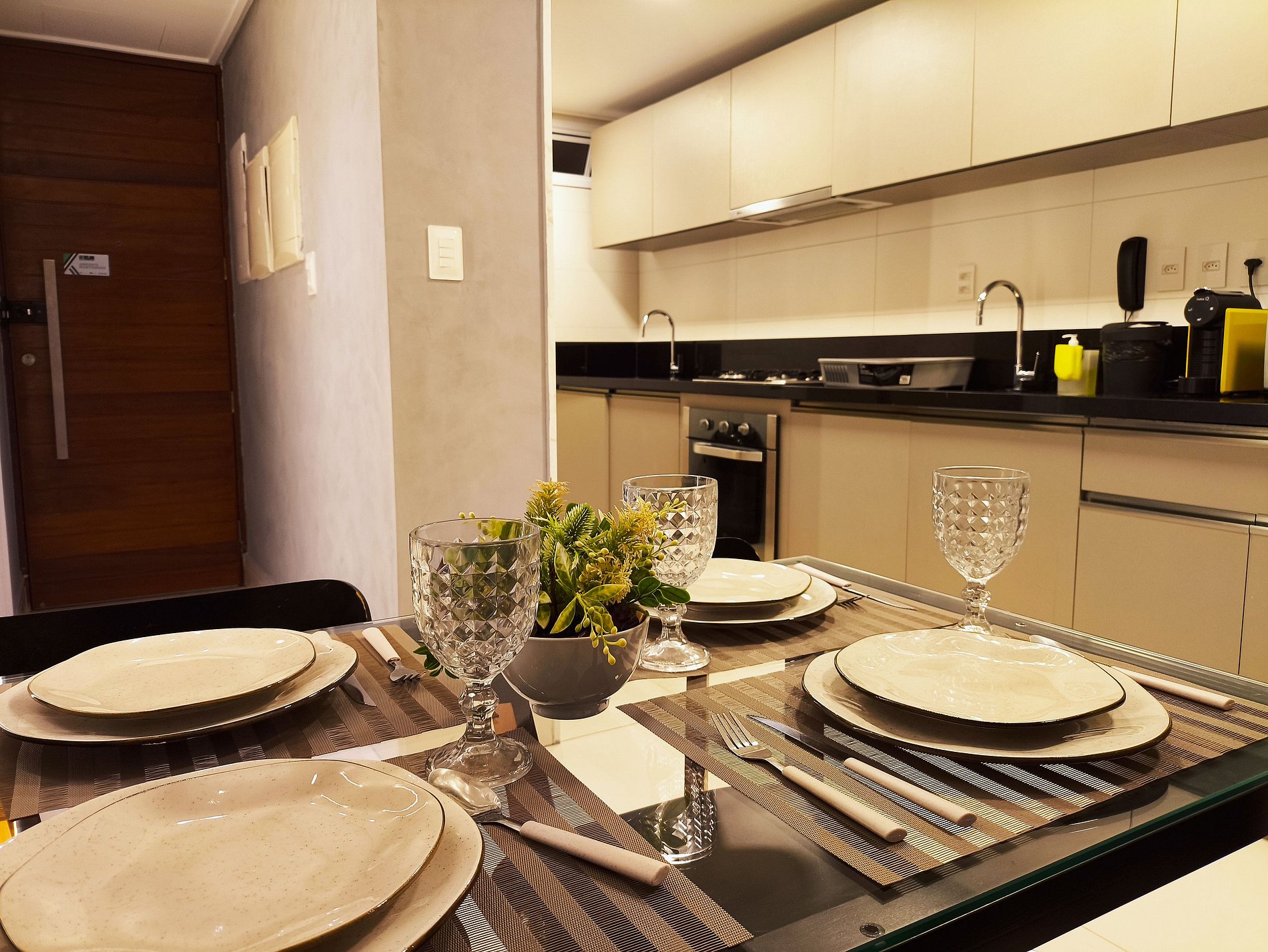 O apartamento é em estilo loft, aberto. Possui sala de estar com sofá cama uma cama de casal, puffs, smart tv e ar condicionado, mesa com quatro cadeiras, cozinha completa com talheres, potes e panelas. Quarto com cama tamanho queen e banheiro anexo amplo.