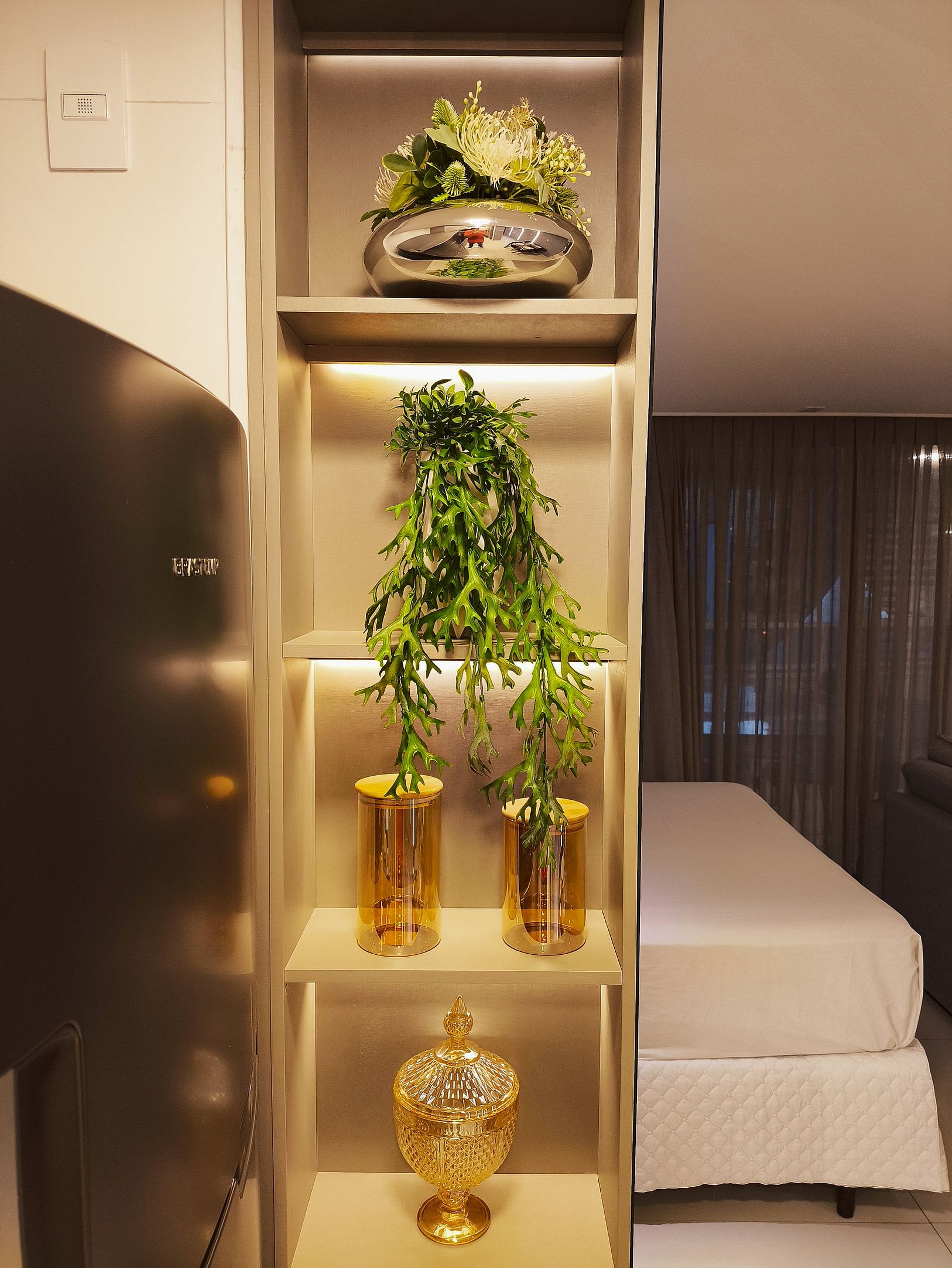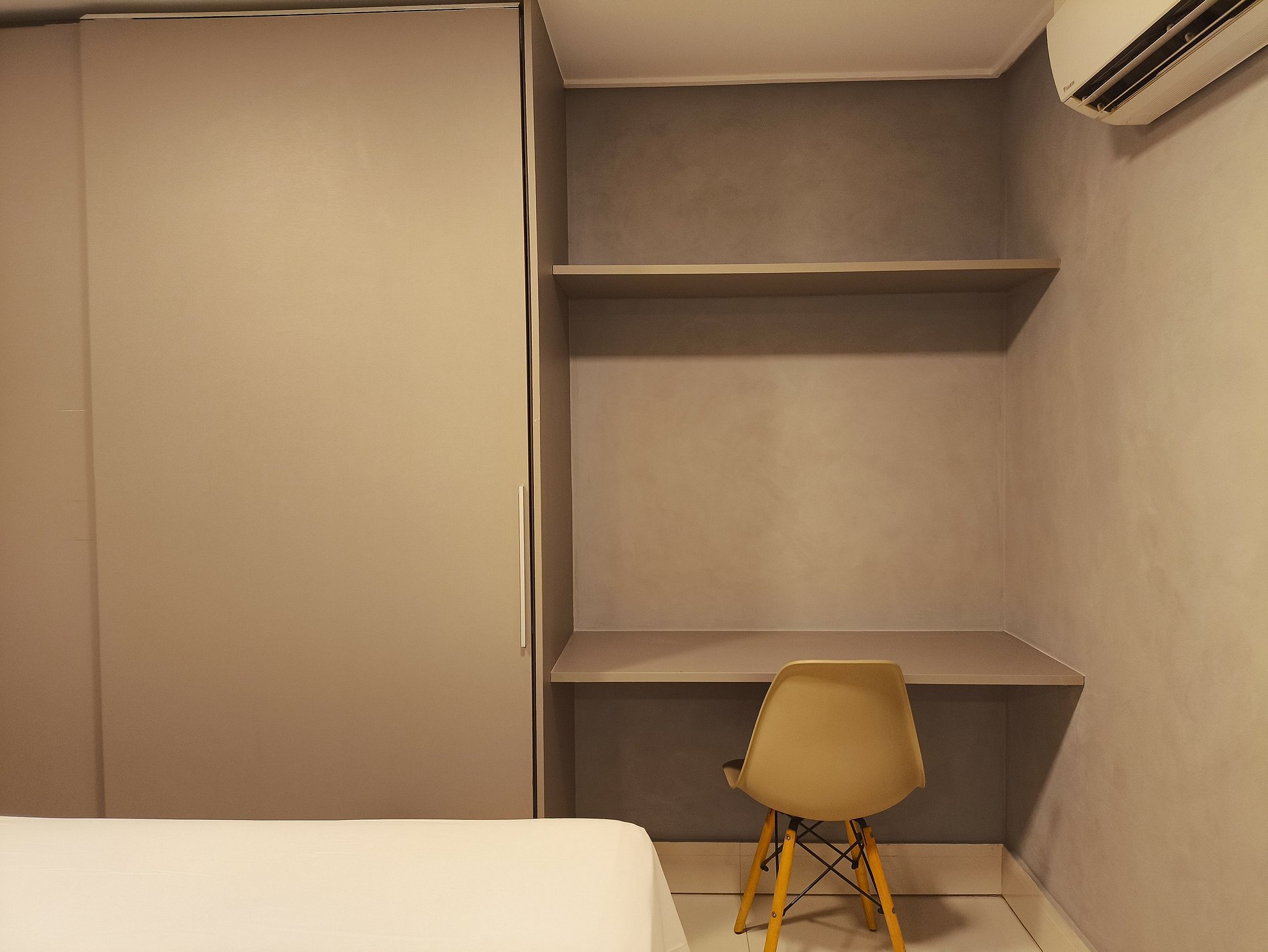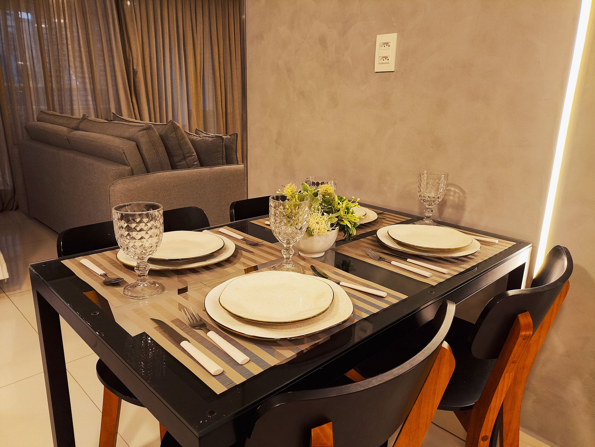 O apartamento é em estilo loft, aberto. Possui sala de estar com sofá cama uma cama de casal, puffs, smart tv e ar condicionado, mesa com quatro cadeiras, cozinha completa com talheres, potes e panelas. Quarto com cama tamanho queen e banheiro anexo amplo.