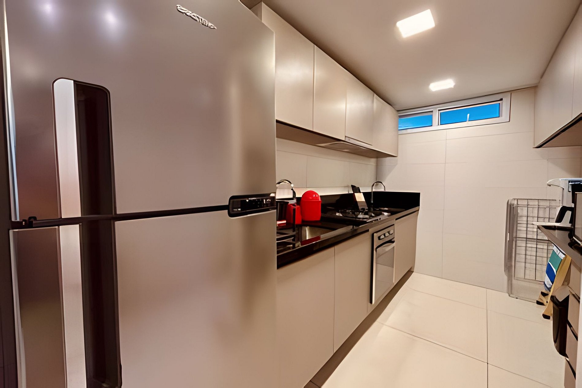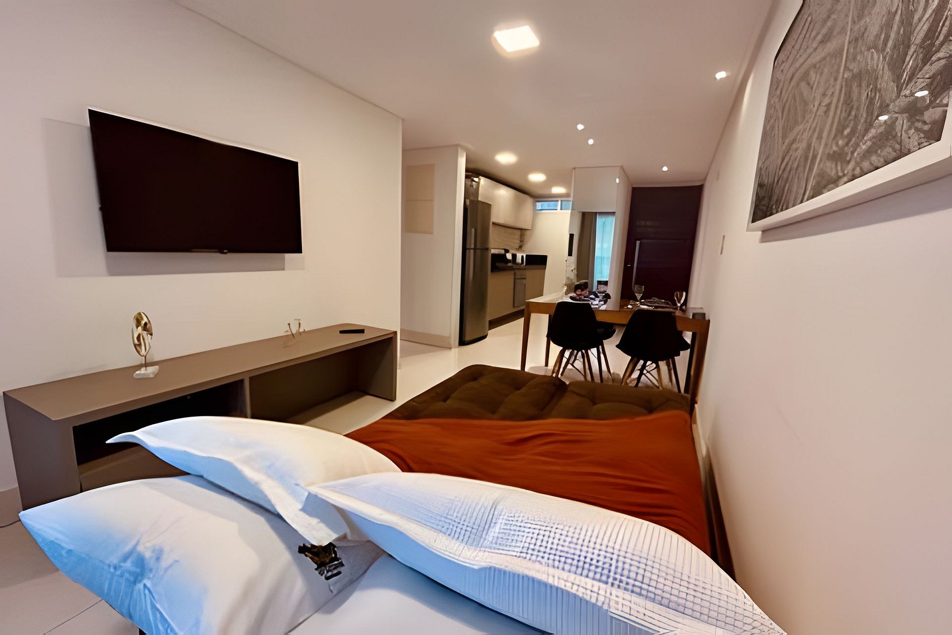 O apartamento possui uma suíte disponível para os hóspedes, com cama queen size, escrivaninha para trabalho e SmarTv. Sala de estar com sofa, smart tv e ar condicionado, mesa com quatro cadeiras, cozinha completa com talheres, potes e panelas. Há um segundo banheiro: o social. Por fim, um segundo quarto com cama de casal.