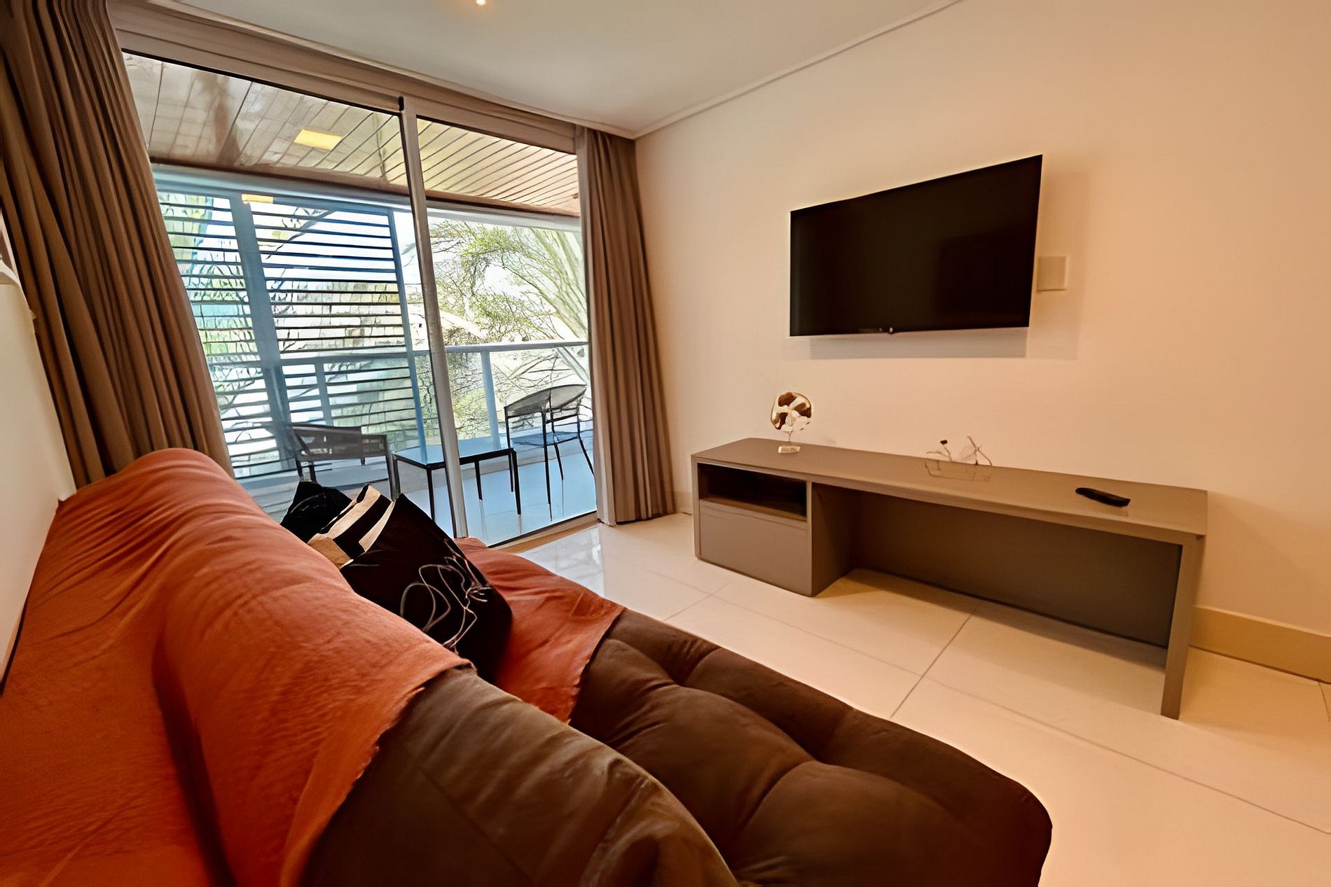 O apartamento possui uma suíte disponível para os hóspedes, com cama queen size, escrivaninha para trabalho e SmarTv. Sala de estar com sofa, smart tv e ar condicionado, mesa com quatro cadeiras, cozinha completa com talheres, potes e panelas. Há um segundo banheiro: o social. Por fim, um segundo quarto com cama de casal.