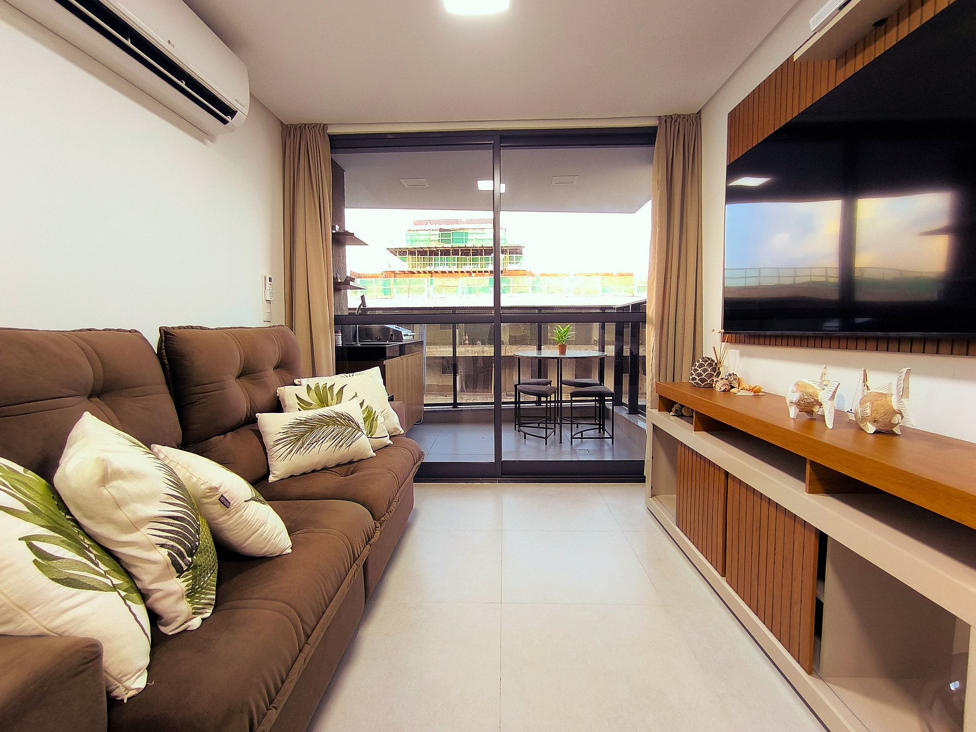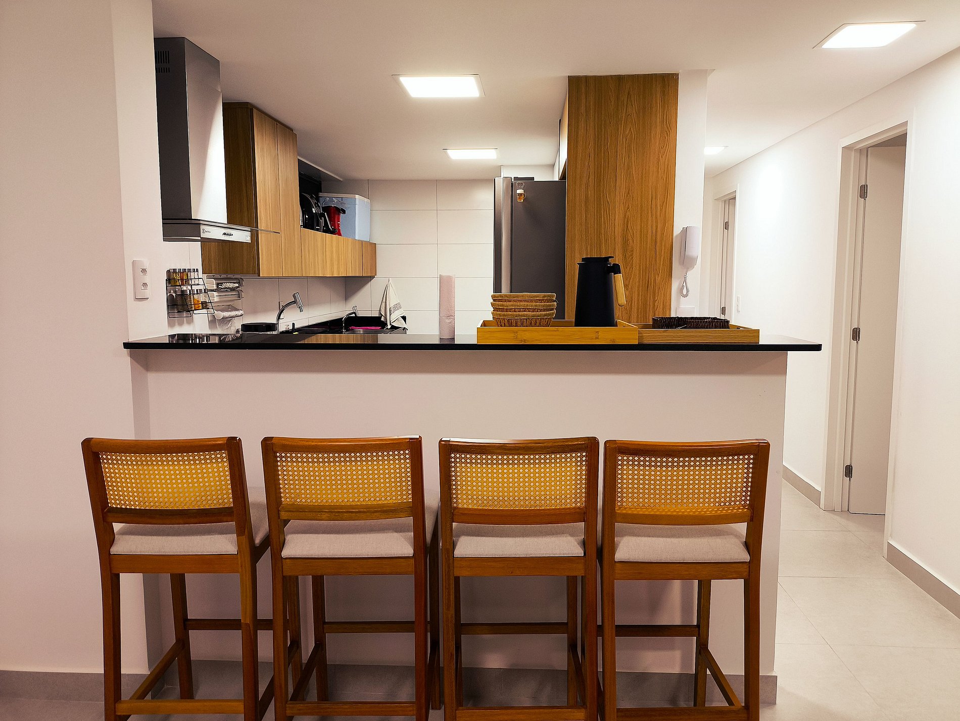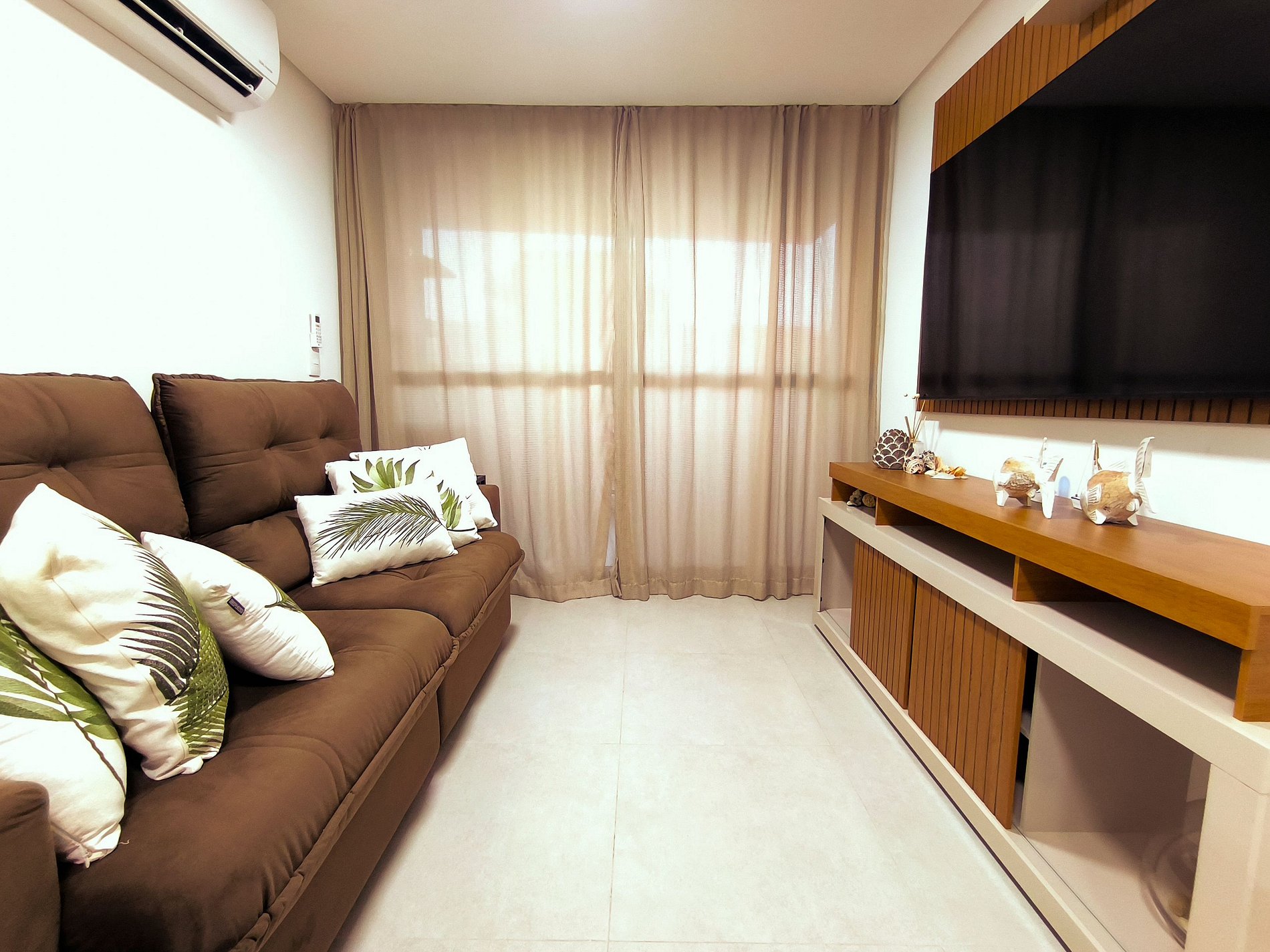 O apartamento possui 3 quartos, sendo 1 suíte, todos com ar-condicionado, assim como a sala, garantindo mais conforto durante a estadia.