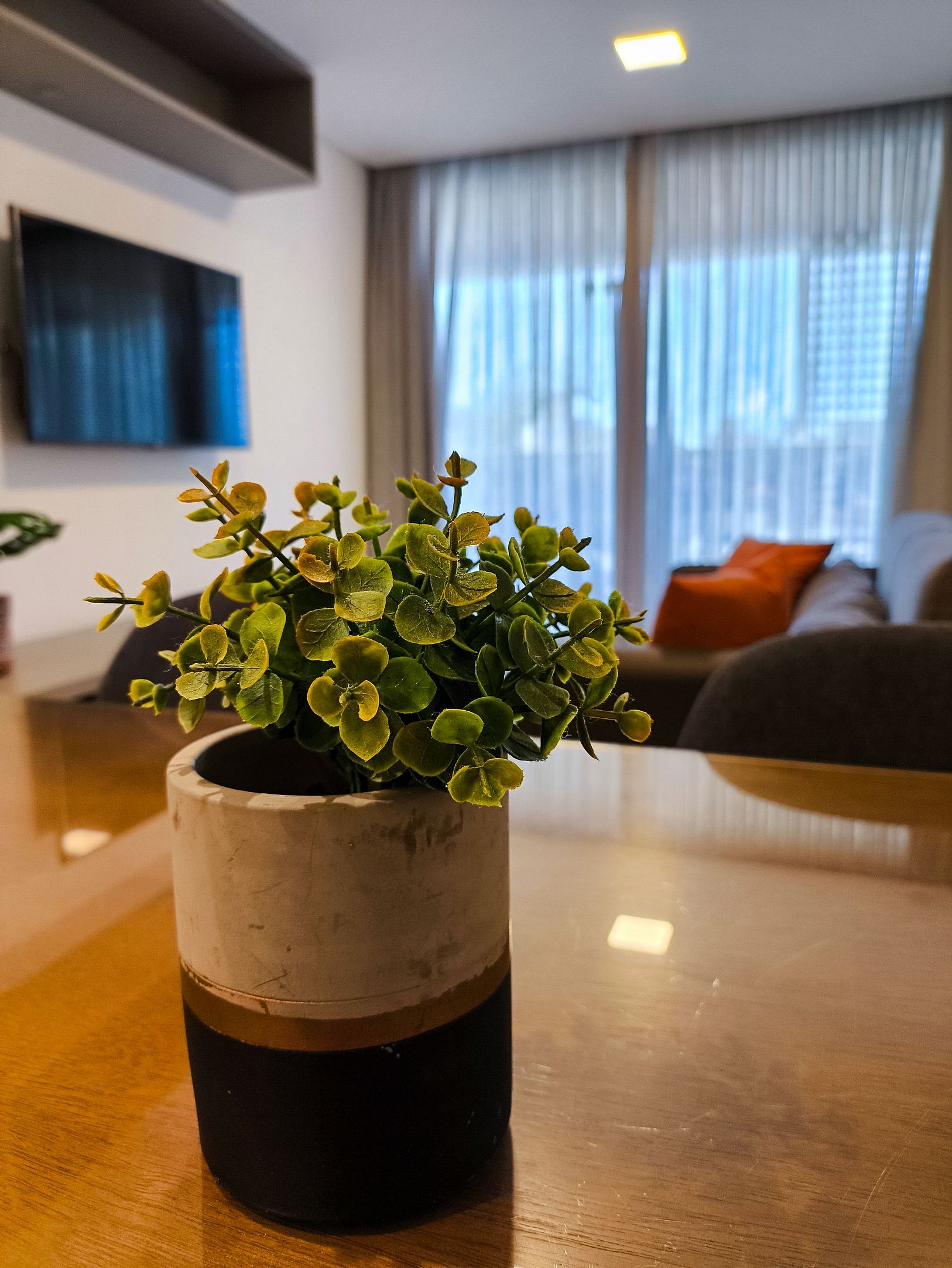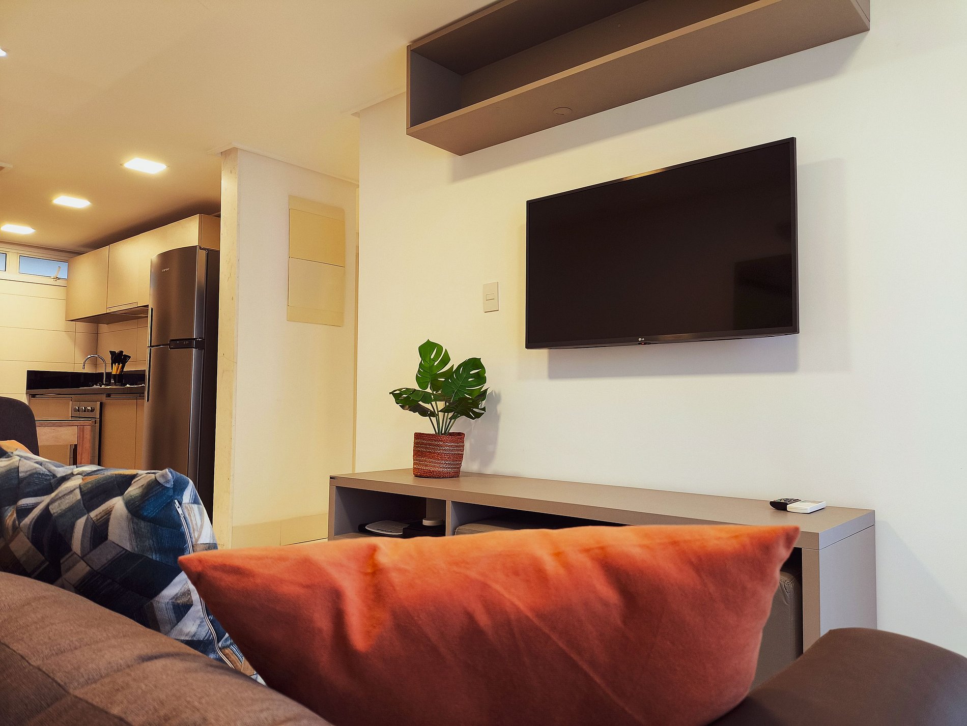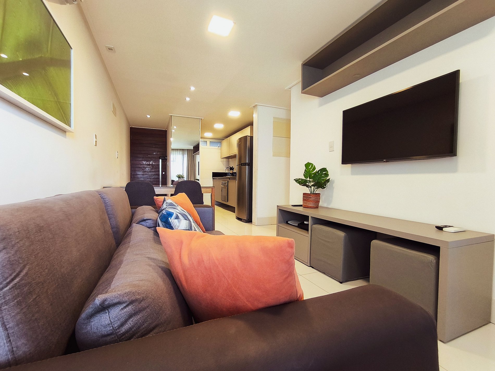 O apartamento possui uma suíte disponível para os hóspedes, com cama queen size, escrivaninha para trabalho e SmarTv. Sala de estar com sofa, smart tv e ar condicionado, mesa com quatro cadeiras, cozinha completa com talheres, potes e panelas. Há um segundo banheiro: o social. Por fim, um segundo quarto com cama de casal.