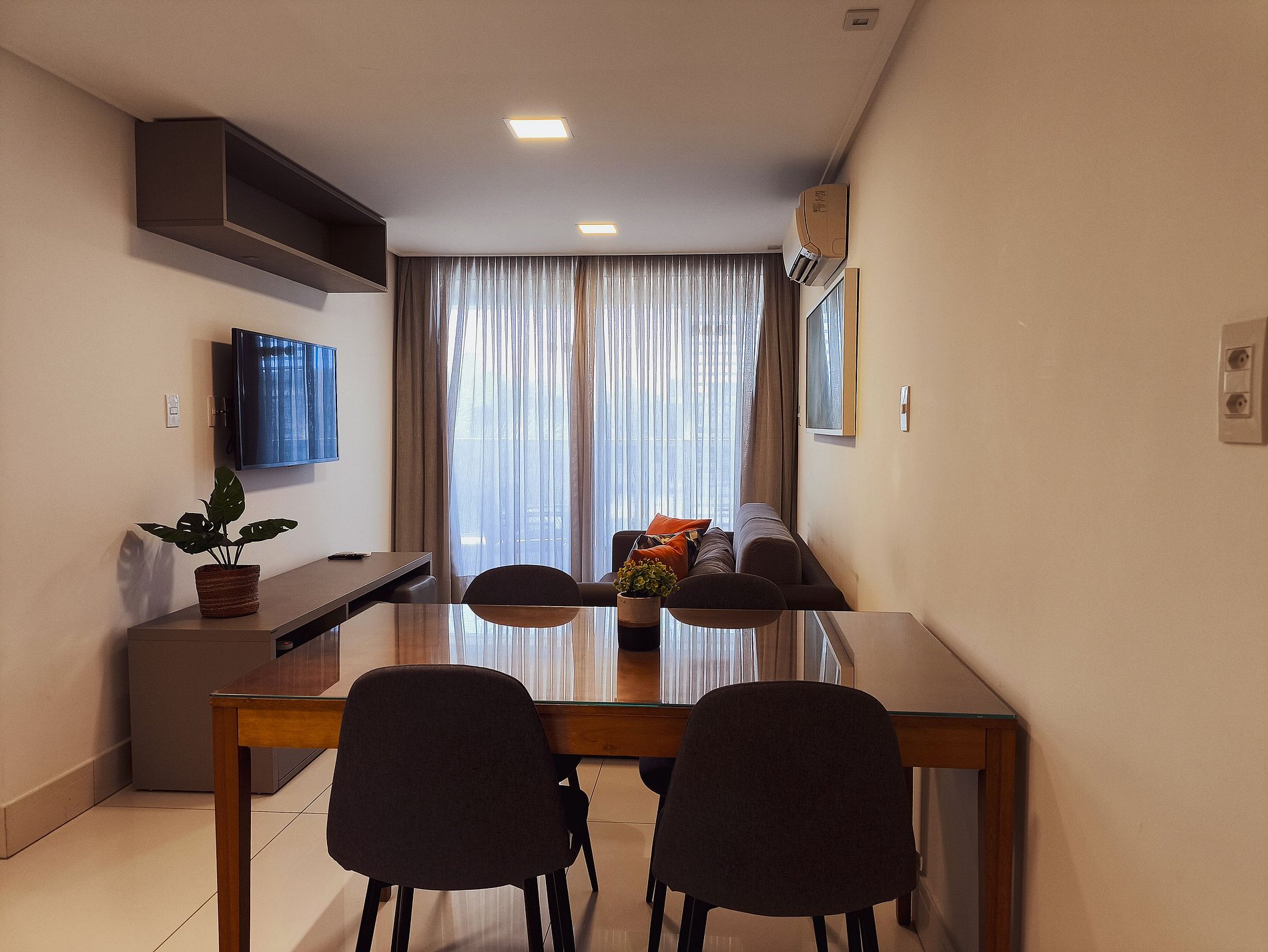 O apartamento possui uma suíte disponível para os hóspedes, com cama queen size, escrivaninha para trabalho e SmarTv. Sala de estar com sofa, smart tv e ar condicionado, mesa com quatro cadeiras, cozinha completa com talheres, potes e panelas. Há um segundo banheiro: o social. Por fim, um segundo quarto com cama de casal.