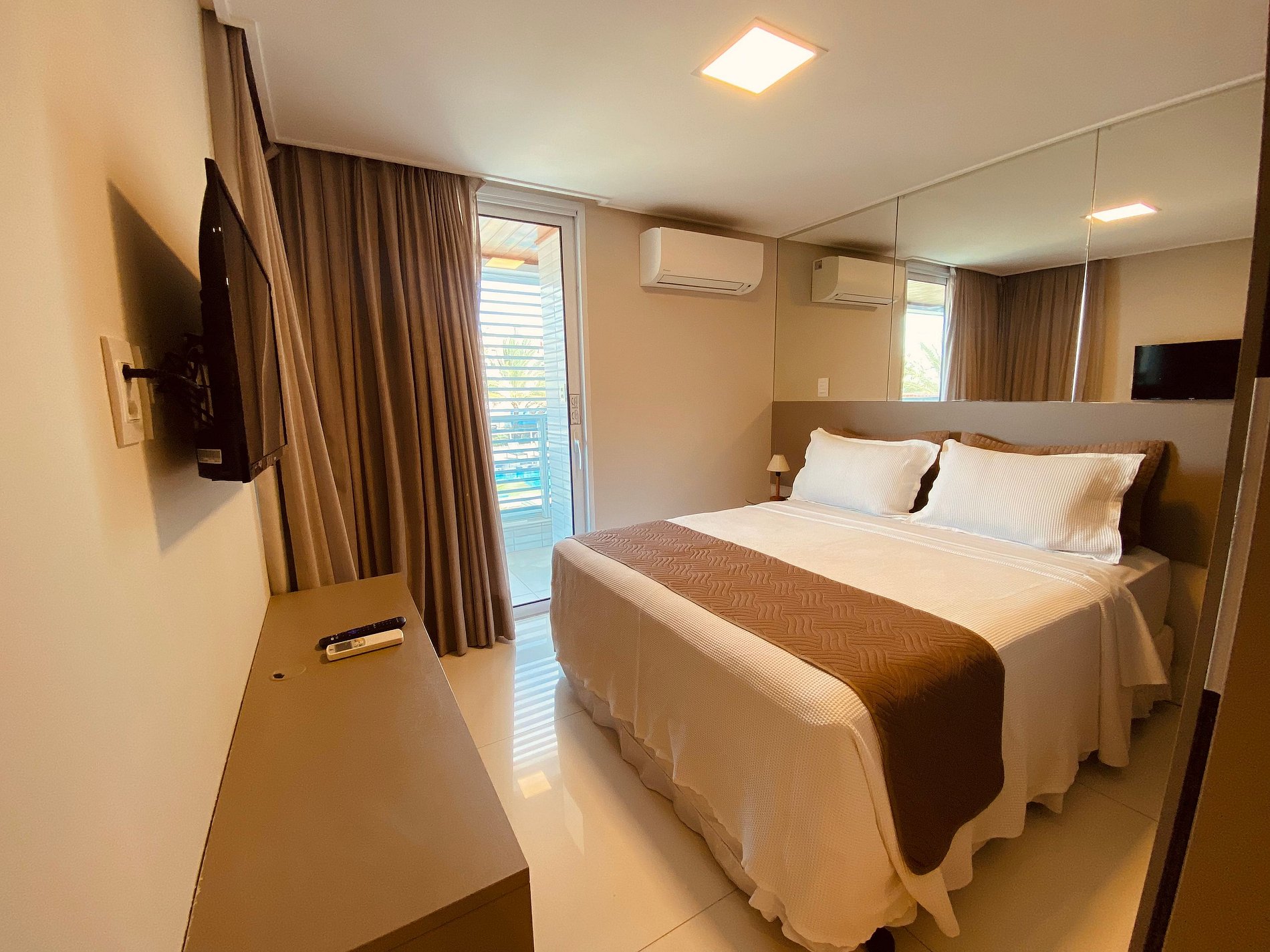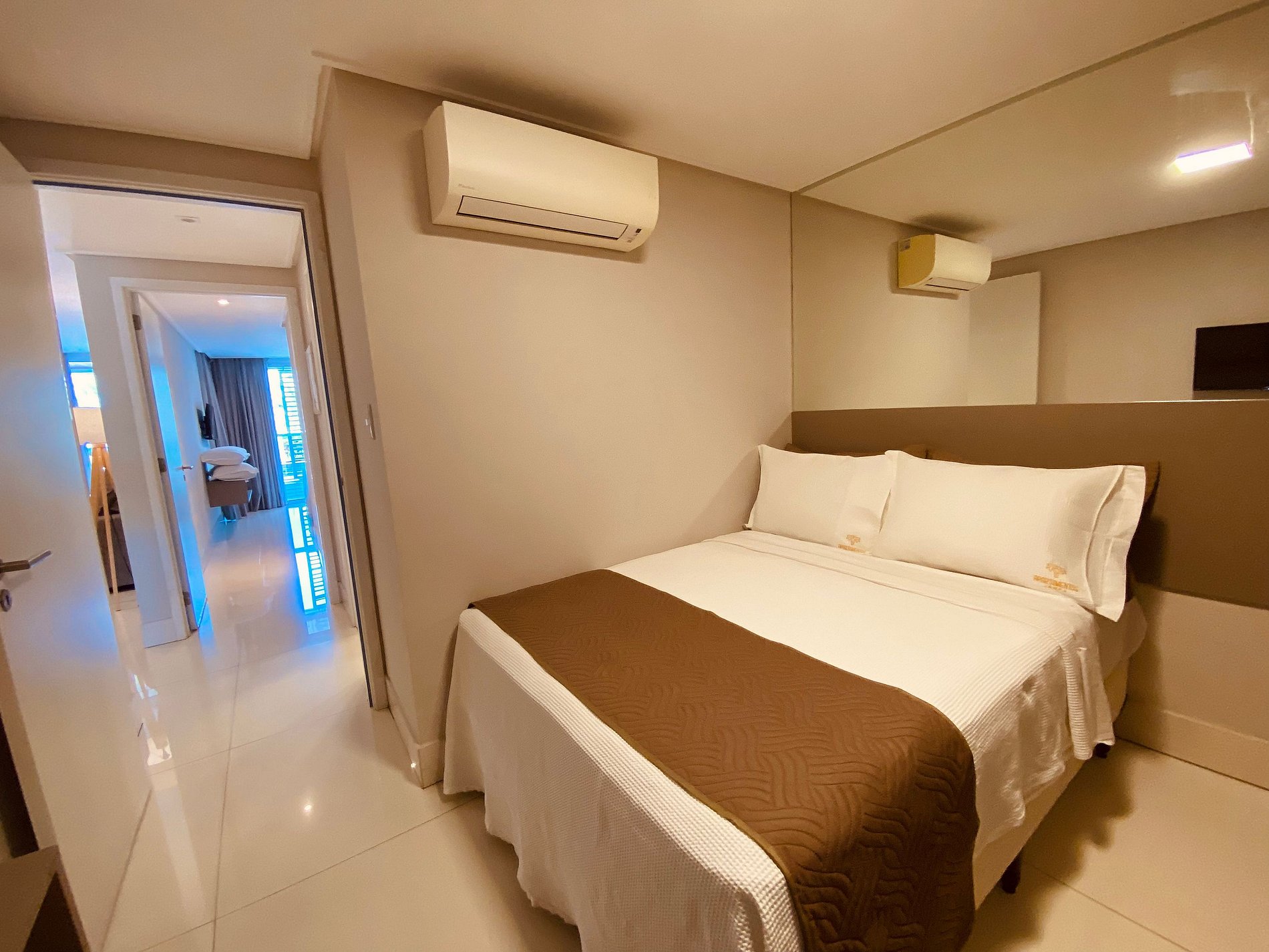 O apartamento possui uma suíte disponível para os hóspedes, com cama queen size, escrivaninha para trabalho e SmarTv. Sala de estar com sofa, smart tv e ar condicionado, mesa com quatro cadeiras, cozinha completa com talheres, potes e panelas. Há um segundo banheiro: o social. Por fim, um segundo quarto com cama de casal.