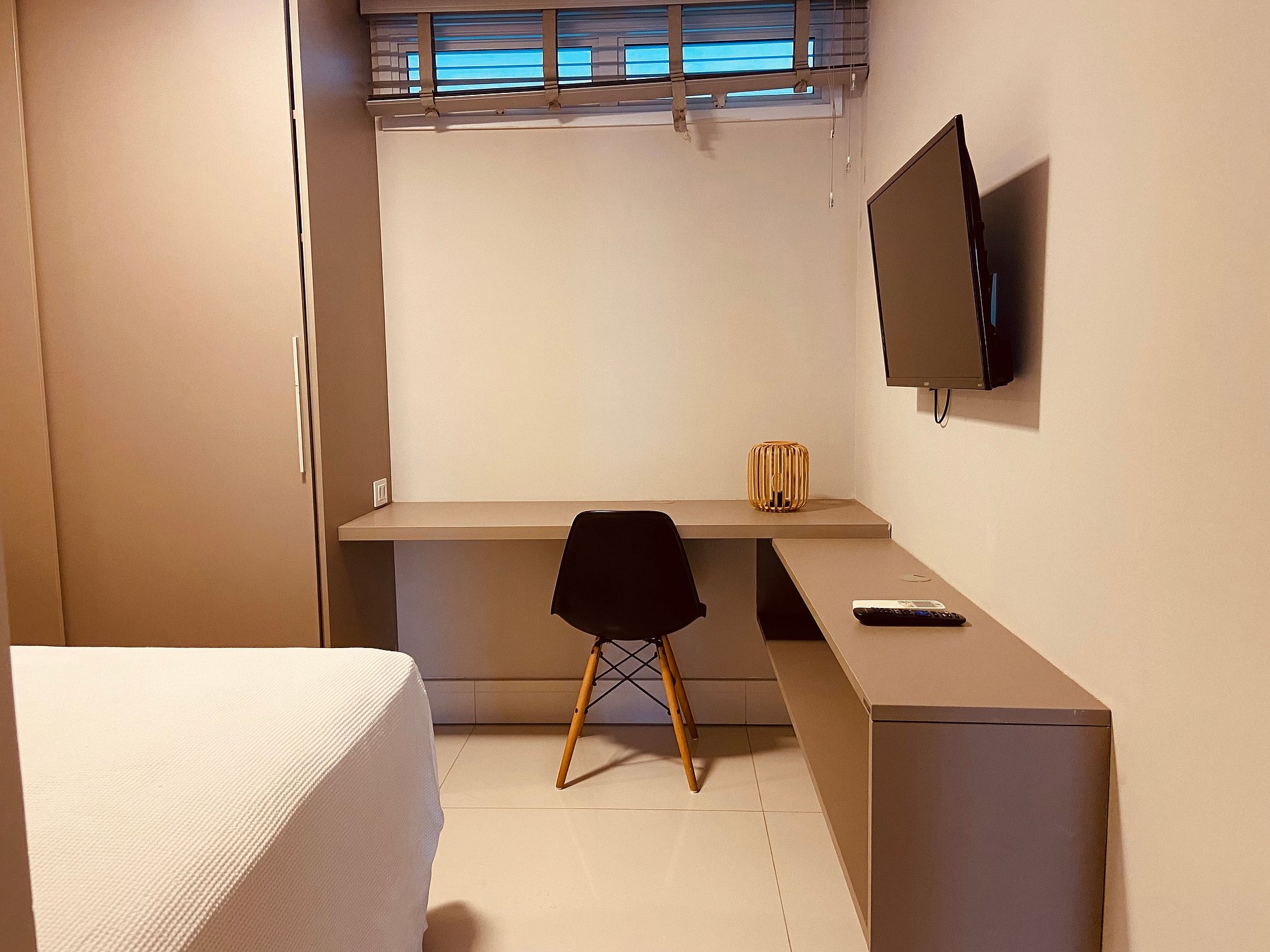 O apartamento possui uma suíte disponível para os hóspedes, com cama queen size, escrivaninha para trabalho e SmarTv. Sala de estar com sofa, smart tv e ar condicionado, mesa com quatro cadeiras, cozinha completa com talheres, potes e panelas. Há um segundo banheiro: o social. Por fim, um segundo quarto com cama de casal.