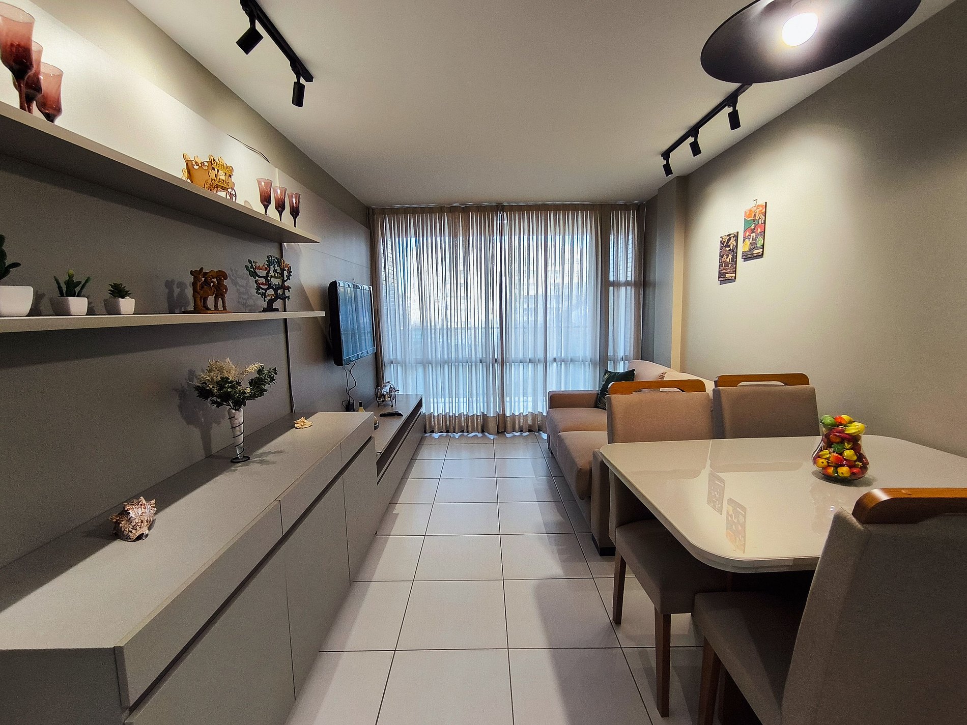 O apartamento possui uma suíte disponível para os hóspedes, com cama queen size e uma cama auxiliar. Sala de estar com sofá, TV, mesa com quatro cadeiras, cozinha completa com talheres, potes e panelas. Há um segundo banheiro: o social. Por fim, um segundo quarto com cama queen e uma cama auxiliar