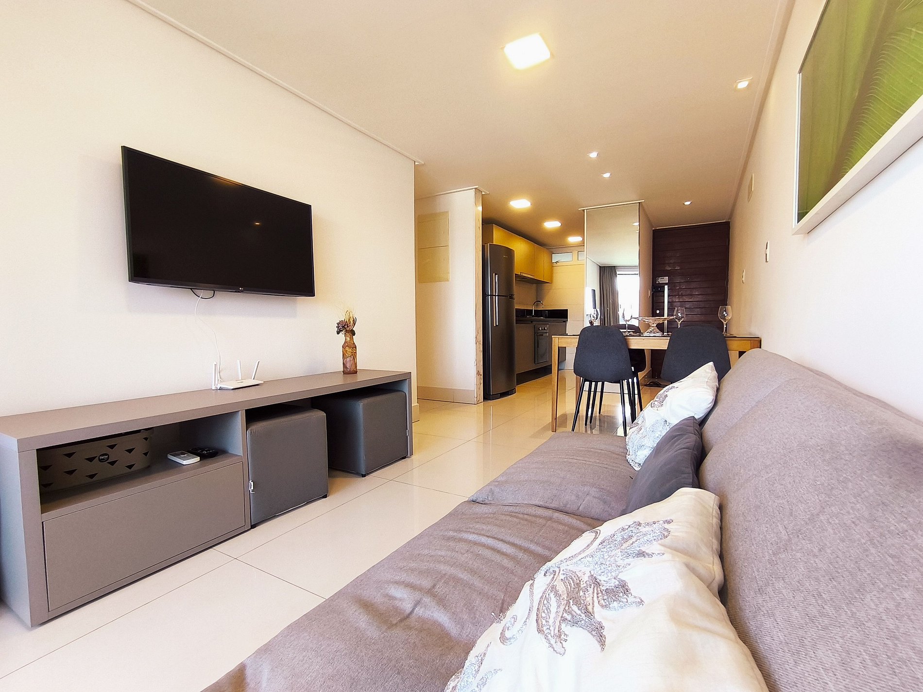 O apartamento possui uma suíte disponível para os hóspedes, com cama queen size e escrivaninha para trabalho. Sala de estar com sofá, smart tv e ar condicionado, mesa com quatro cadeiras, cozinha completa com talheres, potes e panelas. Há um segundo banheiro: o social. Por fim, um segundo quarto com uma cama de solteiro com auxiliar.