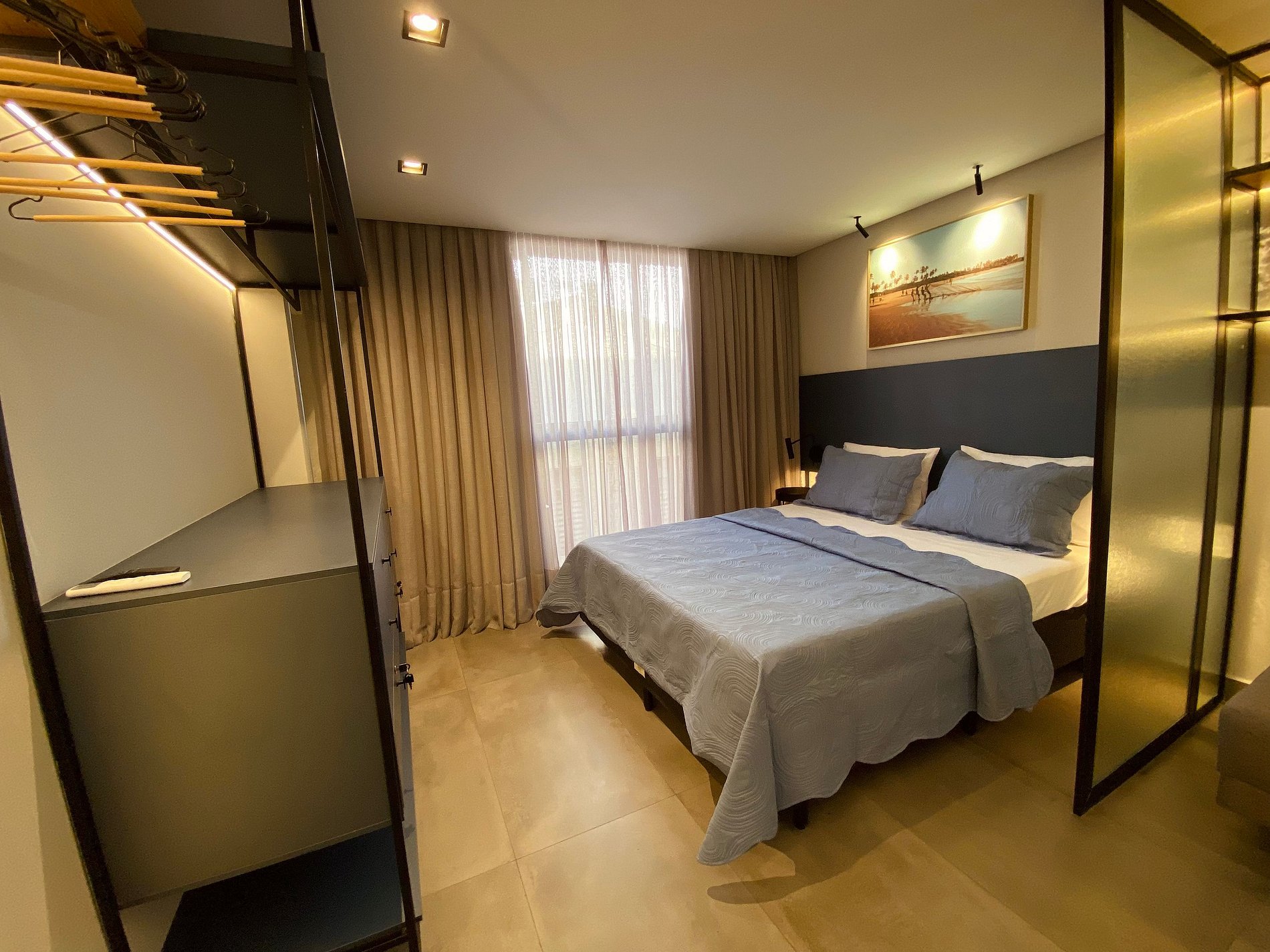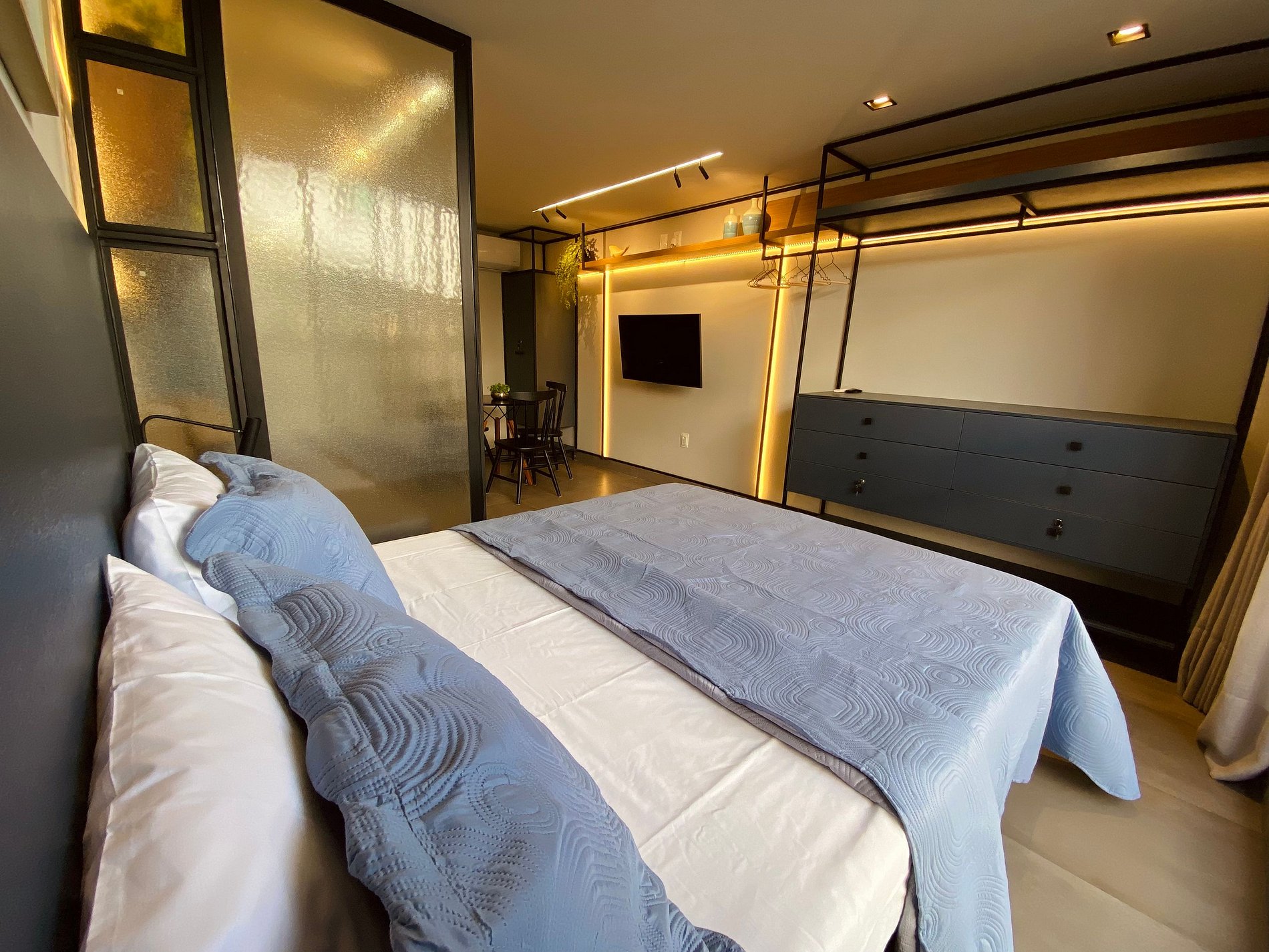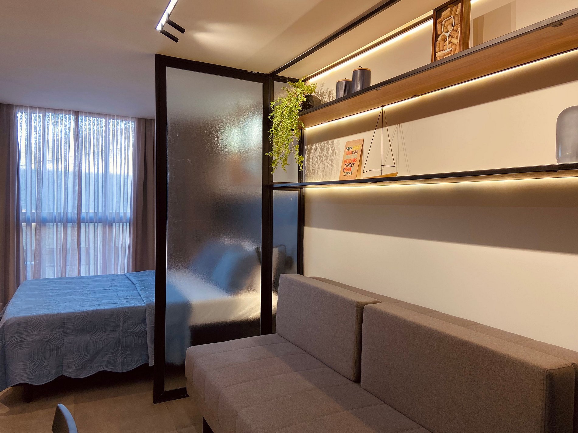 O apartamento é um espaço aberto perfeitamente bem integrado entre quarto, sala e cozinha, além de varanda e banheiro. Possui uma cama queen size e um sofá-cama para duas pessoas, Smartv, ar condicionado, cozinha completa com loucas e utensílios. Possui também um espaço para trabalho com mesa e cadeira confortável.