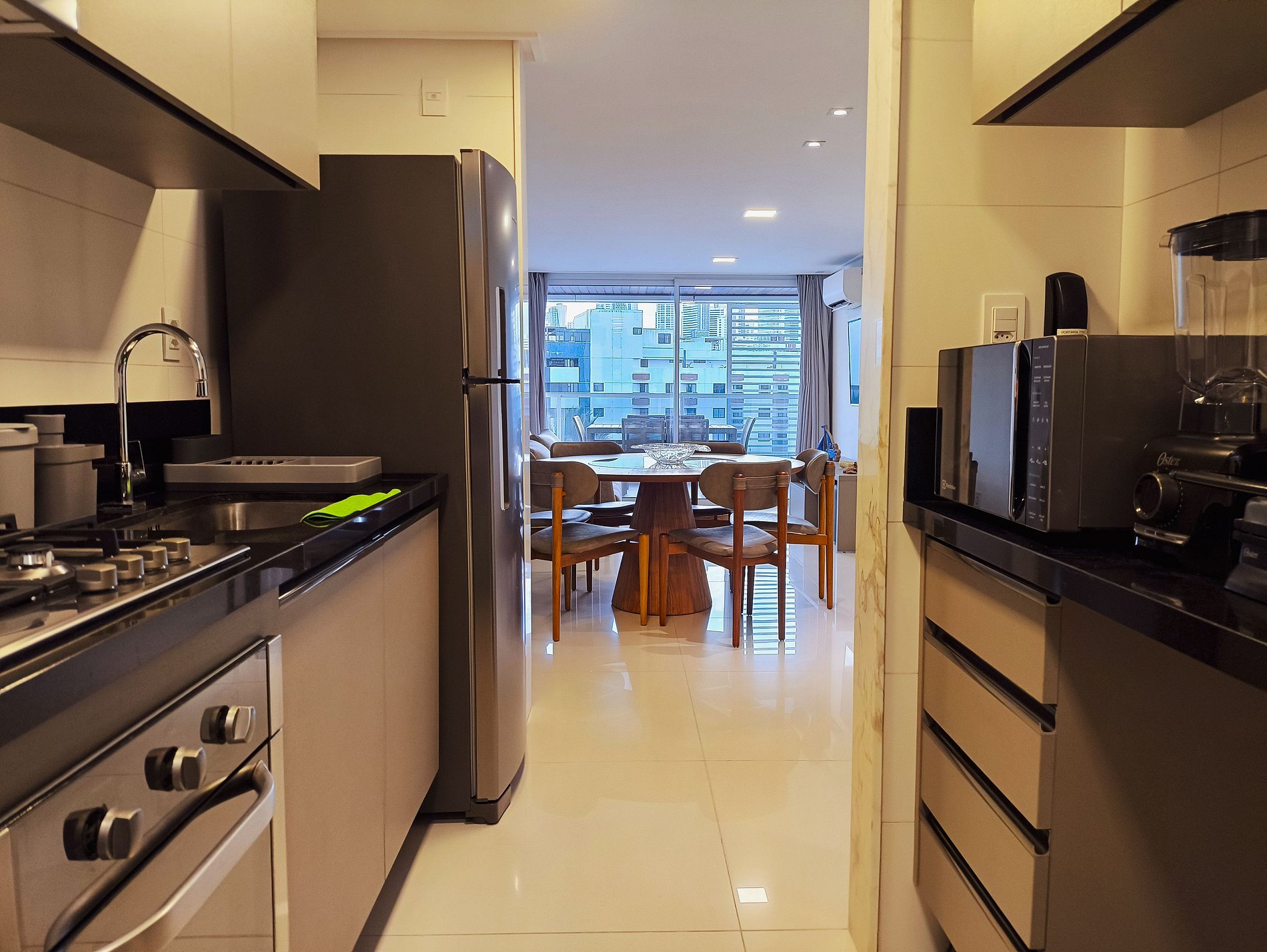 Todas as portas do apartamento são de vidro duplo, que o isolam acusticamente e mantém a temperatura interna por mais tempo.