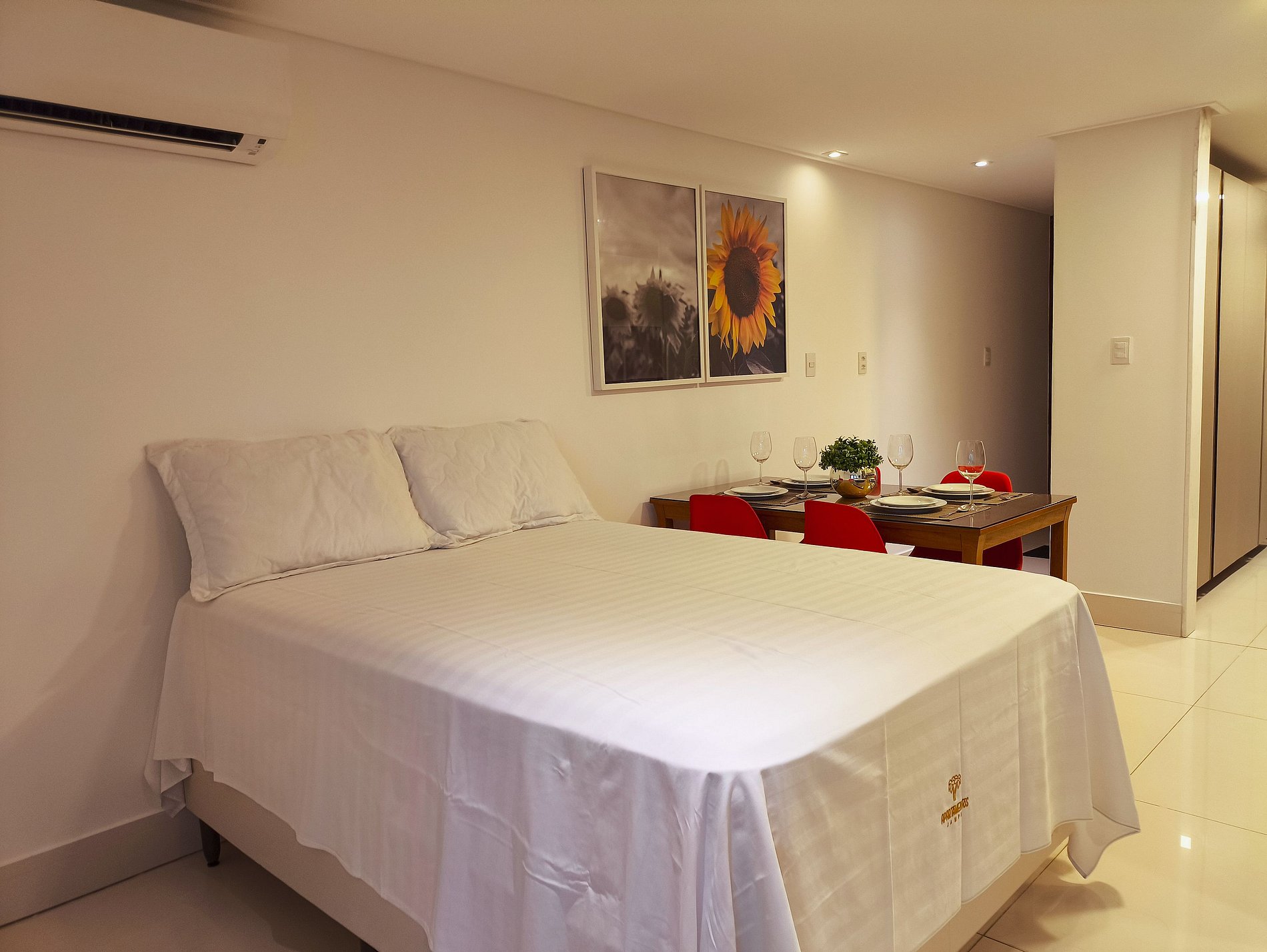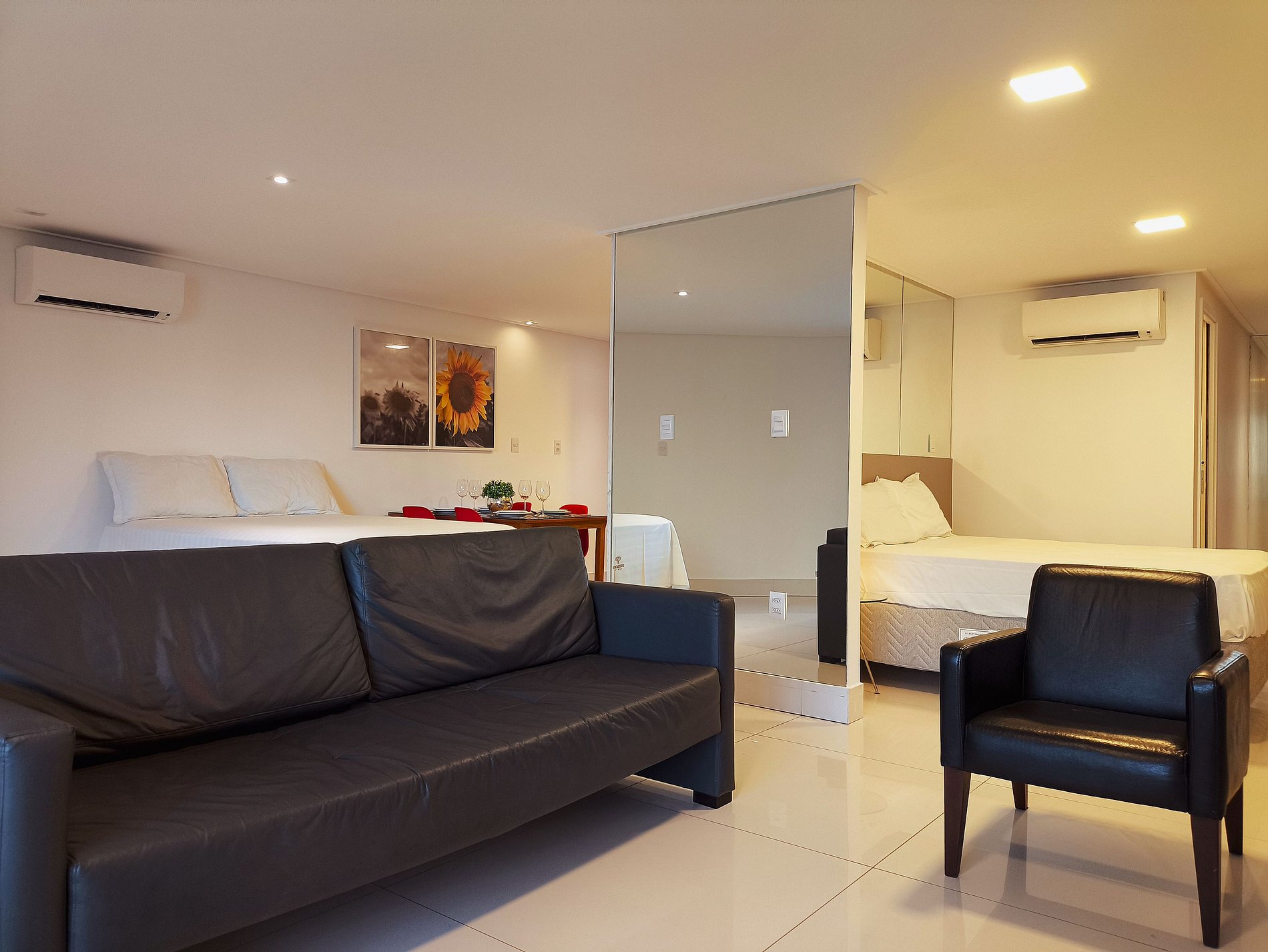O apartamento é em estilo studio, aberto, com duas cama queen size. Sala de estar com sofa, smart tv e ar condicionado, mesa com quatro cadeiras, cozinha completa com talheres, pratos e panelas. Contendo uma varanda com uma bela vista para a piscina