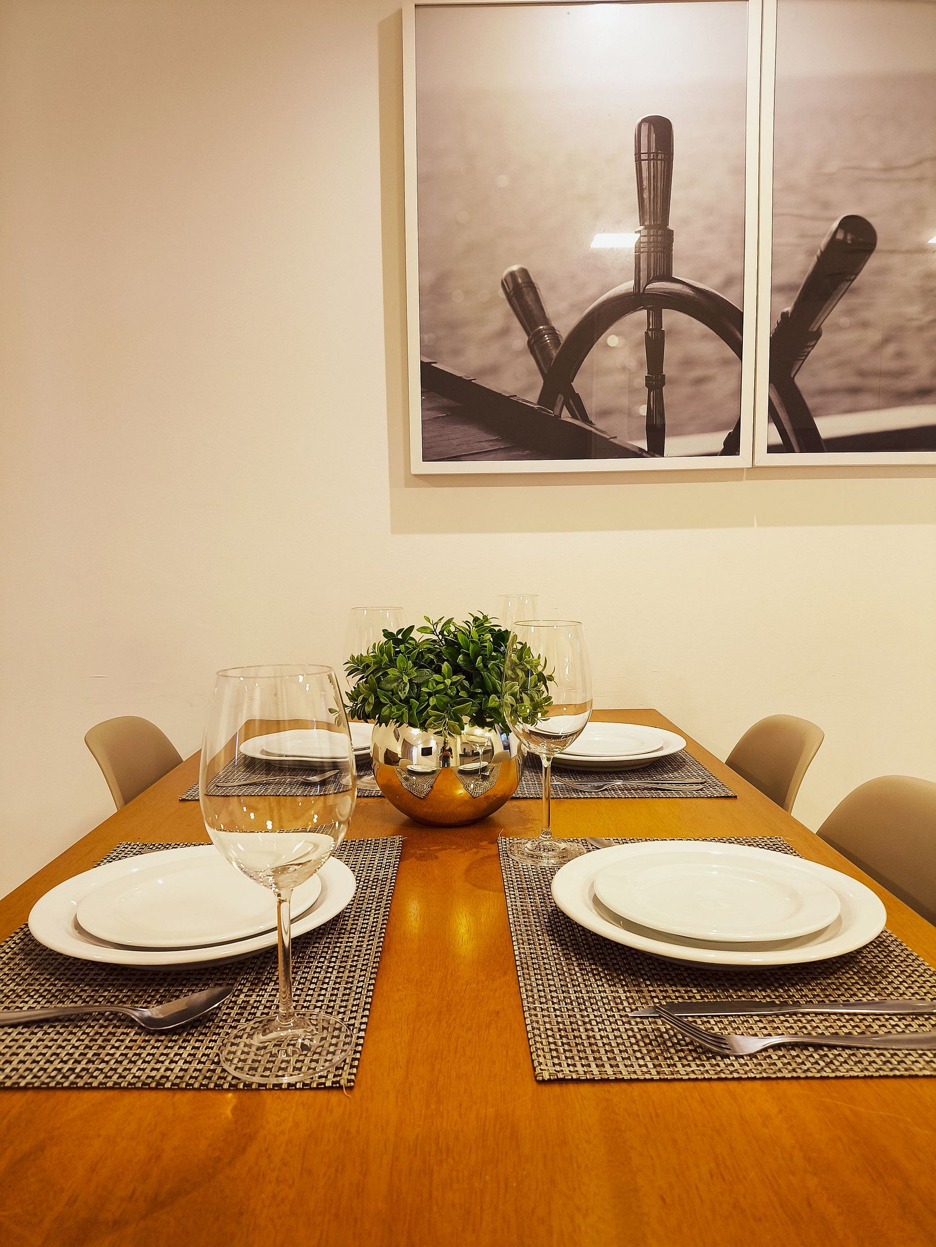 O apartamento possui uma suíte disponível para os hóspedes, com cama queen size, escrivaninha para trabalho. Sala de estar com sofá-cama, smart tv e ar condicionado, mesa com quatro cadeiras, cozinha completa com talheres, potes e panelas. Por fim, um segundo quarto sendo uma semi suíte com cama casal.